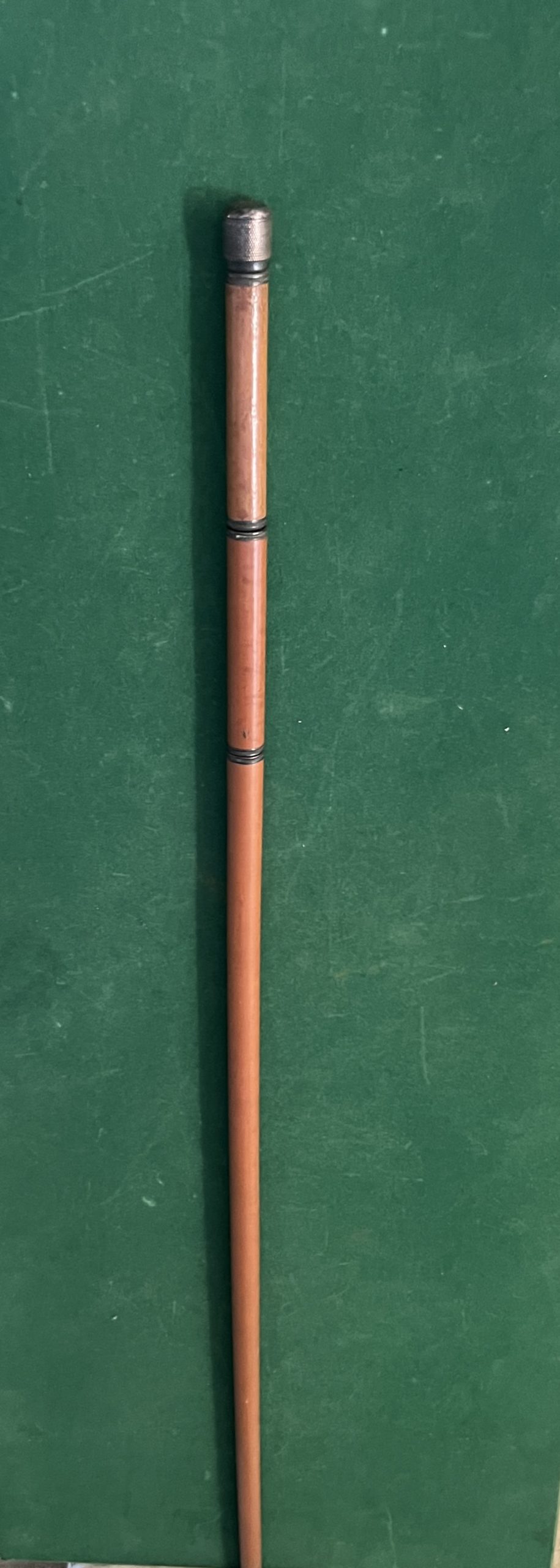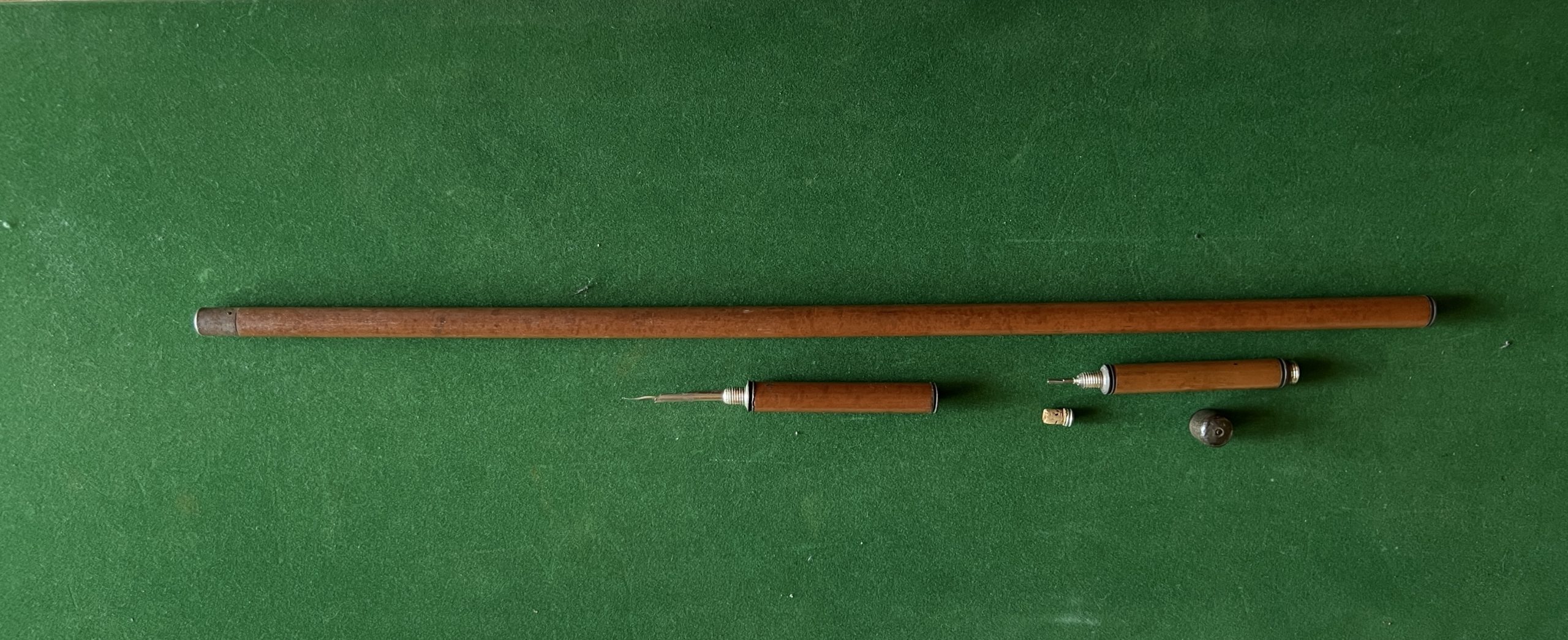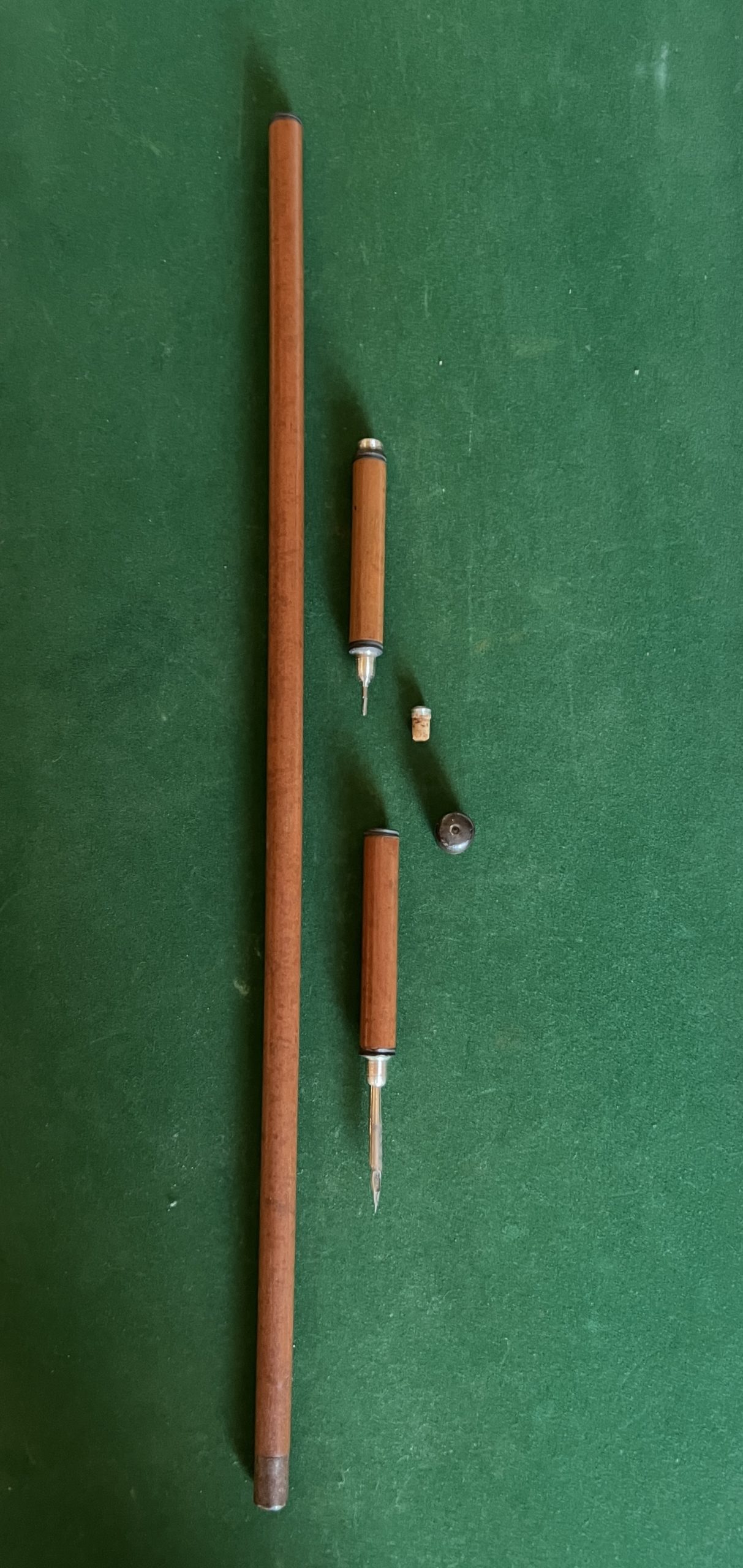 canne de scribe de l’exposition universelle de 1900 - pommeau en cuivre avec vue de Paris - encrier - porte-plume - porte-mine - férule en fer - longueur 88 cm - époque - 1900 -