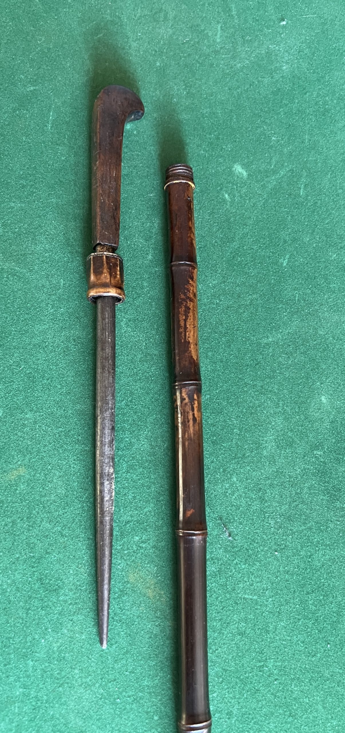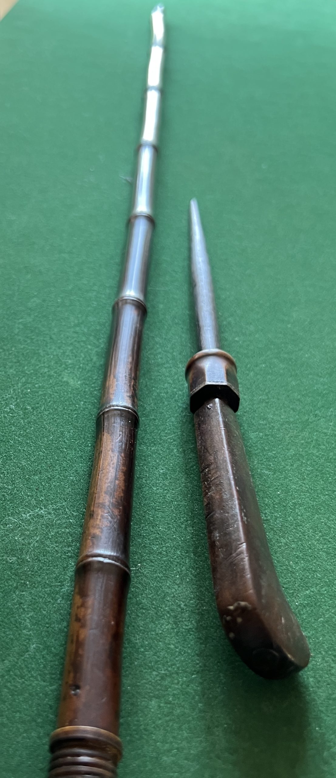 canne populaire pour aiguiser les couteaux - le pommeau en bois dur - le fût en bambou - férule en cuivre - époque 1900 - longueur 90 cm -