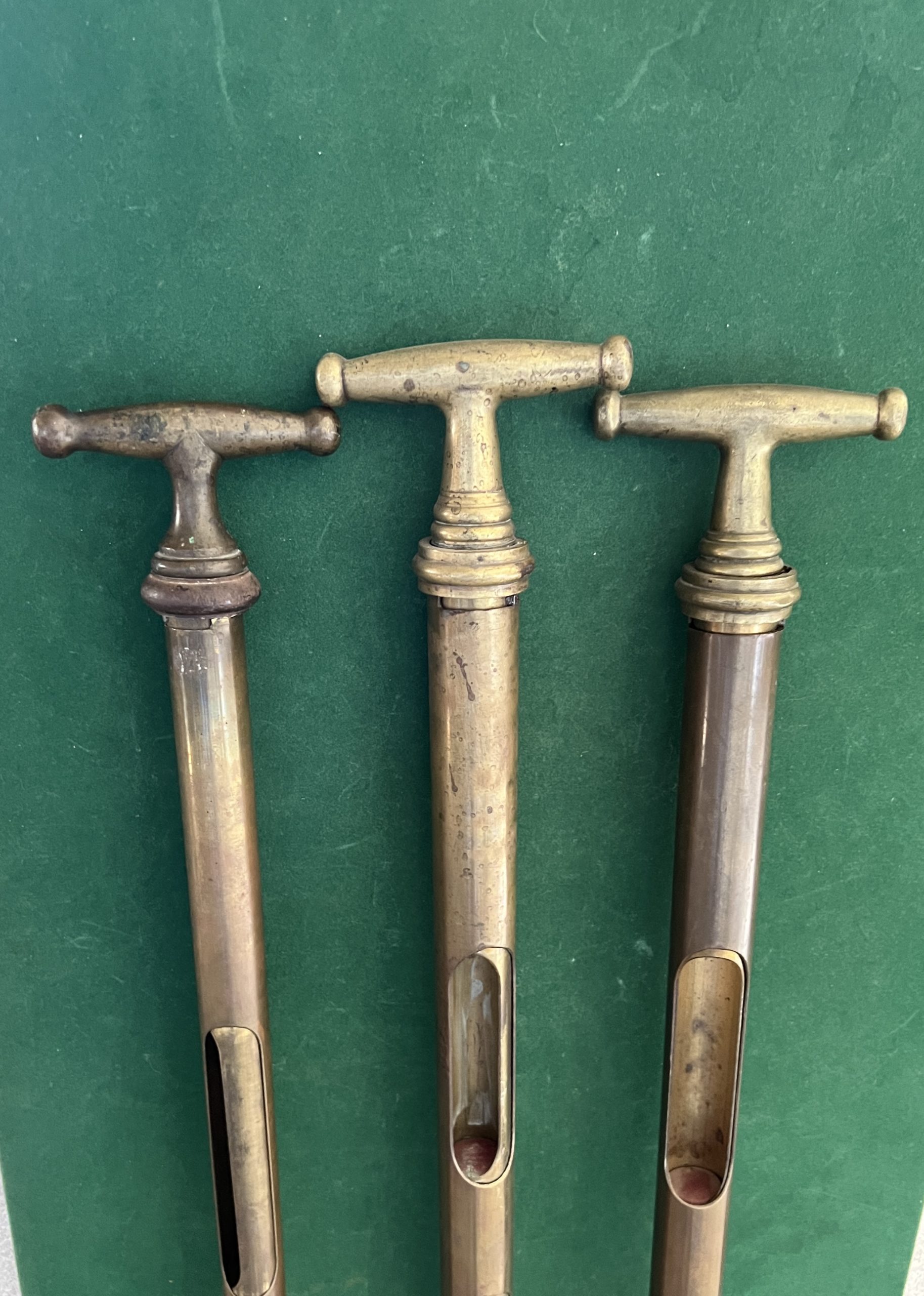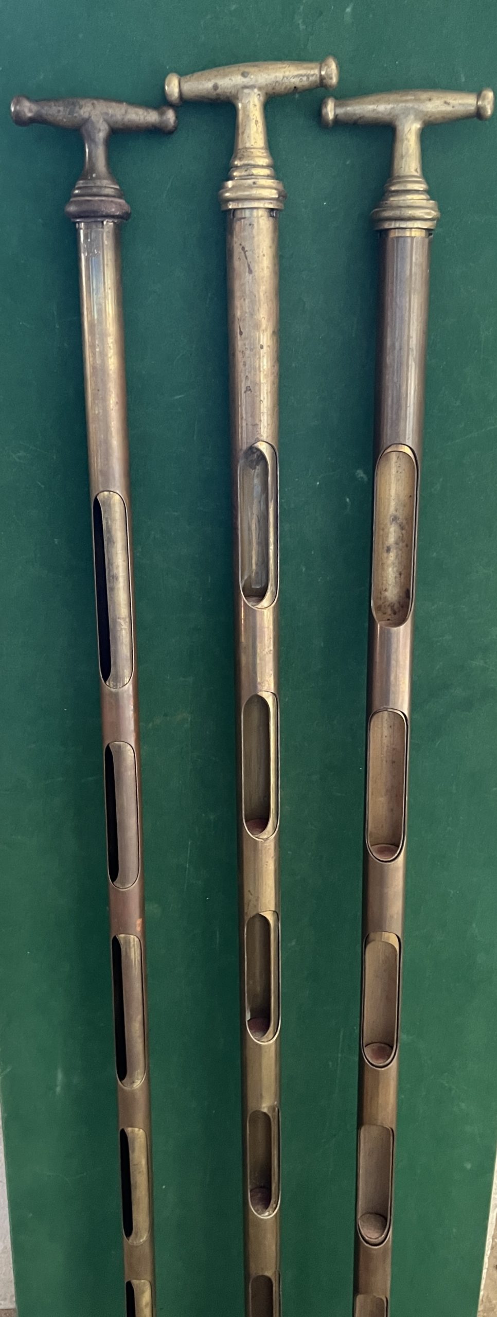 De gauche à droite canne pour le blé - pour l’orge - pour le maïs - elles permettent de vérifier les graines sur toutes la hauteur du scion - elles sont en cuivre - la longueur est de 106 cm - en tournant la poignée les graines sont prises dans la canne cela permet de contrôler le produit
