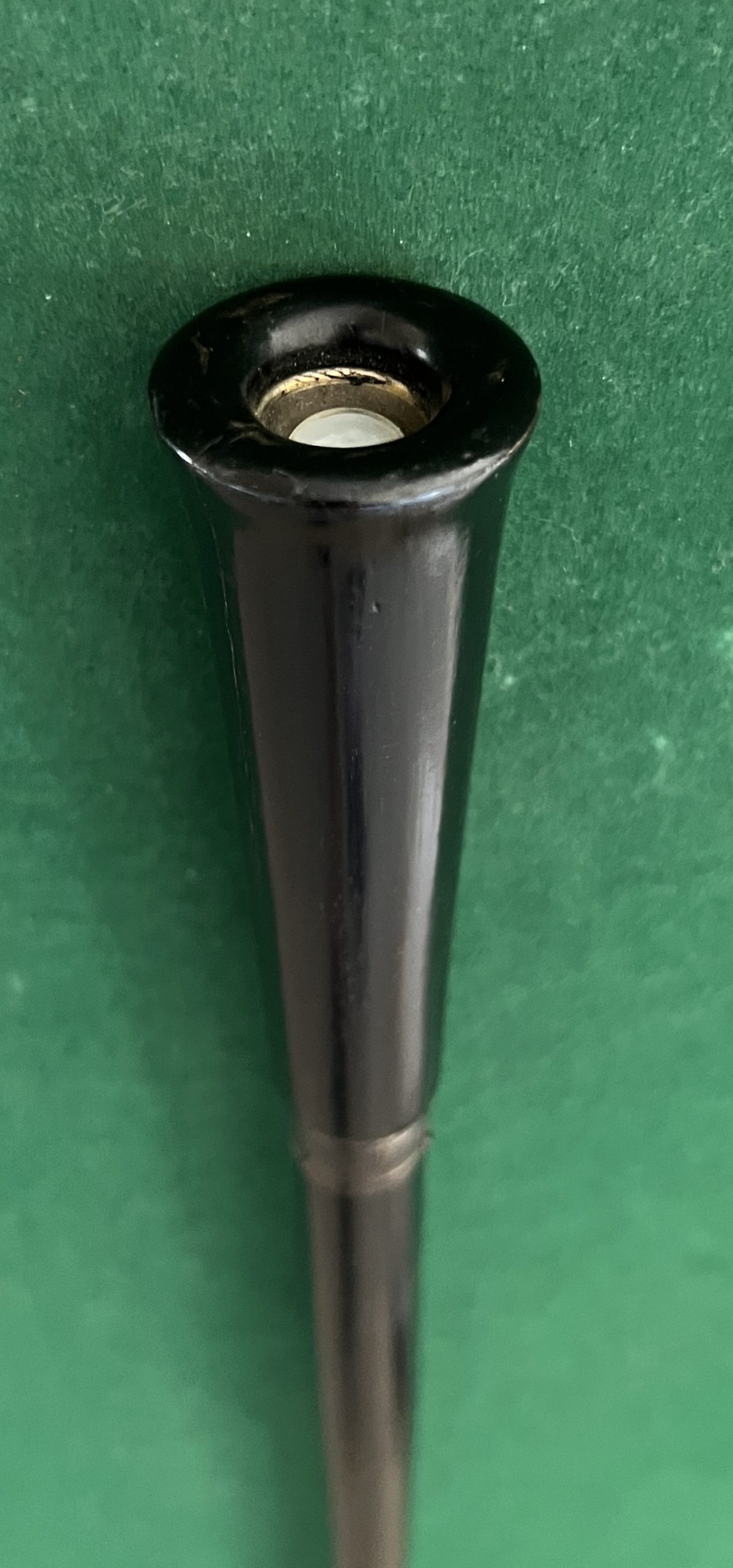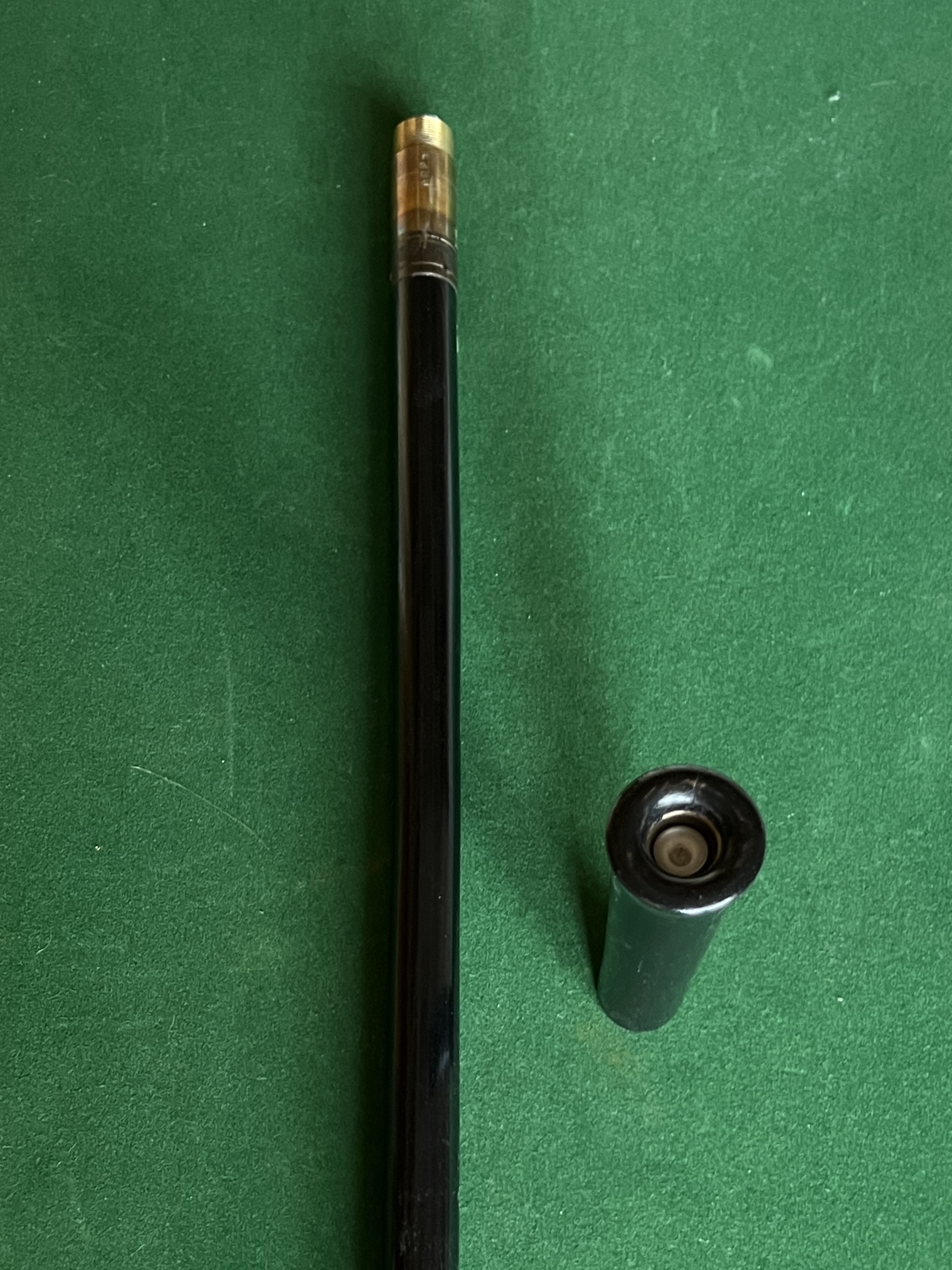 Canne des années 30 - le fut est le pommeau sont en bois noircis - la férule en fer blanc - (à réviser le fonctionnement la canne elle est en très bon état ) - longueur 89 cm/