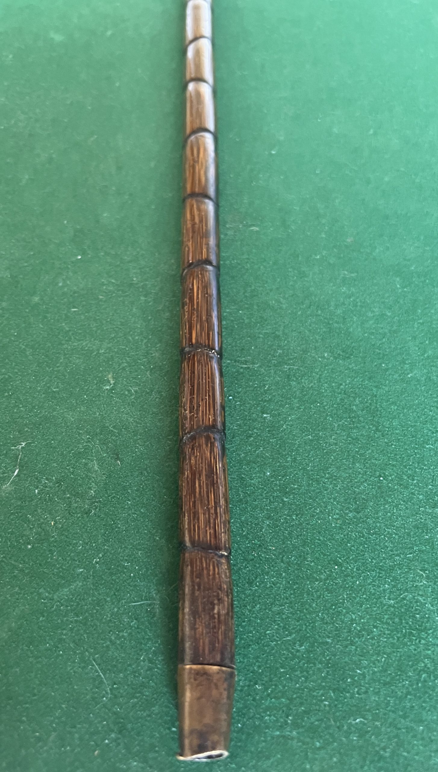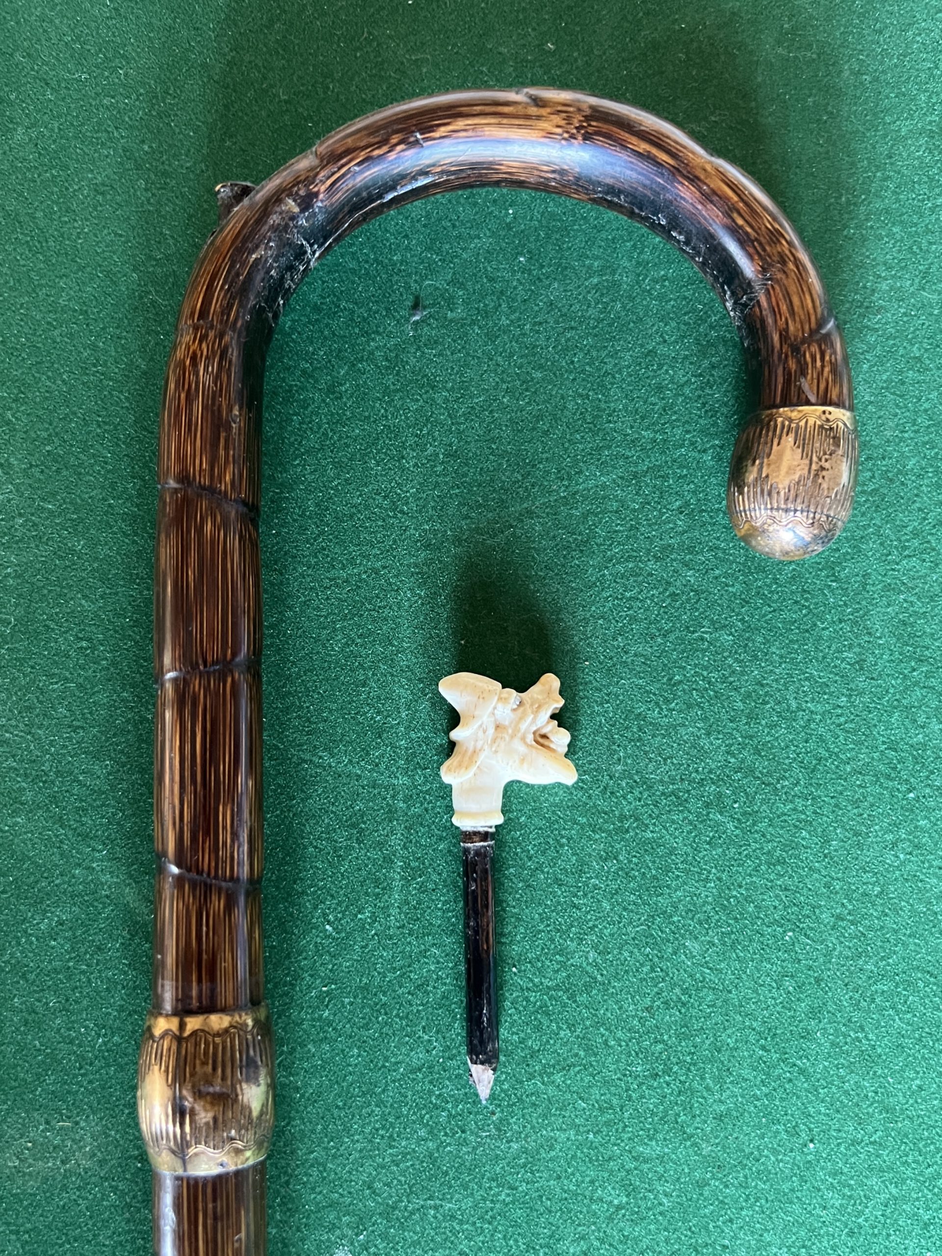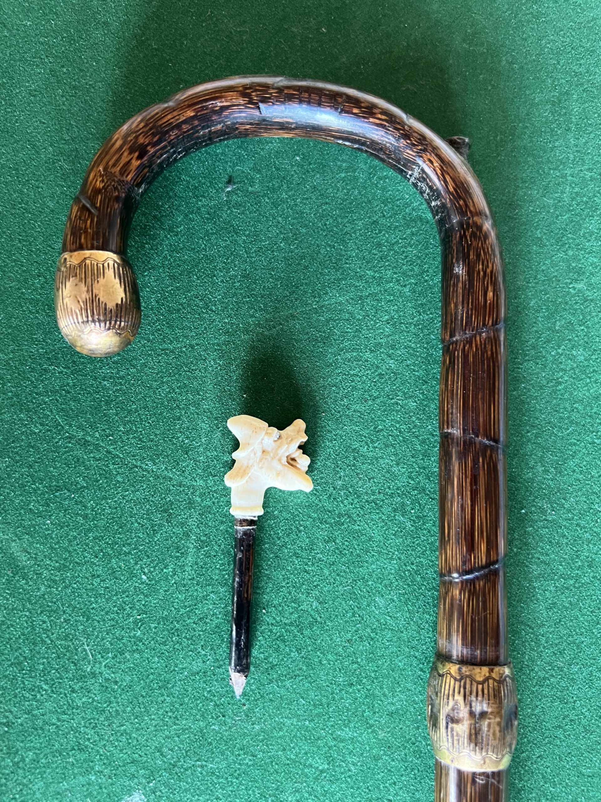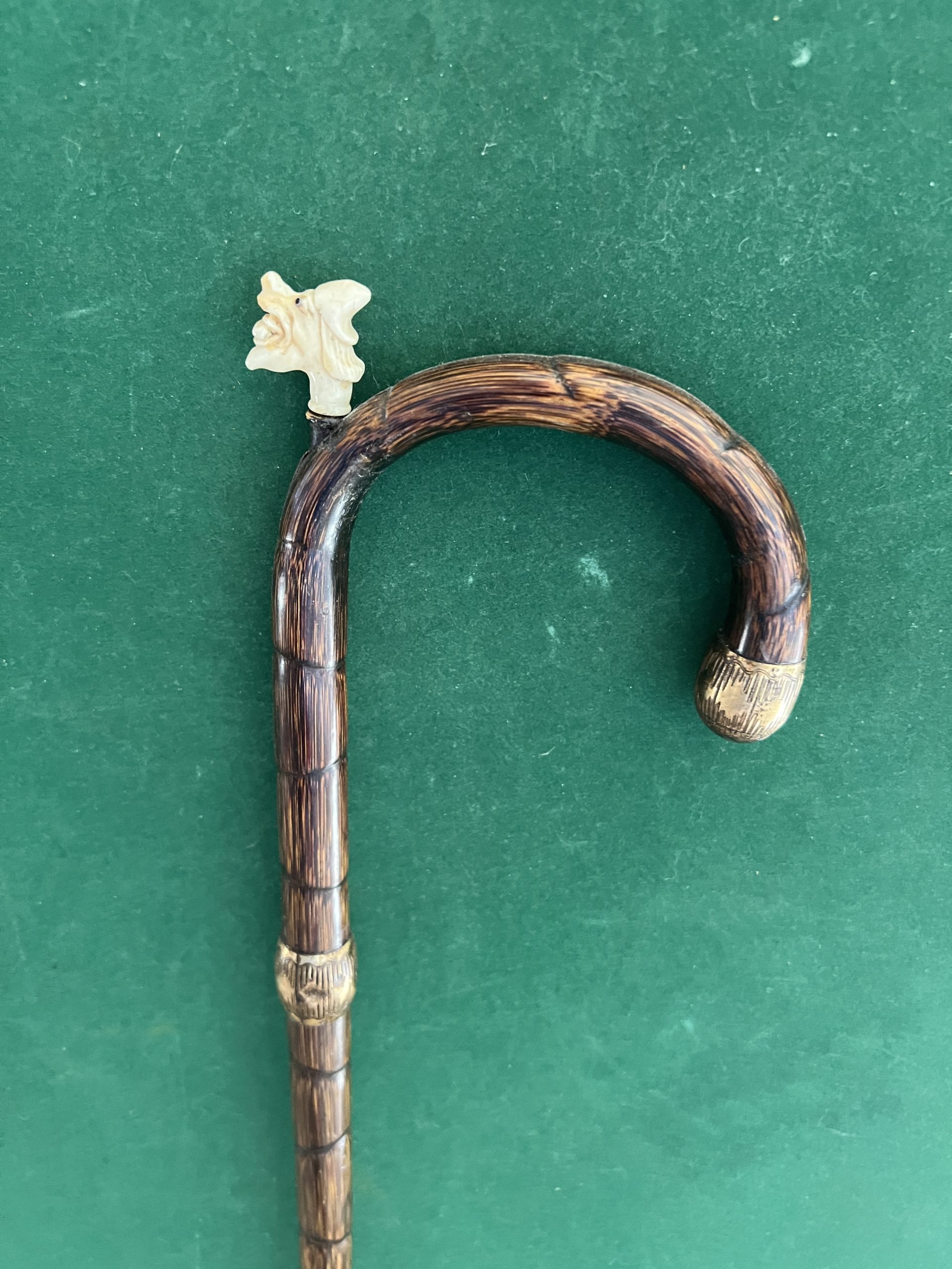 jolie canne corbin en bambou - bague et bout du corbin en cuivre - très beau crayon avec visage grotesque - férule en cuivre - longueur 89 cm - époque fin 19 ieme -