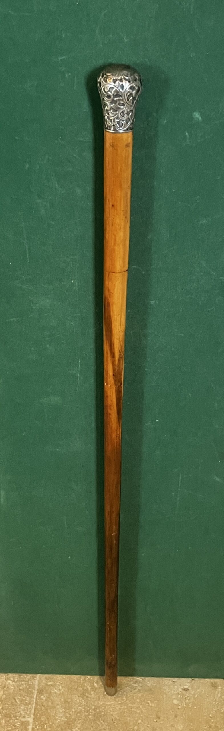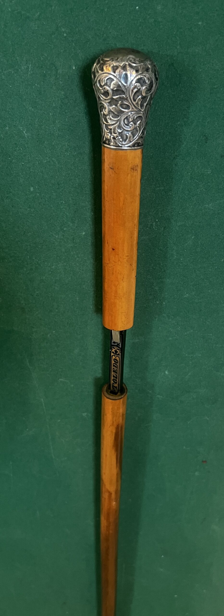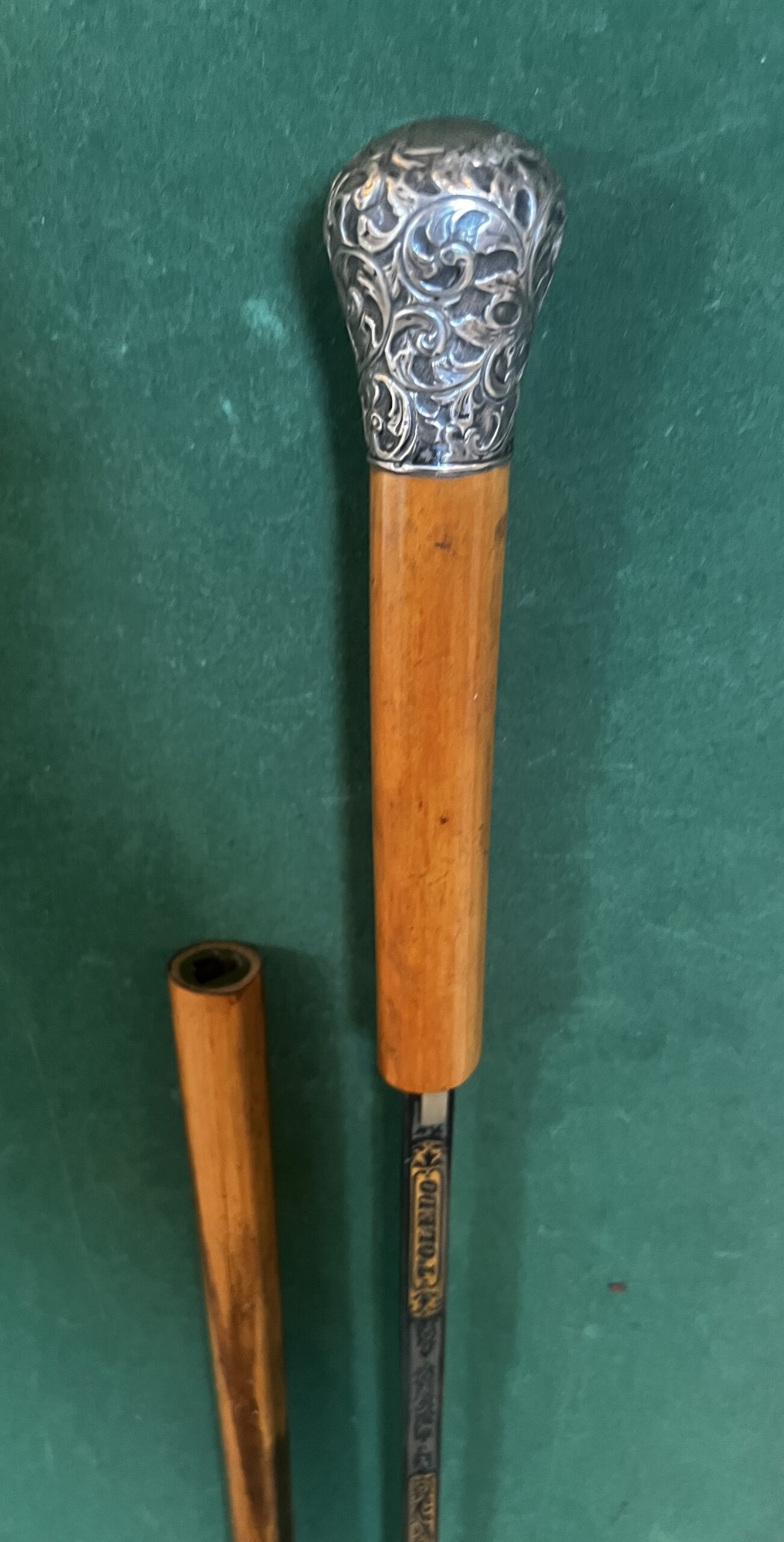 le pommeau en argent décoré de feuilles d’Acanthe - la poignée à quart de tour est dans le même bois que le fût qui  est en malaka - la lame épée dans un état impeccable est richement décoré elle mesure 69 cm - la férule est en fer blanc avec talon en acier - la longueur est de 89. cm - époque dix-neuvième siècle -