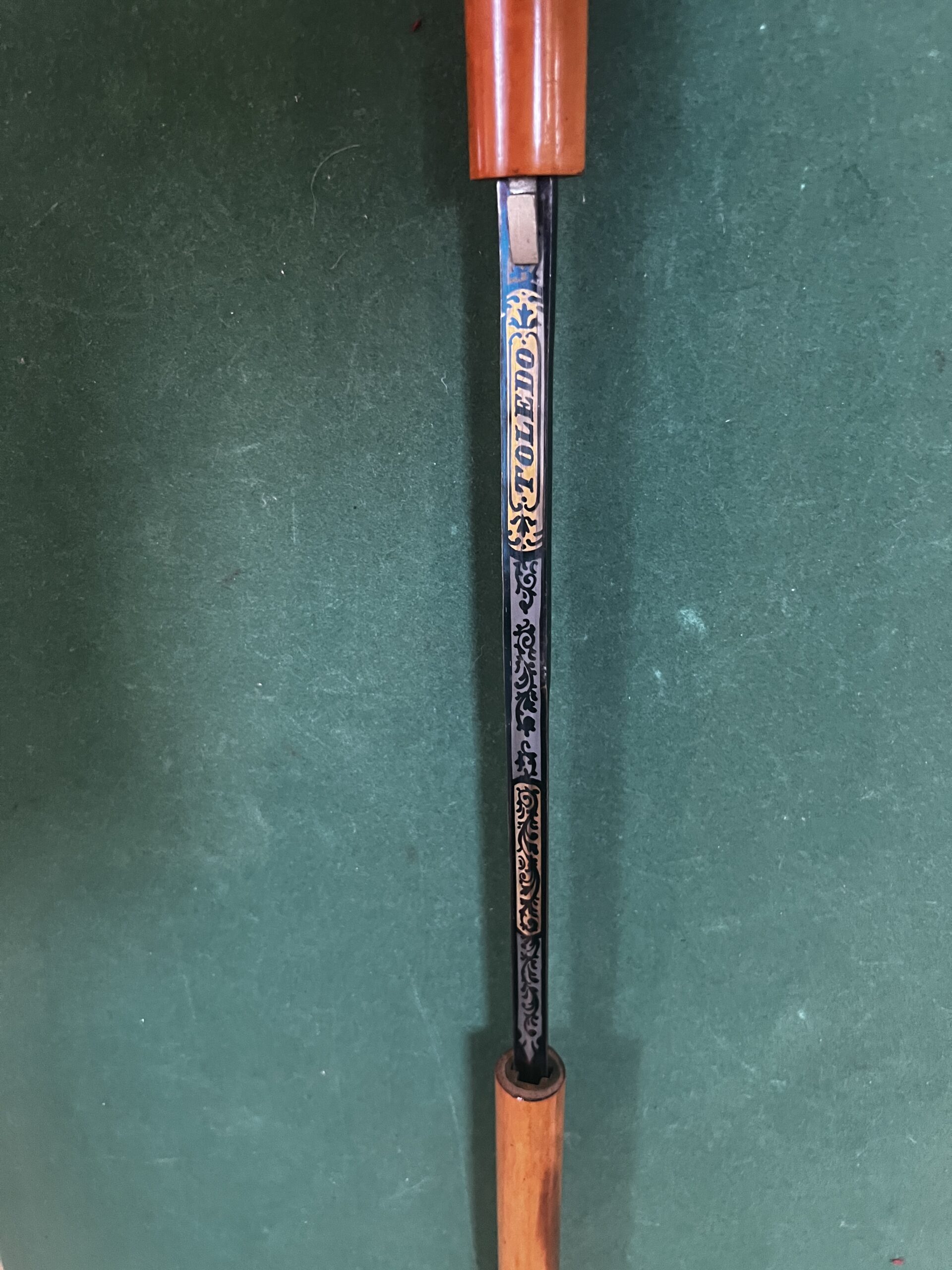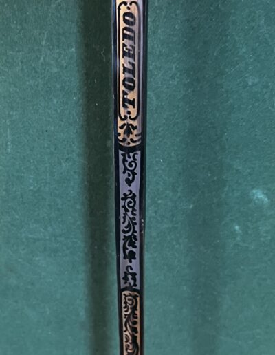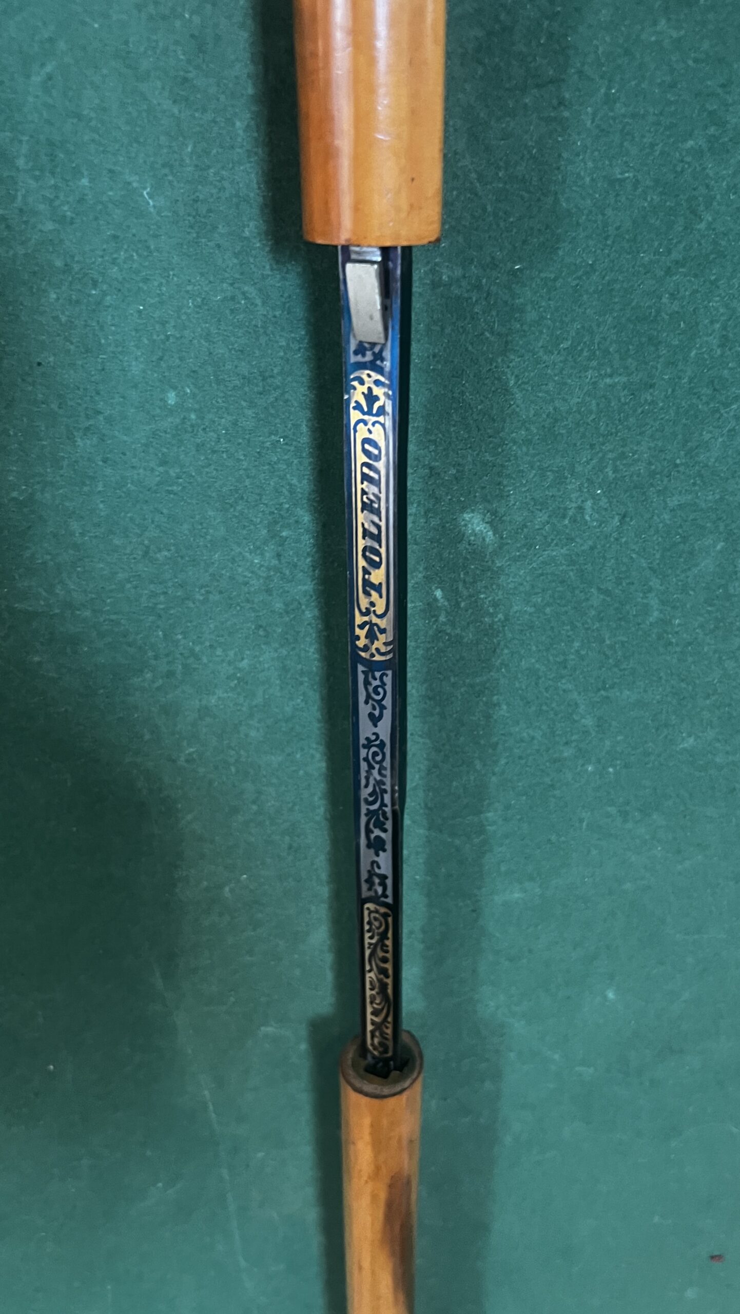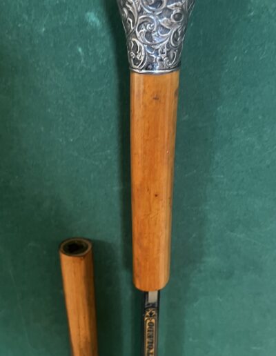 le pommeau en argent décoré de feuilles d’Acanthe - la poignée à quart de tour est dans le même bois que le fût qui  est en malaka - la lame épée dans un état impeccable est richement décoré elle mesure 69 cm - la férule est en fer blanc avec talon en acier - la longueur est de 89. cm - époque dix-neuvième siècle -