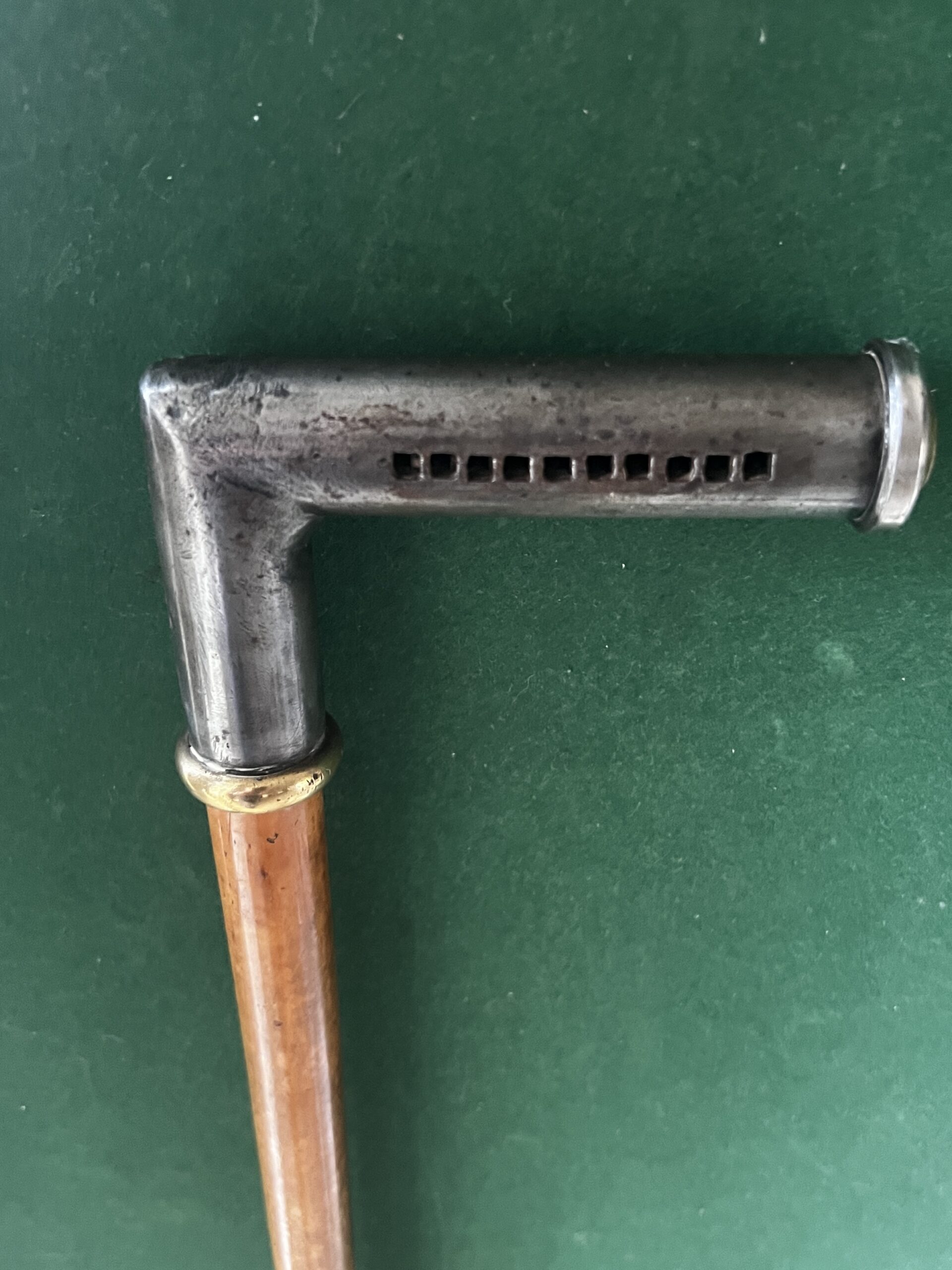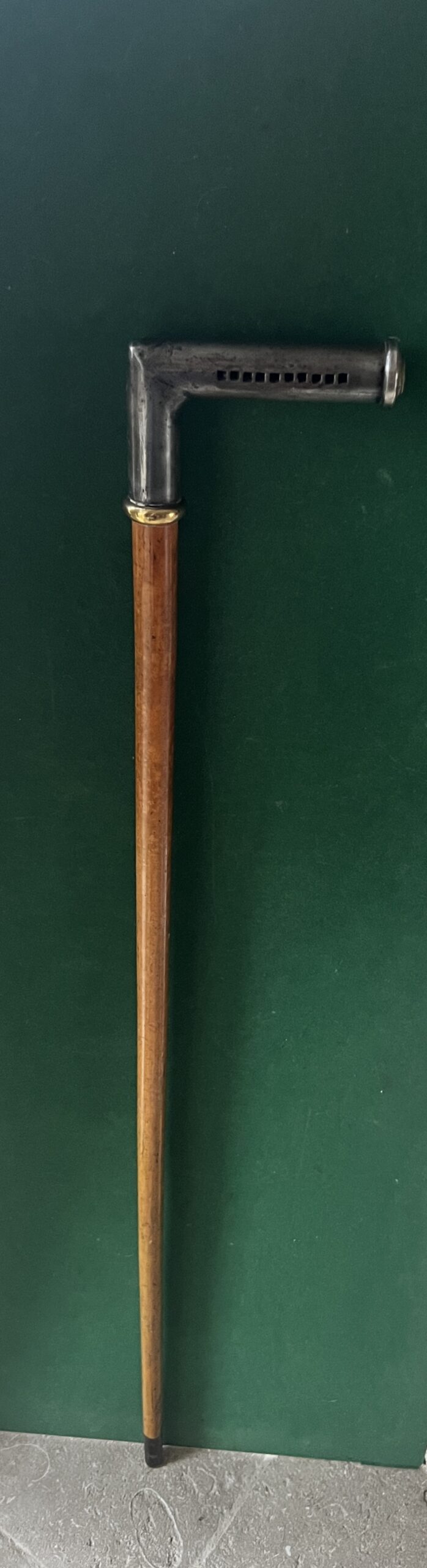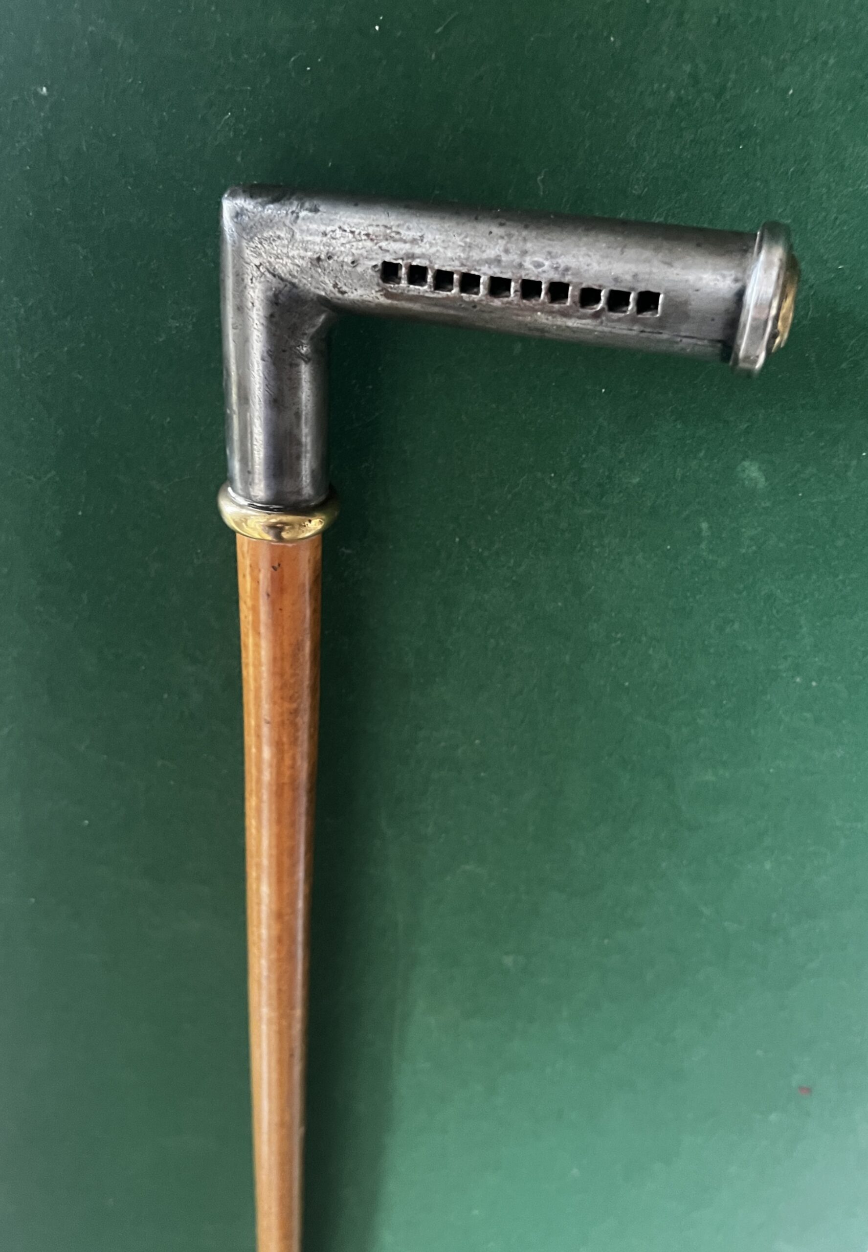 La poignée équerre en acier est l’harmonica - la bague est en métal doré - le fût est en malaka - la férule en bois dur - la longueur est de 91 cm - époque première partie du vingtième siècle