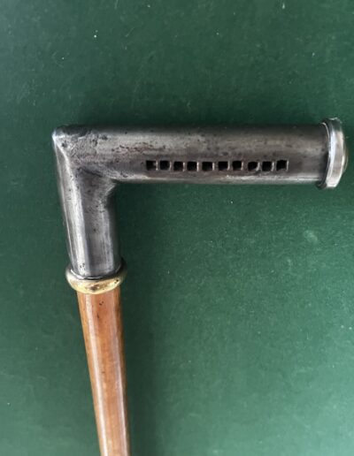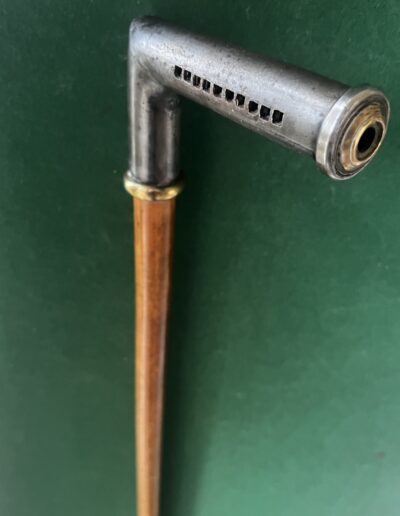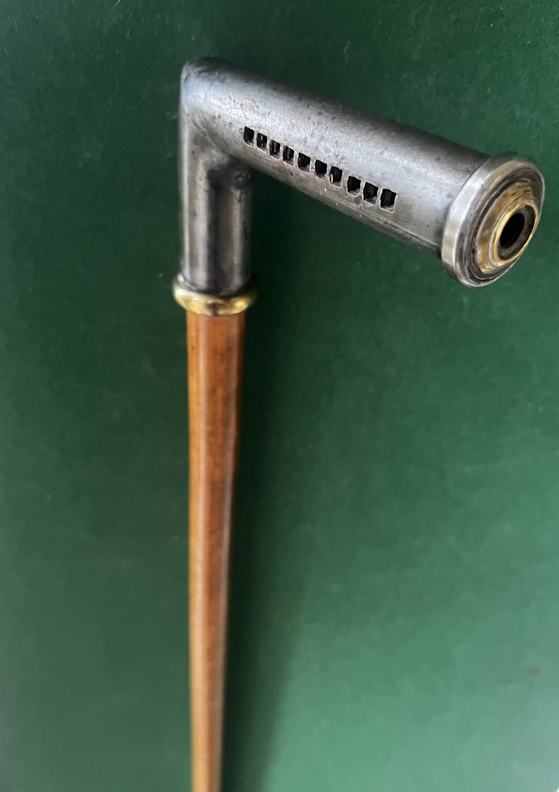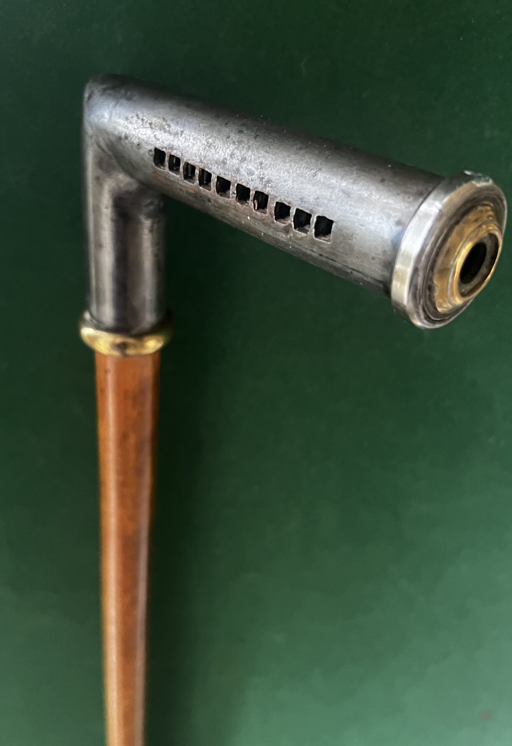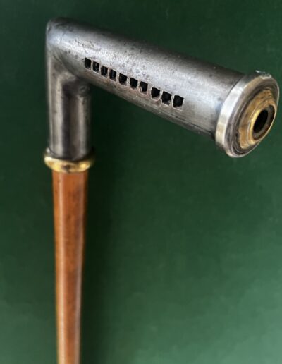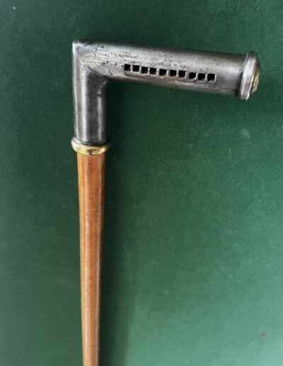 La poignée équerre en acier est l’harmonica - la bague est en métal doré - le fût est en malaka - la férule en bois dur - la longueur est de 91 cm - époque première partie du vingtième siècle