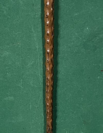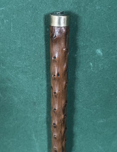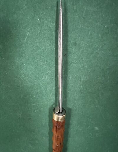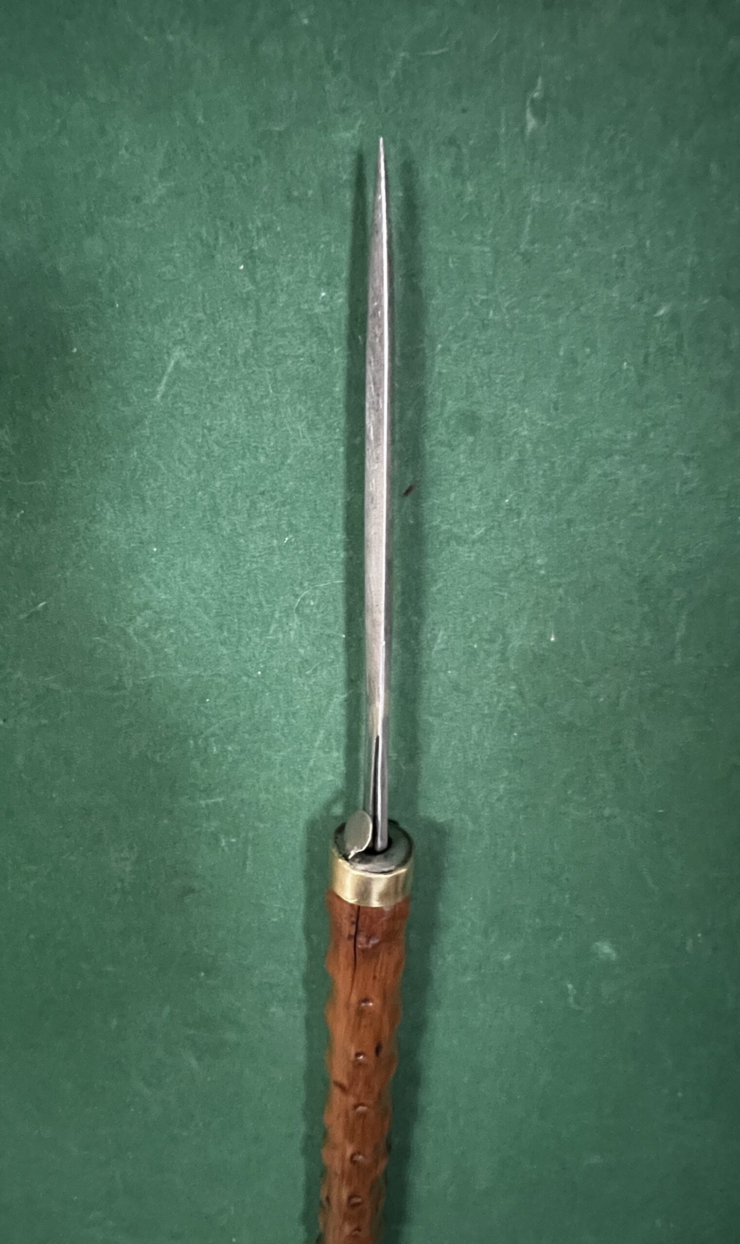 Canne à système de défense appelée stiletto ou canne dard - le pommeau est en cuivre avec le dessus en fer qui cache la lame - le fût est en néflier - la férule en cuivre et talon en acier - la longueur est de 90 cm - époque dix-neuvième -