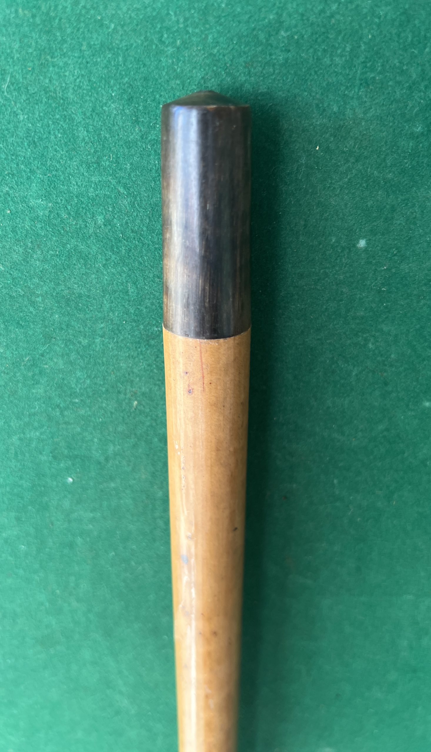 Le pommeau est en bois polychrome - la bague est en corne blonde - le fût en malaka - la férule en corne noire - la longueur est de 96 cm - époque fin 19 ieme