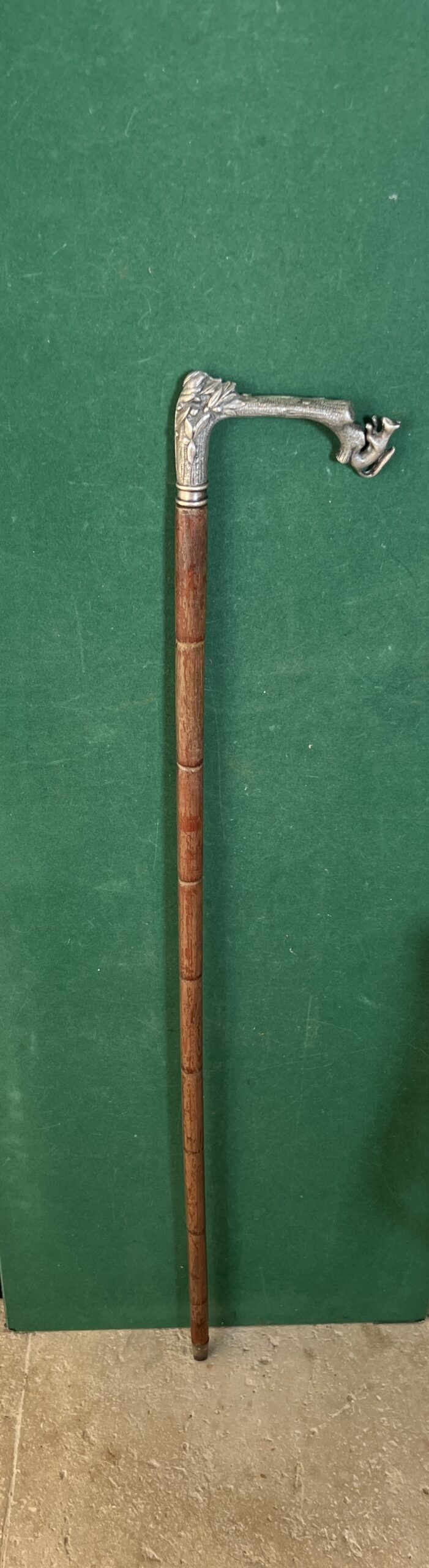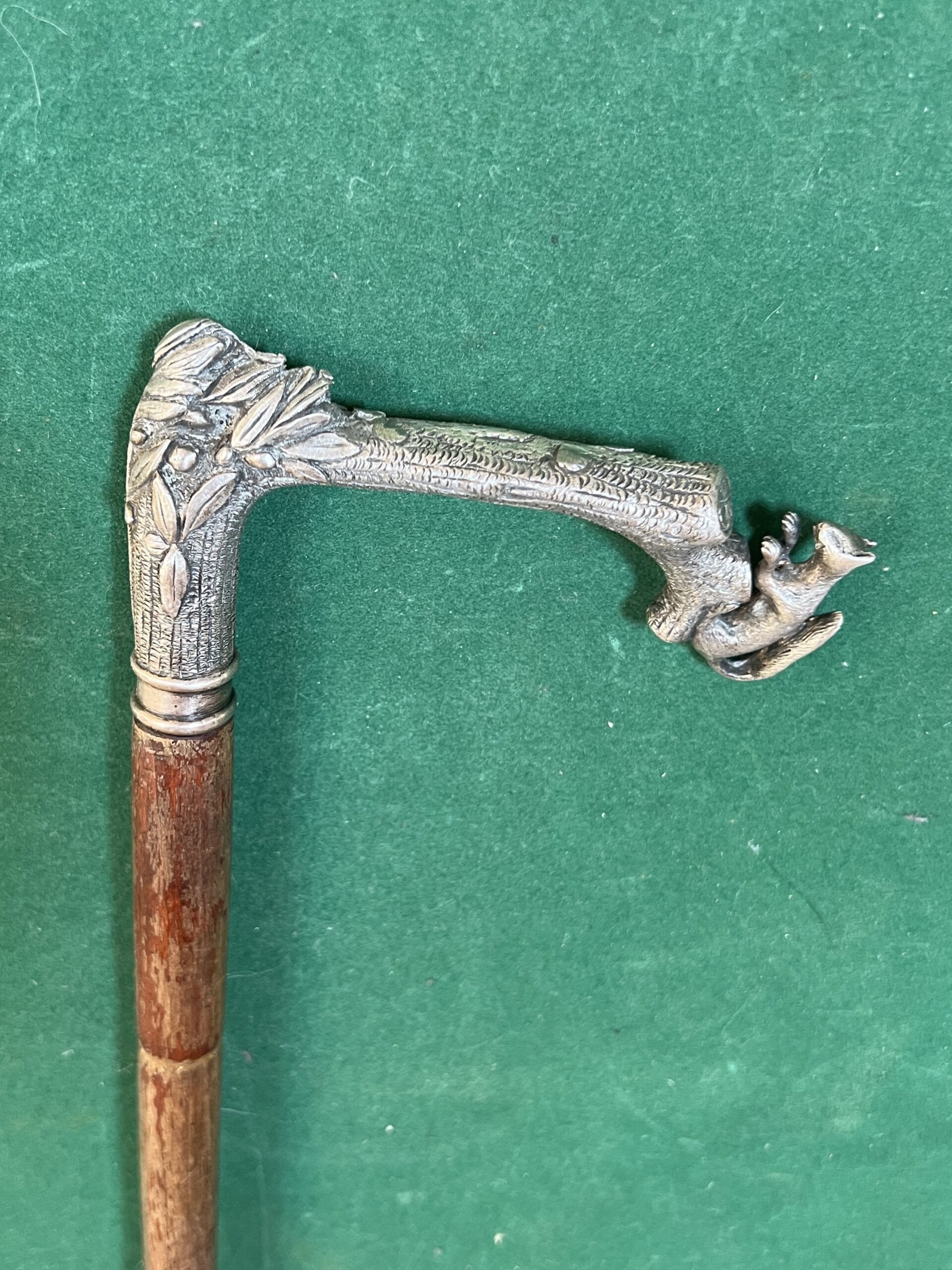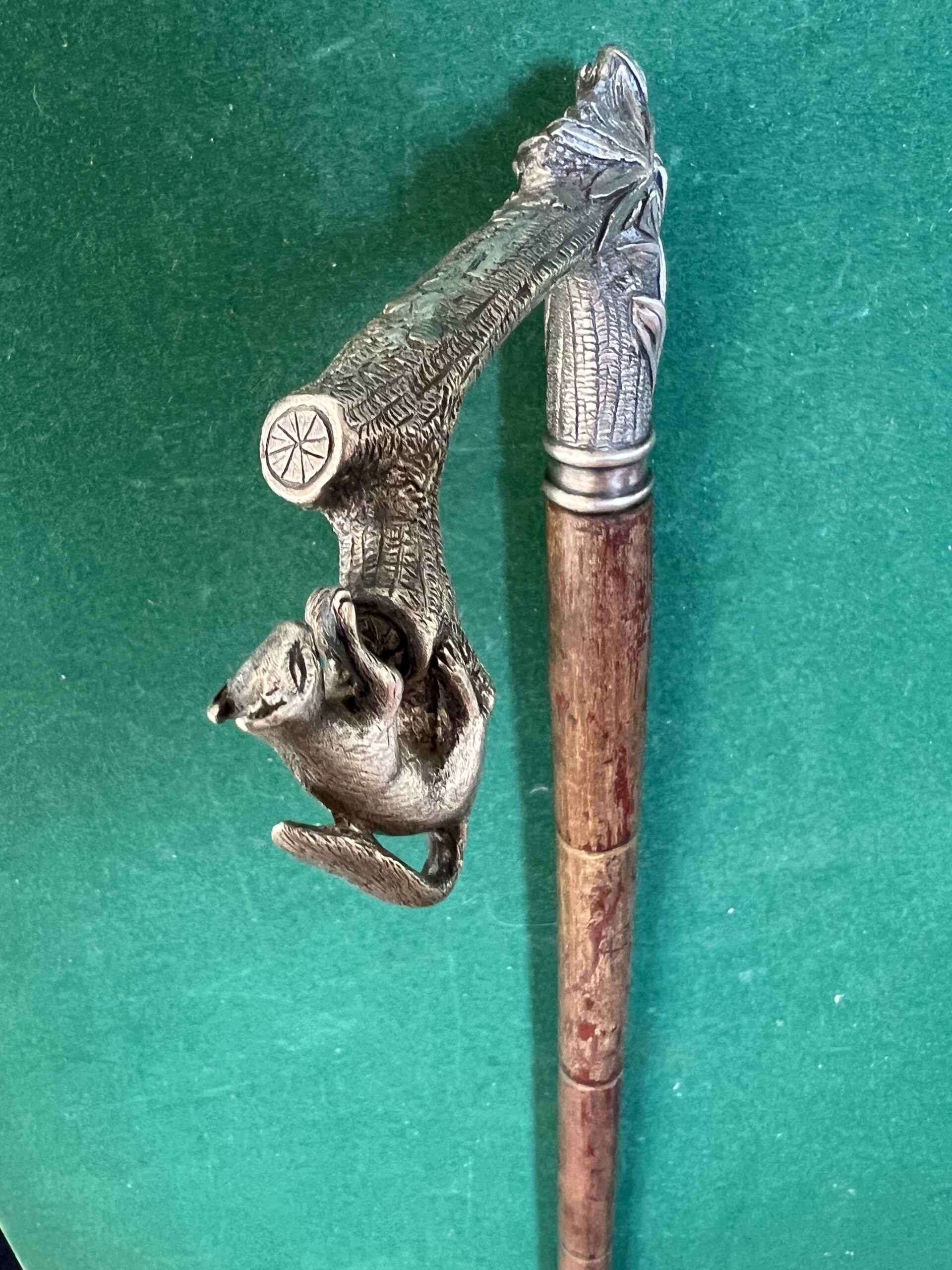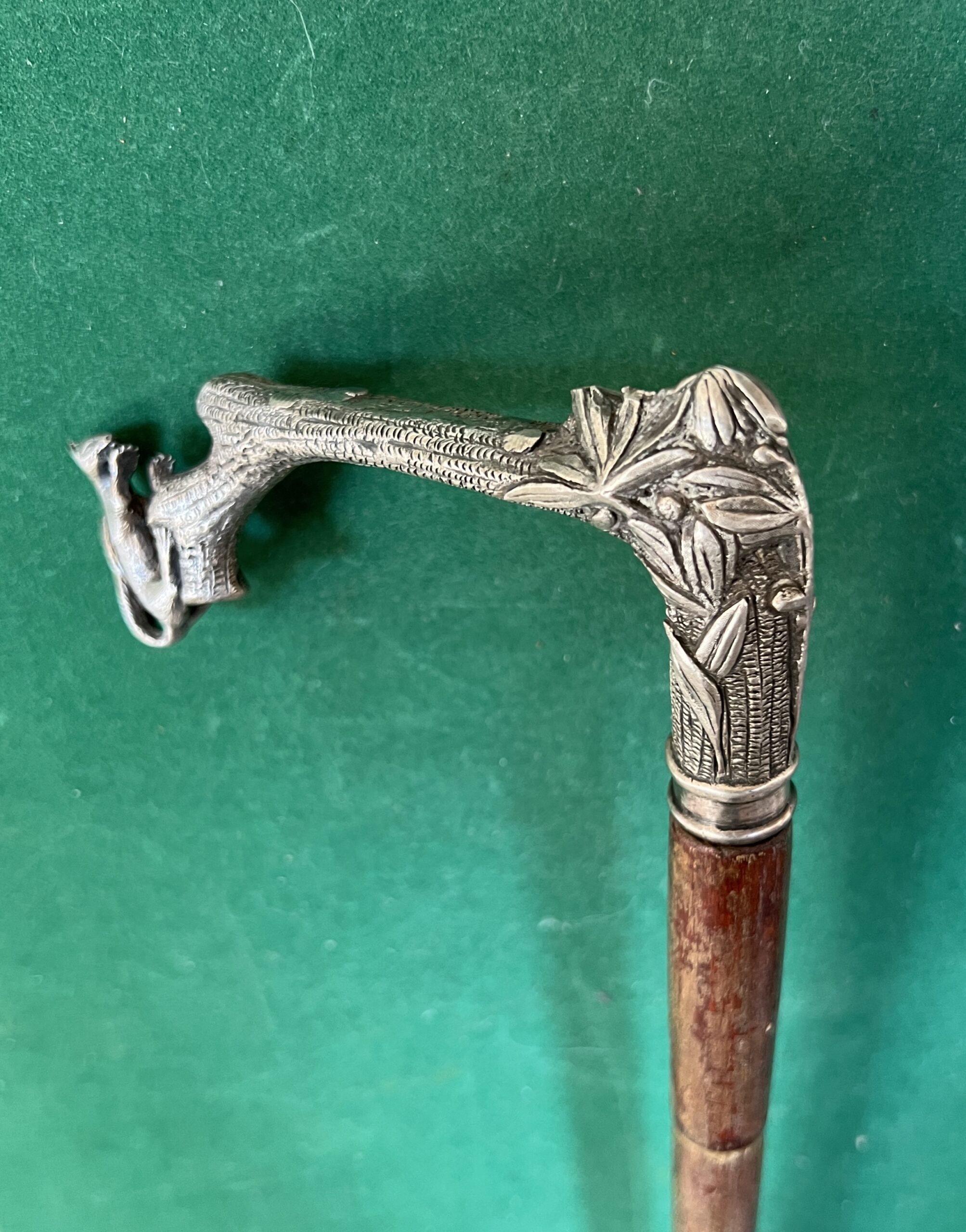 Le pommeau est en bronze argenté il représente une branche avec des feuilles et sur le bout un écureuil - la bague est d’un seul tenant avec la poignée - le fût est en bambou - la férule est en cuivre et acier - la longueur est de 89 cm - époque fin 19 ieme -