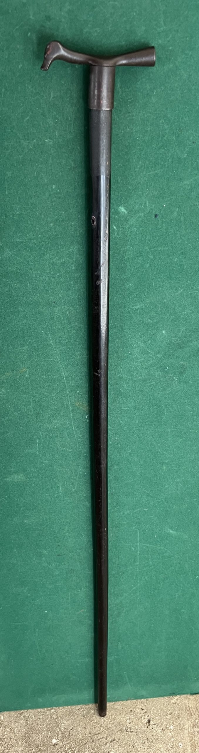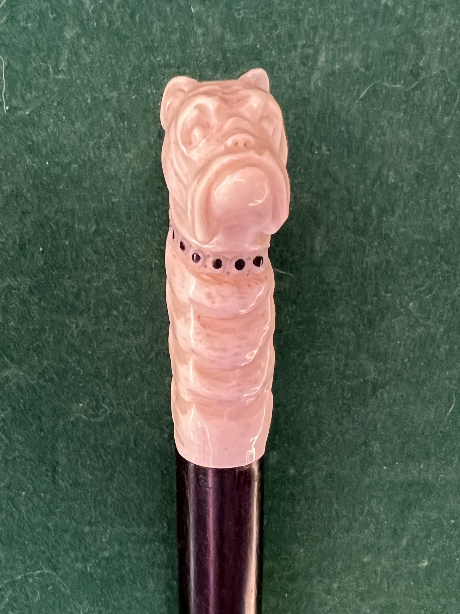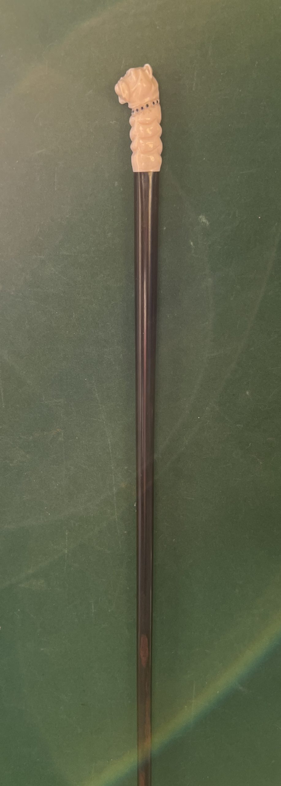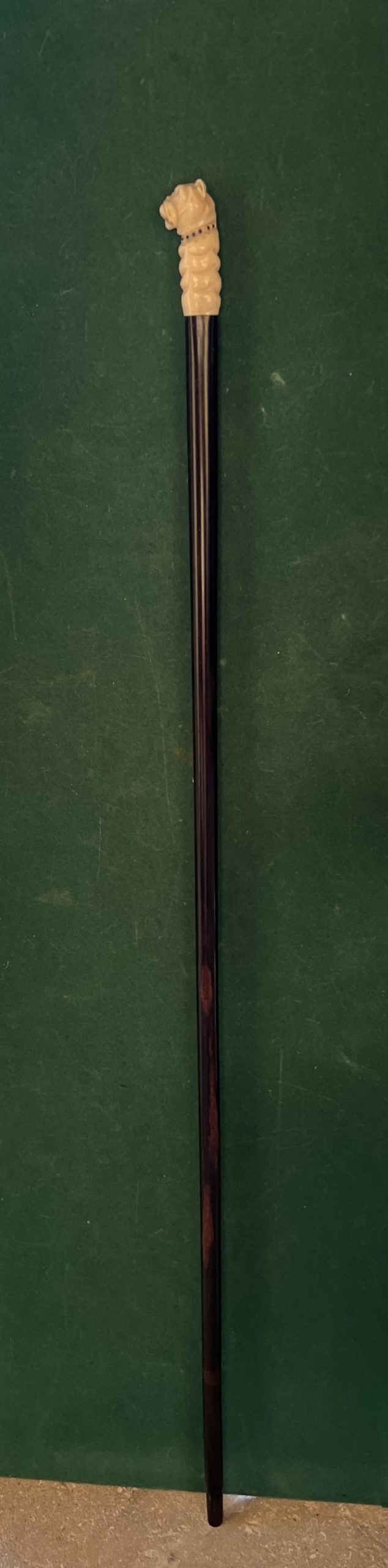 Le pommeau en ivoire représente un bouledogue - le fût de jolie qualité est en palissandre - la férule est en corne noire - la longueur est de 94 cm - époque deuxième partie du 19 ieme -