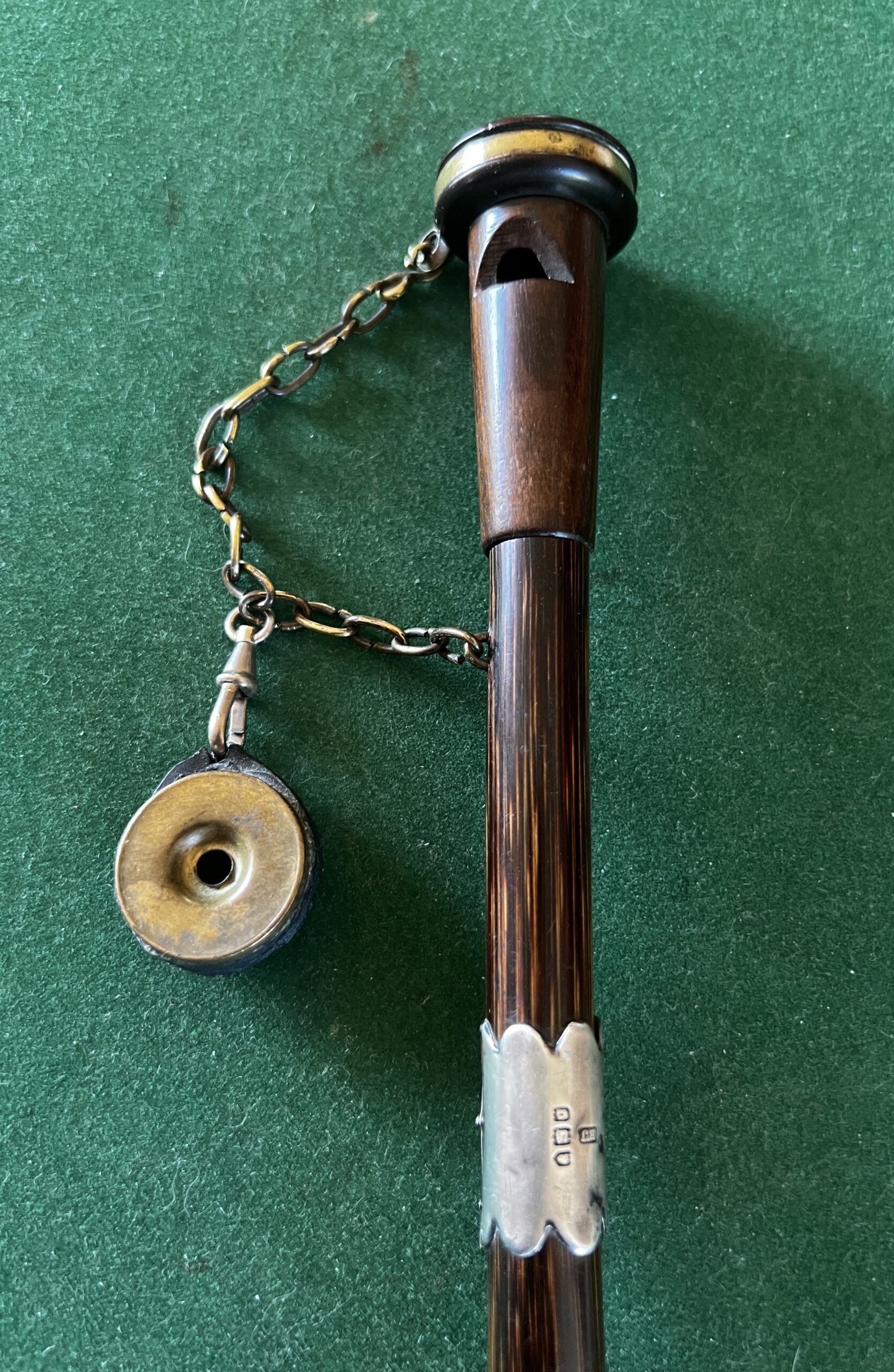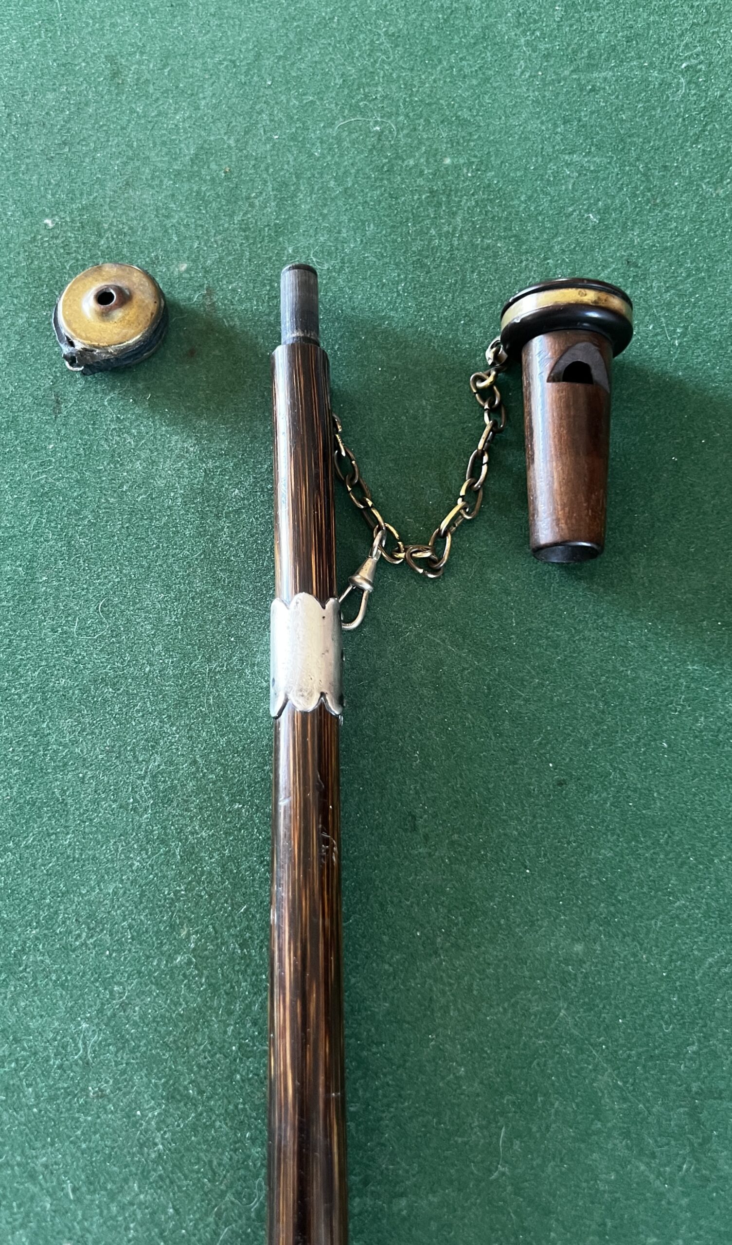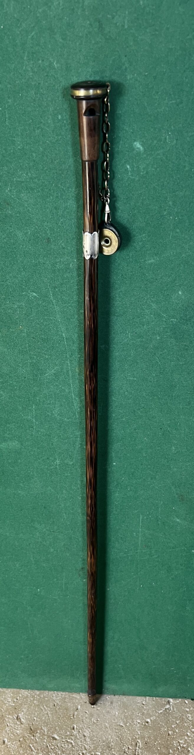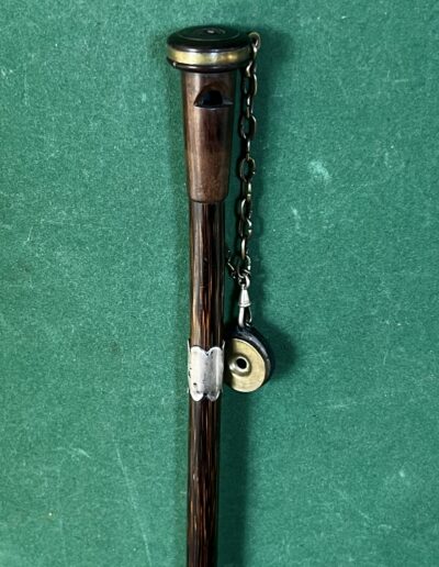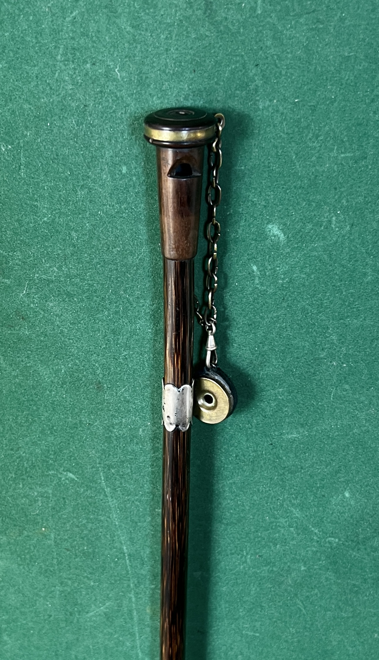 le pommeau en noyer et laiton est un appelant - une chaîne le relie à un deuxième appeau - la bague est en argent - le fût est en laurier - sûrement canne Anglaise - la férule est en cuivre avec talon en acier - époque dix-neuvième la longueur est de 90 cm -