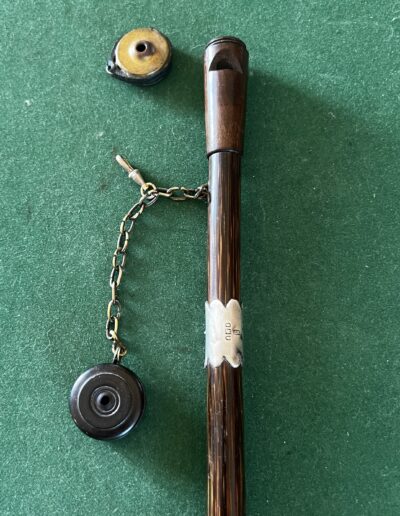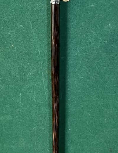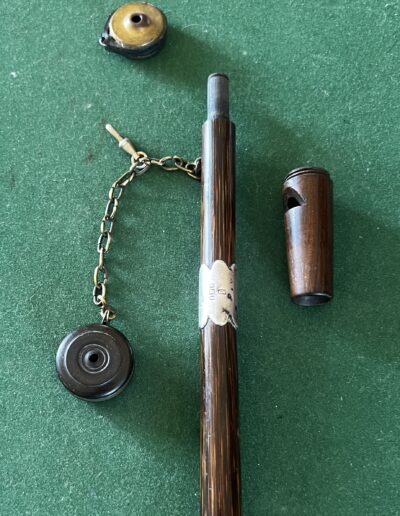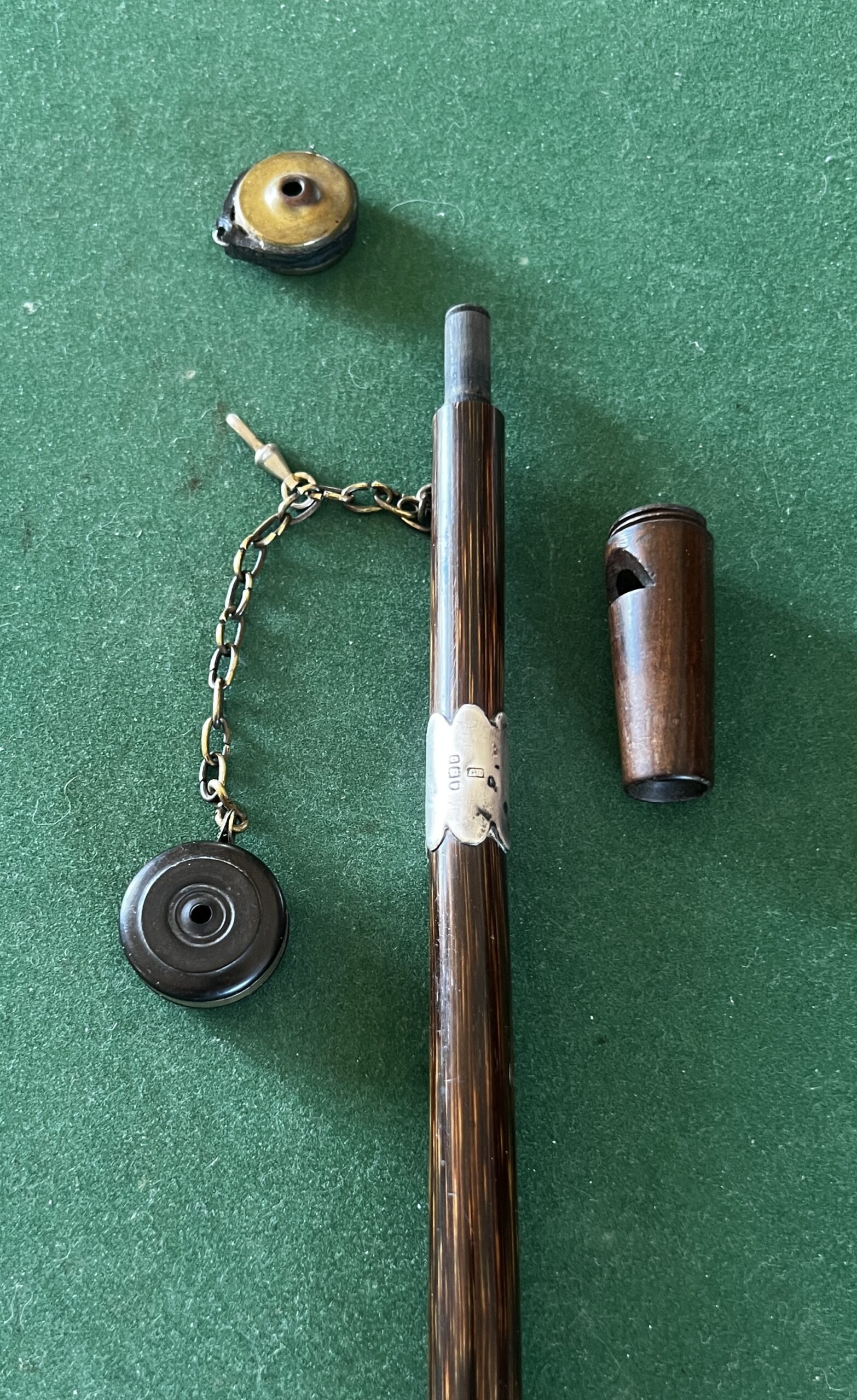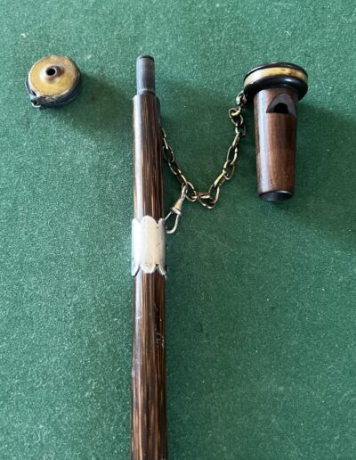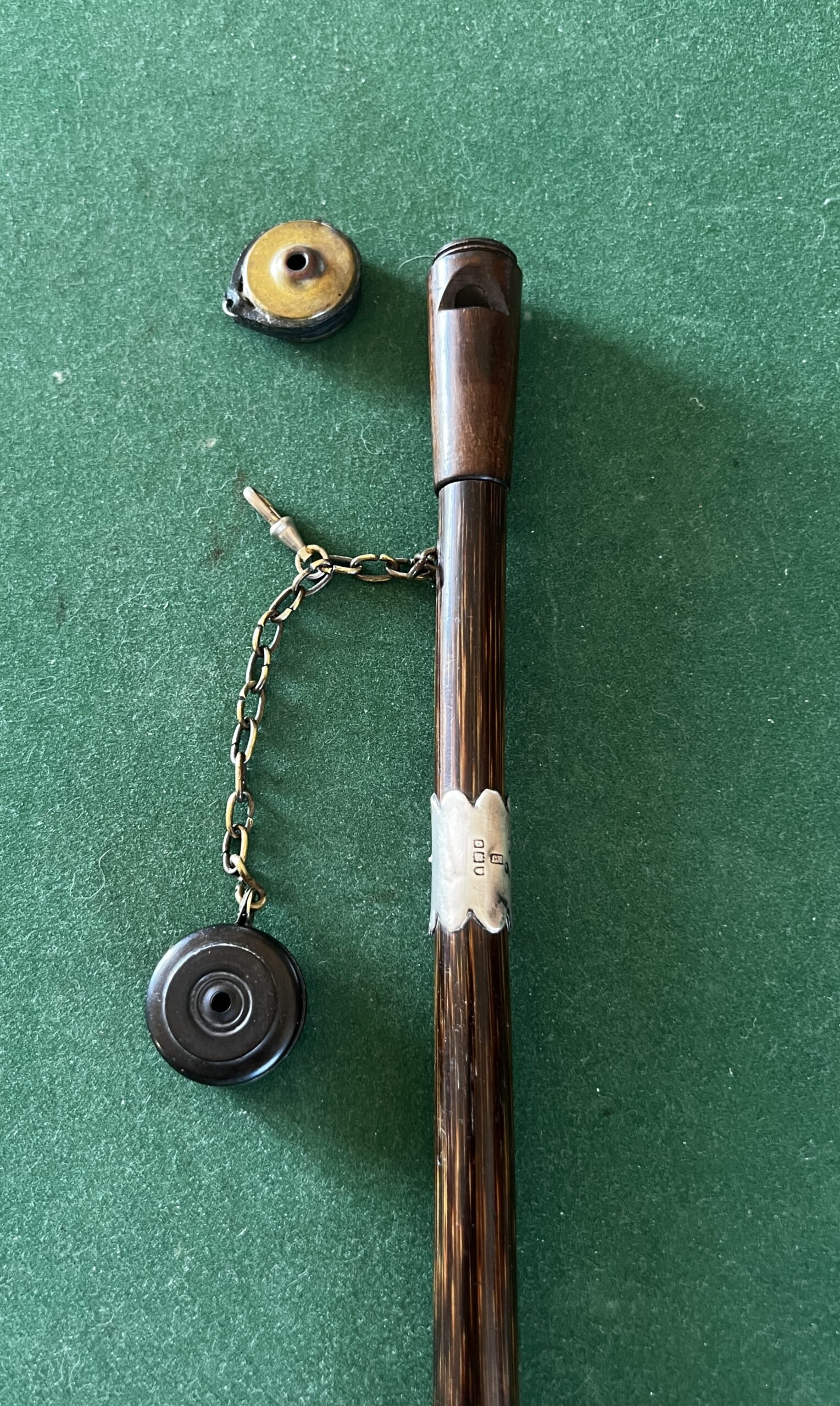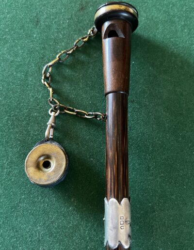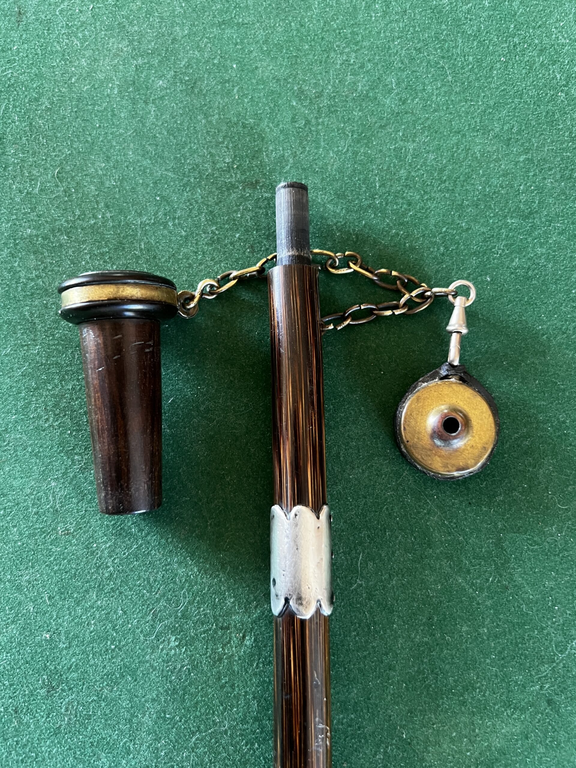 le pommeau en noyer et laiton est un appelant - une chaîne le relie à un deuxième appeau - la bague est en argent - le fût est en laurier - sûrement canne Anglaise - la férule est en cuivre avec talon en acier - époque dix-neuvième la longueur est de 90 cm -