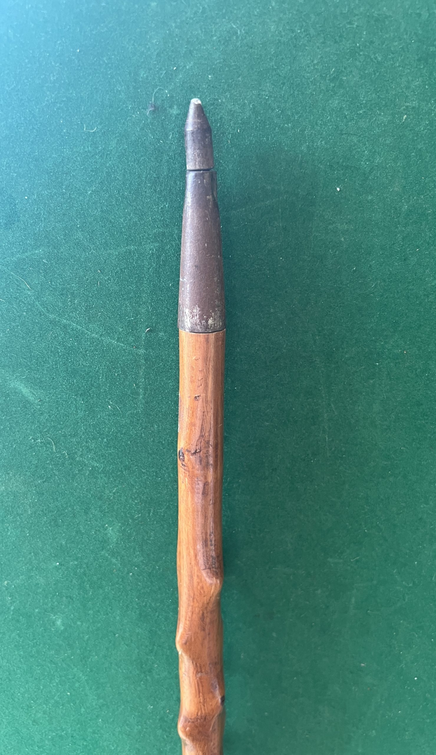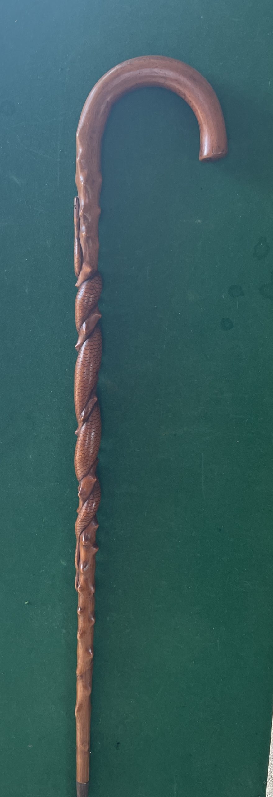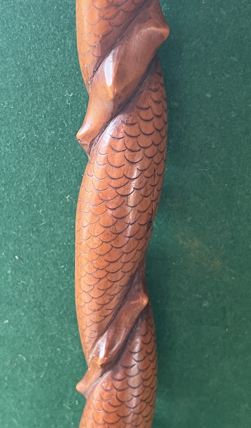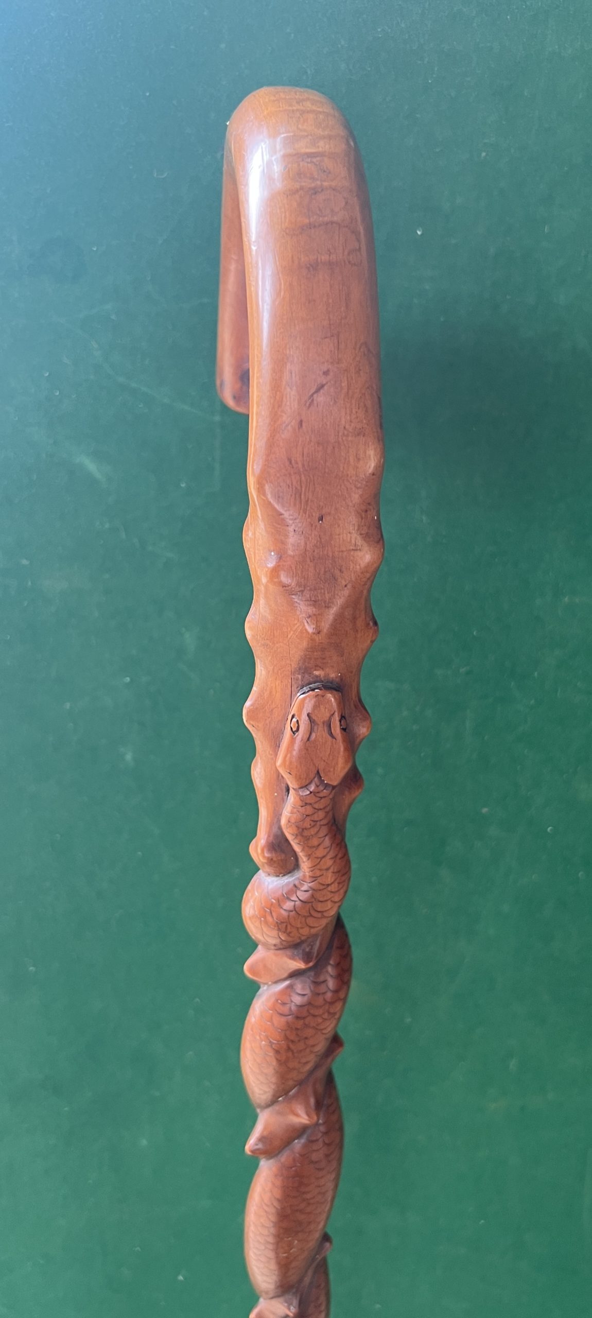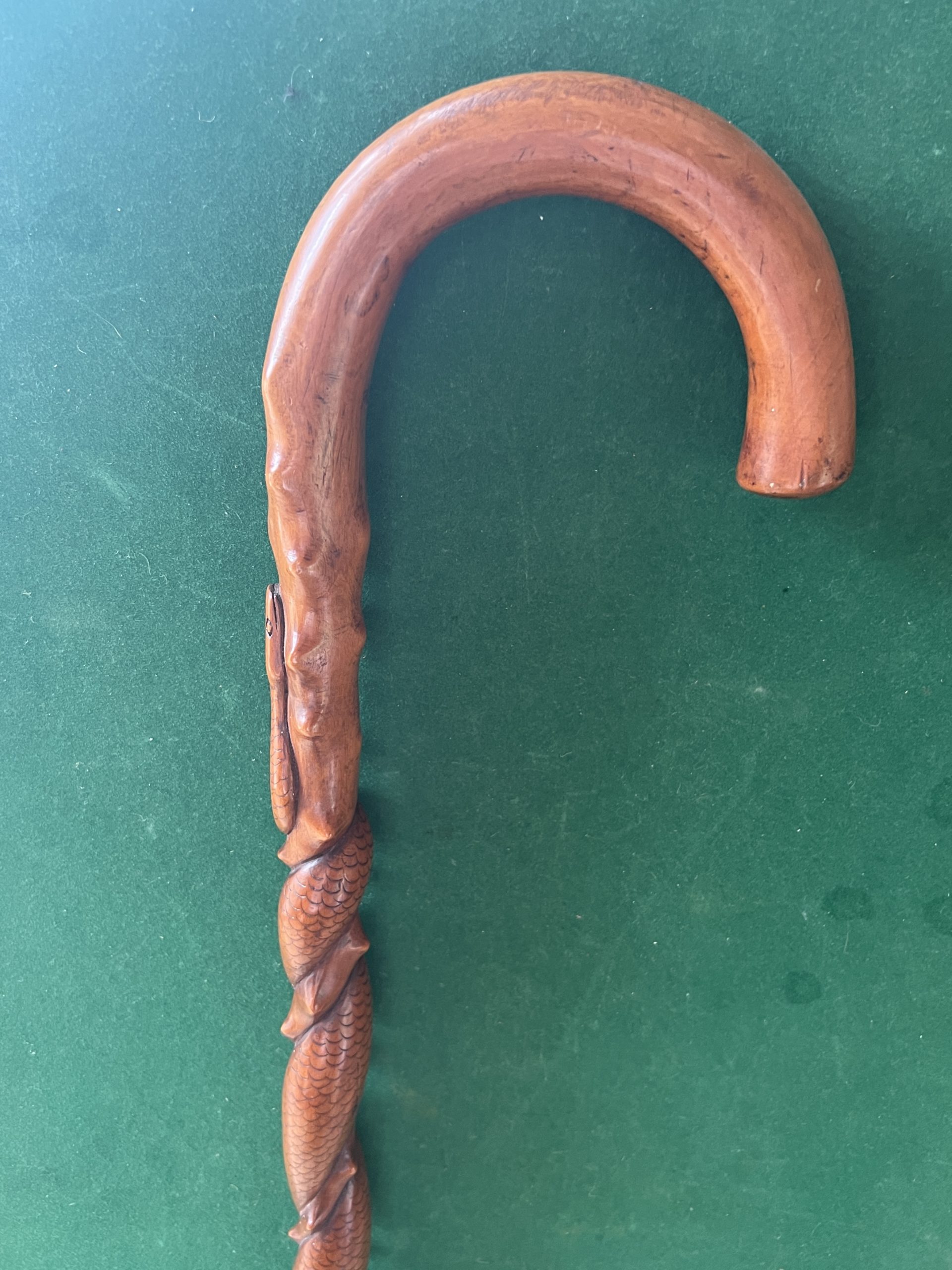 Canne corbin monoxile - le bois est de l’Olivier - la férule est en acier et mesure 7cm50 - un serpent avec ses écailles s’enroule autour du fût - le bois est travaillé façon épineux - la longueur est de 92 cm - époque début 20 ieme