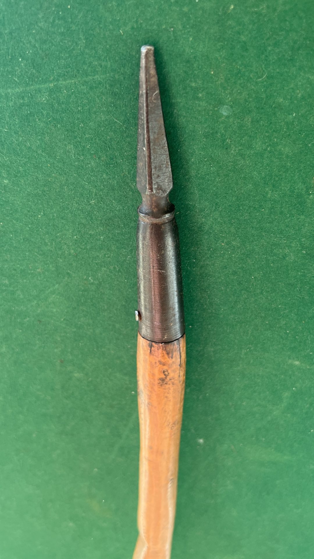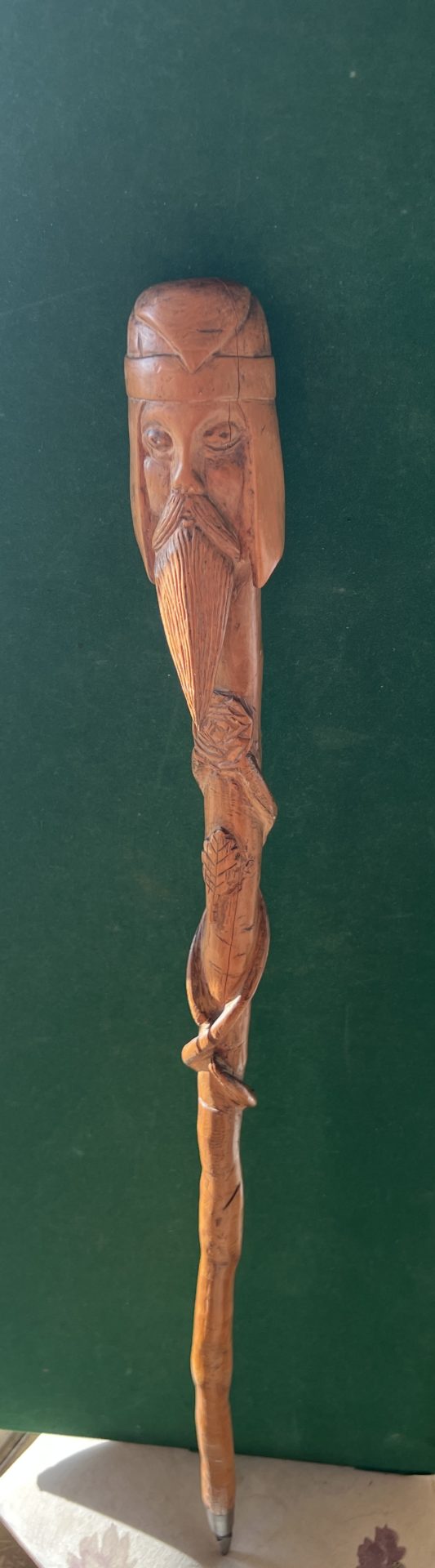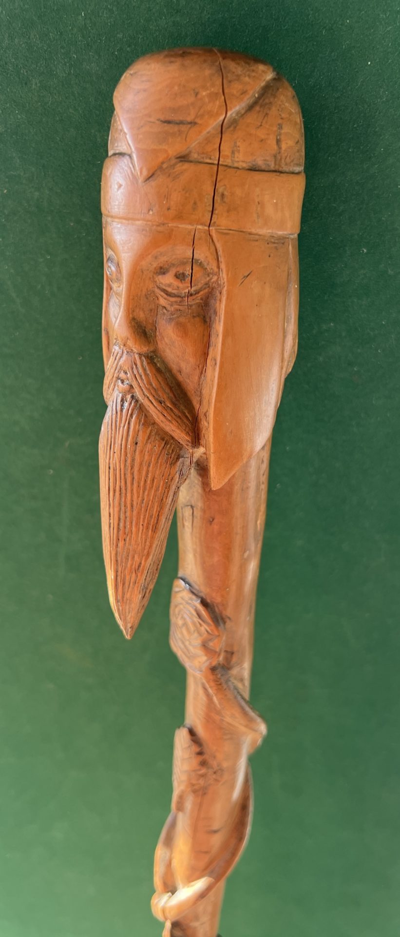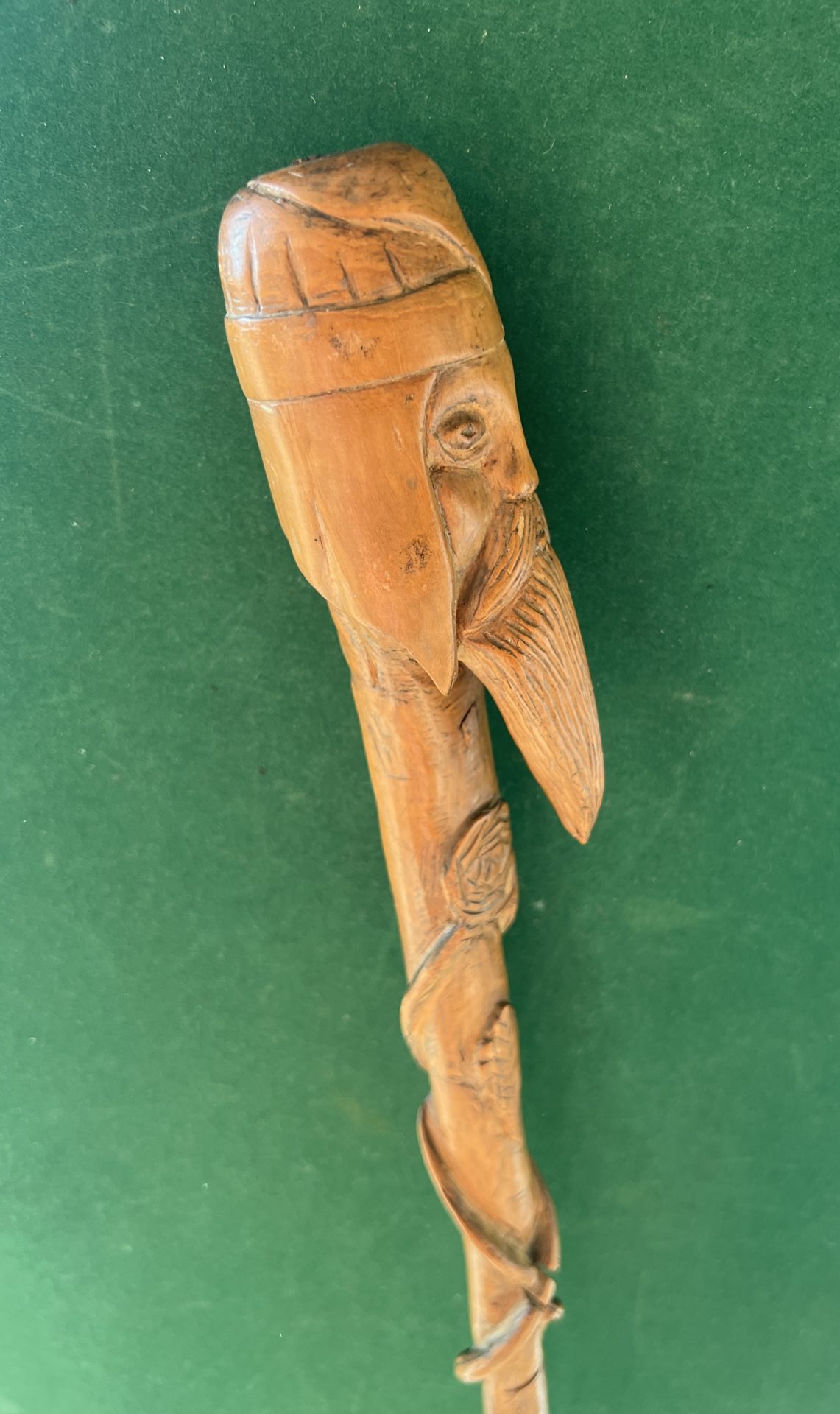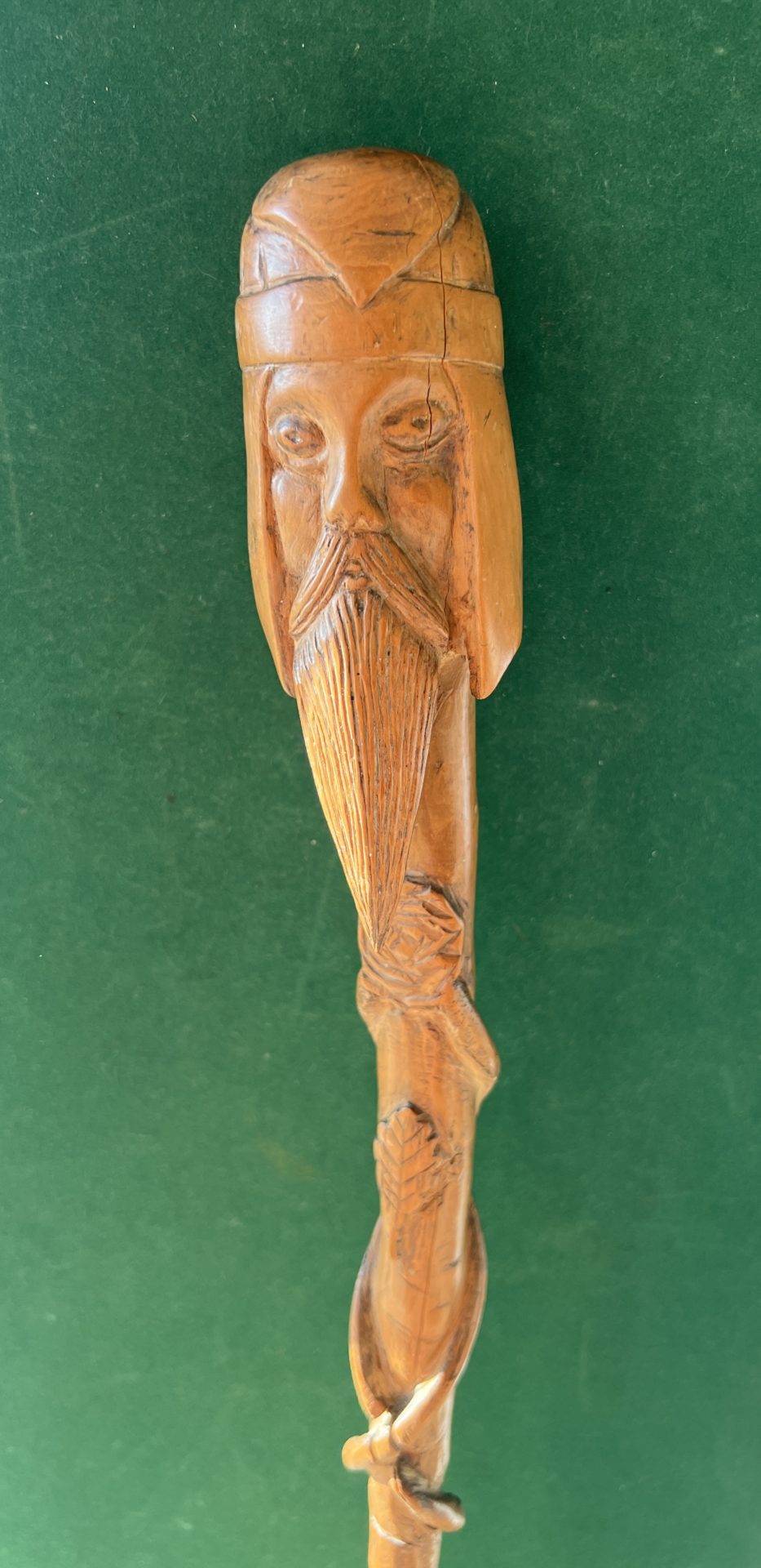 Canne populaire monoxyle en buis - le fût est travaillé feuilles et médaille - la férule en fer forgée mesure 12cm longueur de la canne 90 cm - époque 1919 -