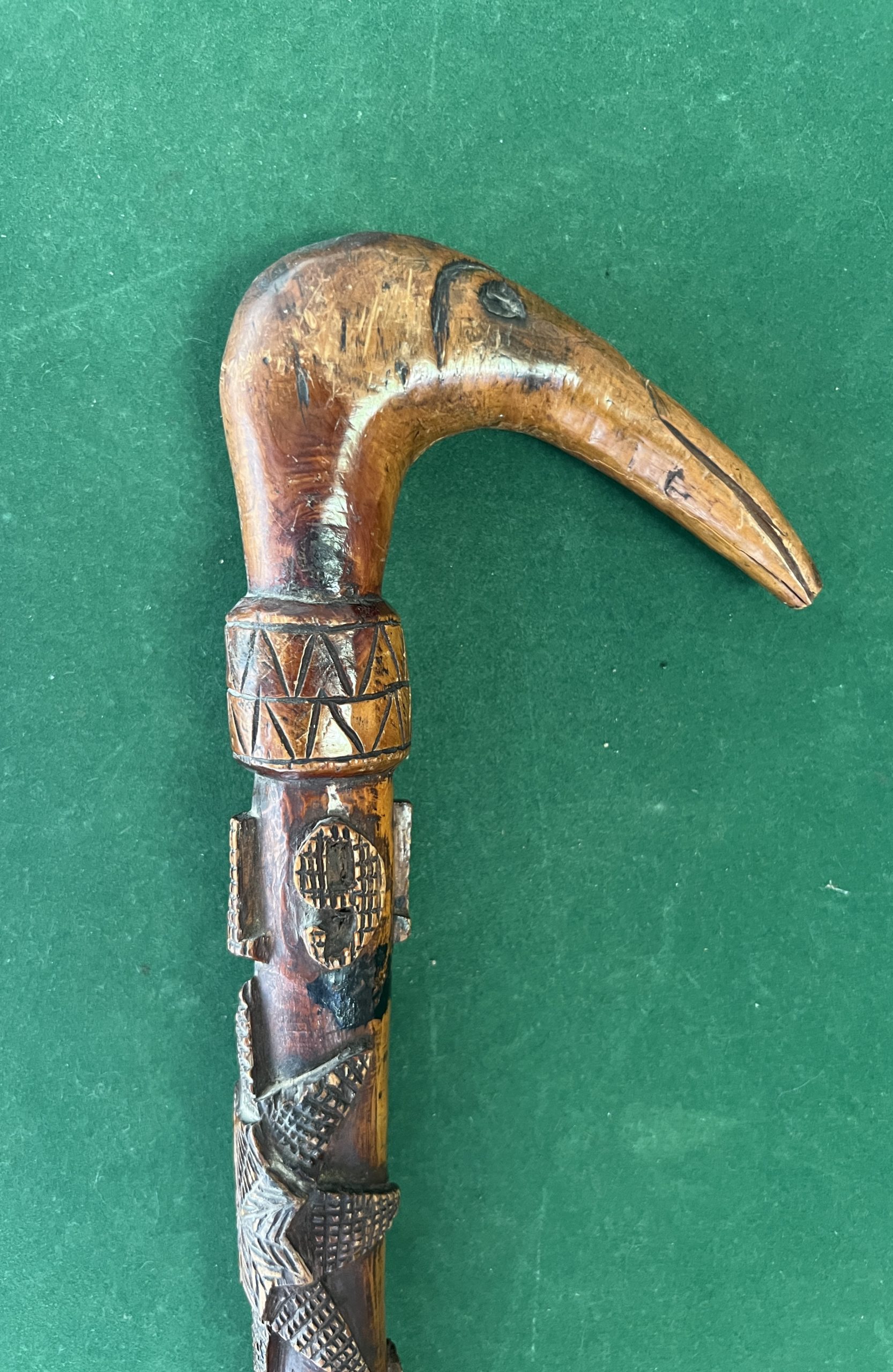 La canne est monoxyle et sûrement en Olivier - le fût est décoré de poissons avec une ancre et des glands et feuilles de chêne - elle est datée de 1919 - la longueur est de 90 cm - le pommeau représente un oiseau - la férule mesure 70 mm elle est en fer forgé -