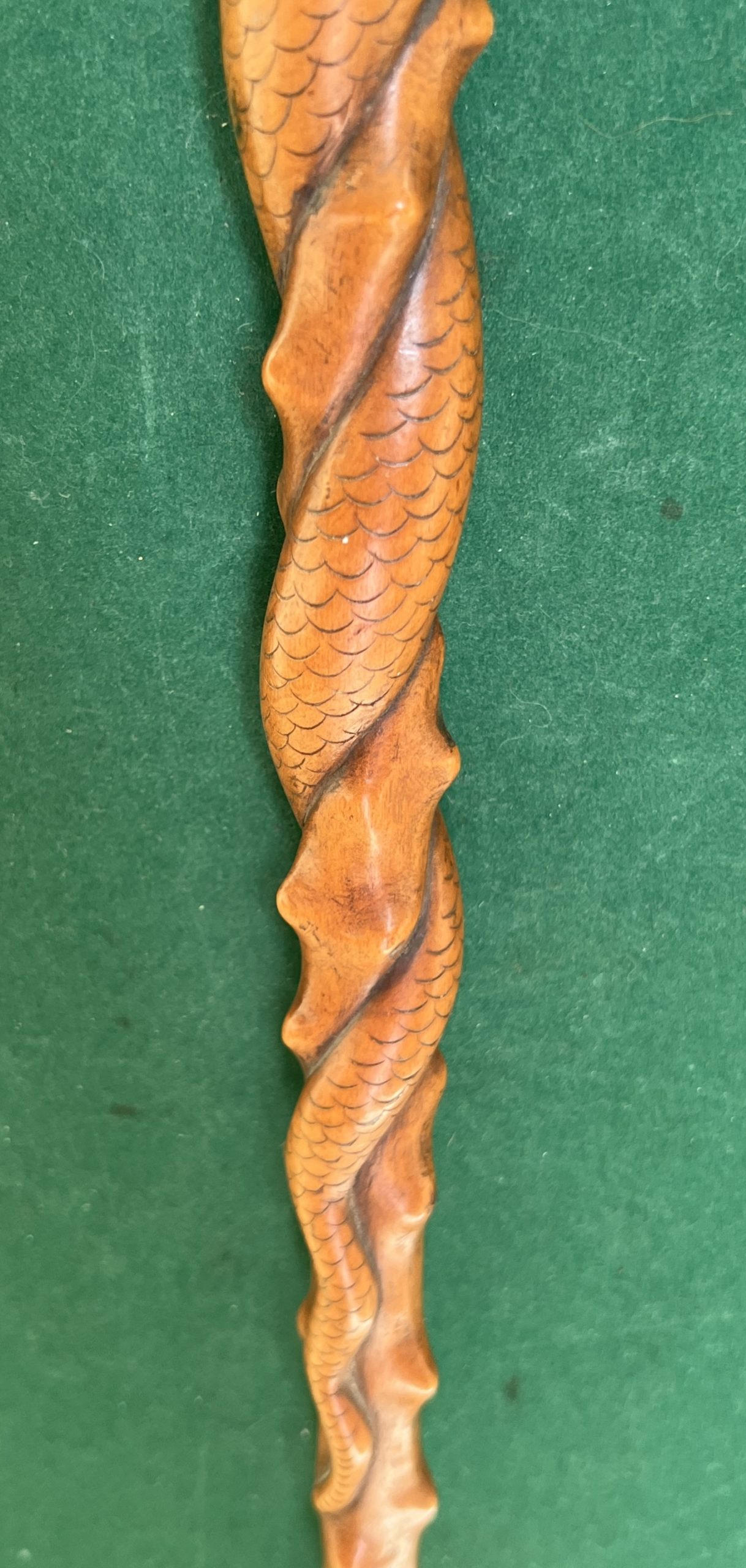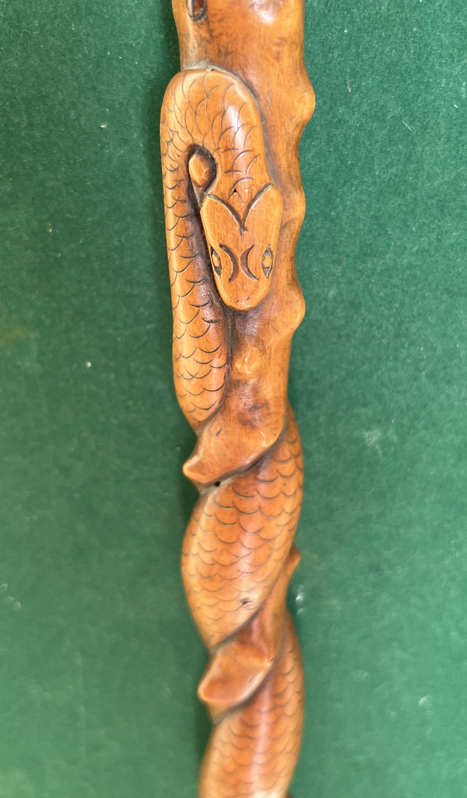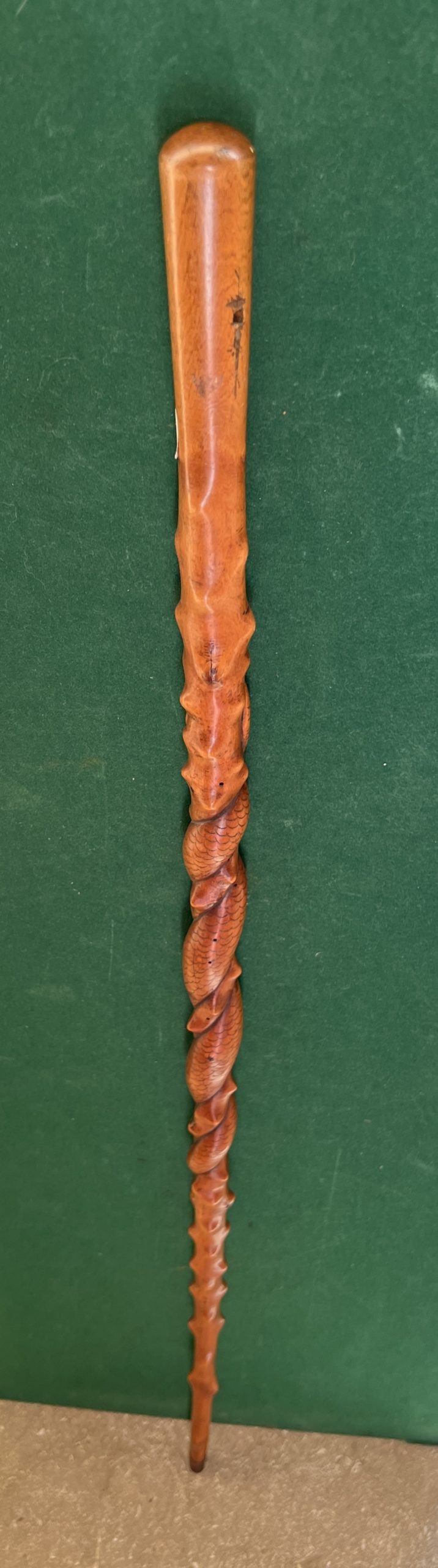 La canne est en Olivier travaillé façon épineux avec un serpent qui s’enroule autour du fût - la férule est en fer et acier - la longueur est de 92 cm - époque 1900 - 1920