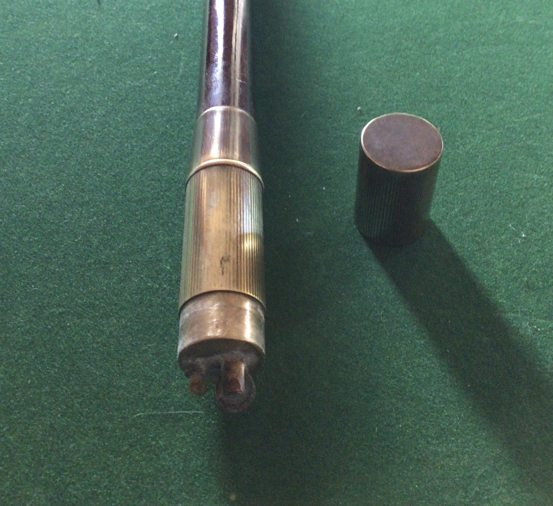 Canne à système briquet - poignée en cuivre - férule cuivre - bois décoré - époque 1920 - 1930 longueur 91 cm -