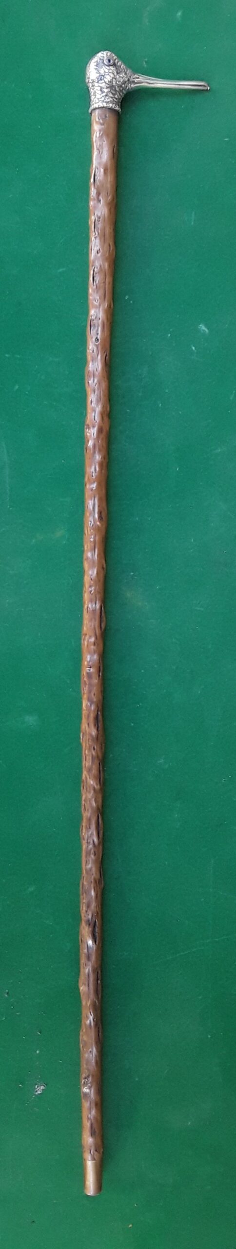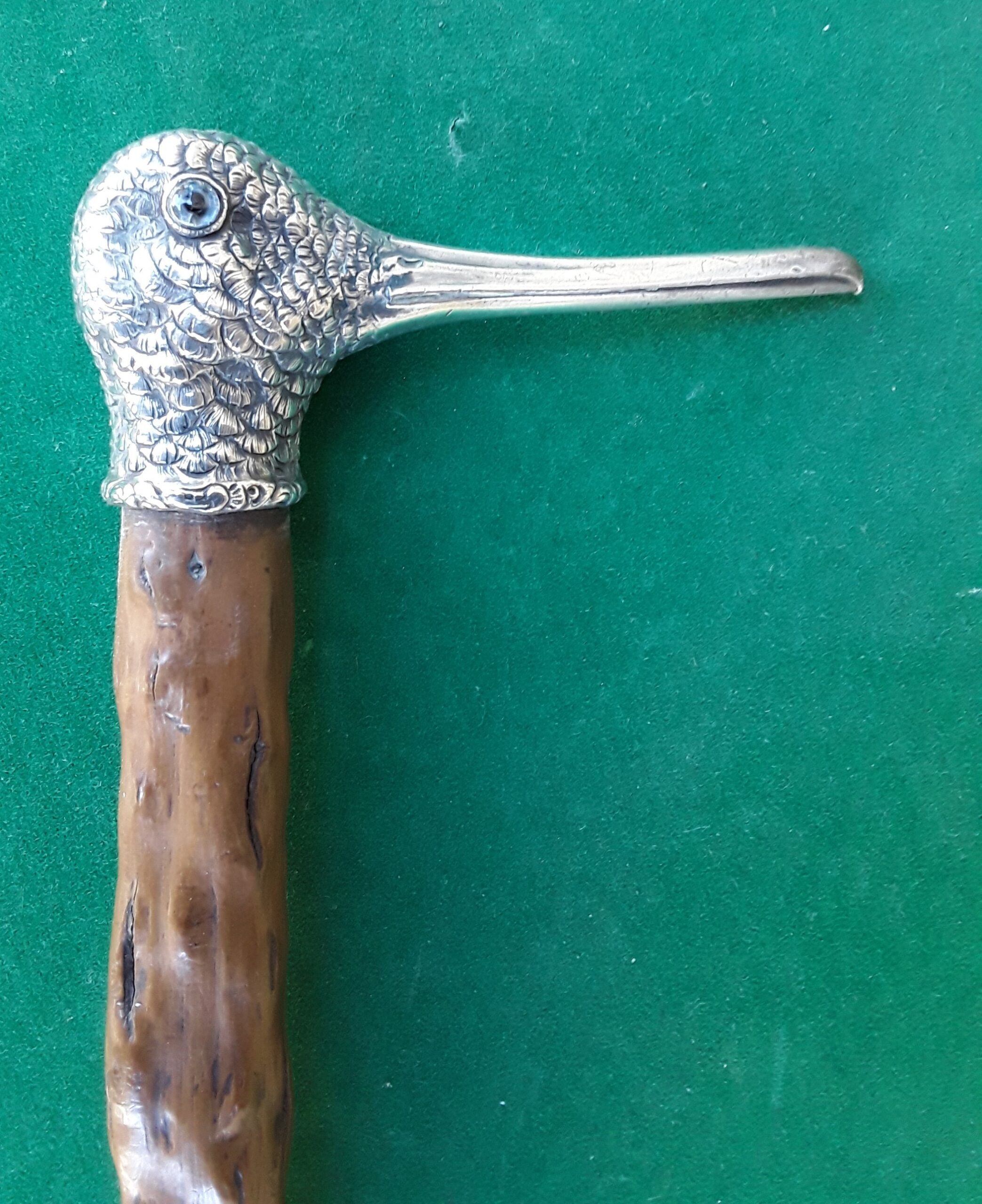 Très belle canne d'art. Pommeau en argent représentant une tête de bécasse. Fût en néflier.