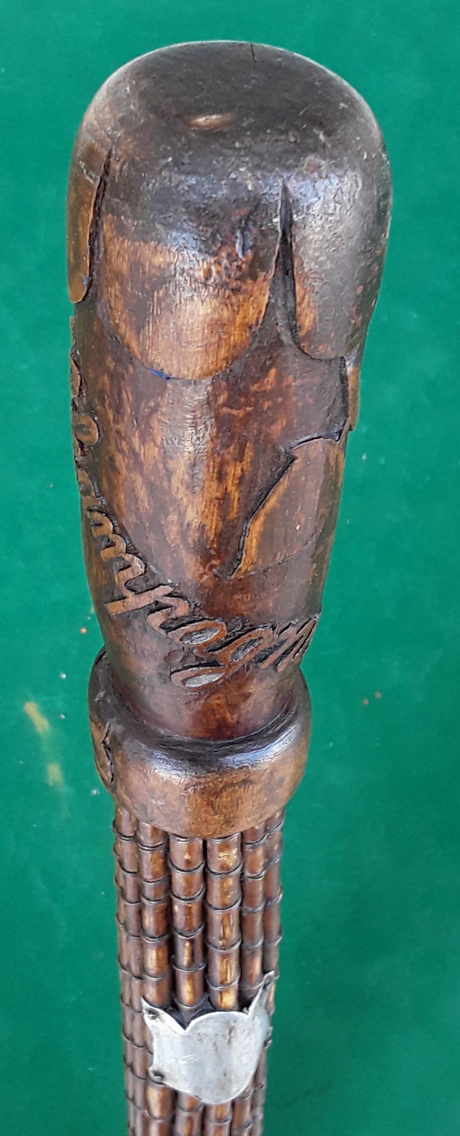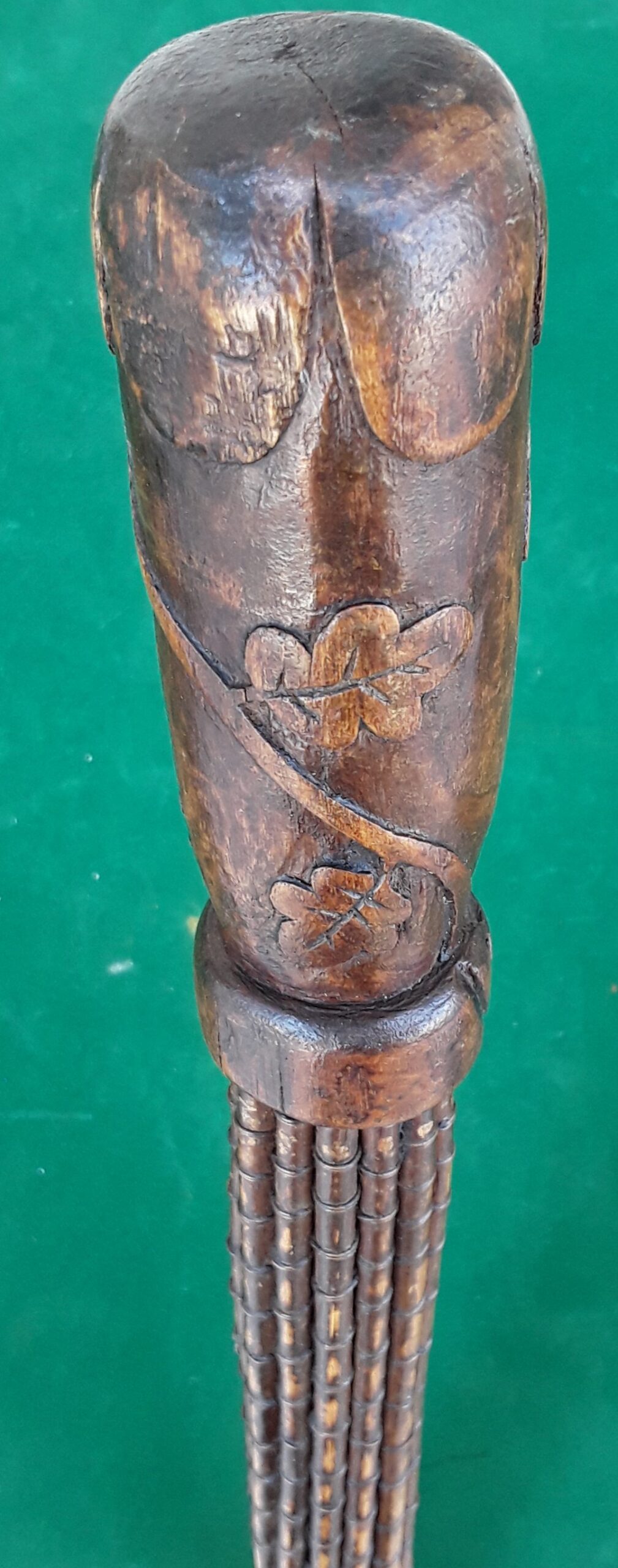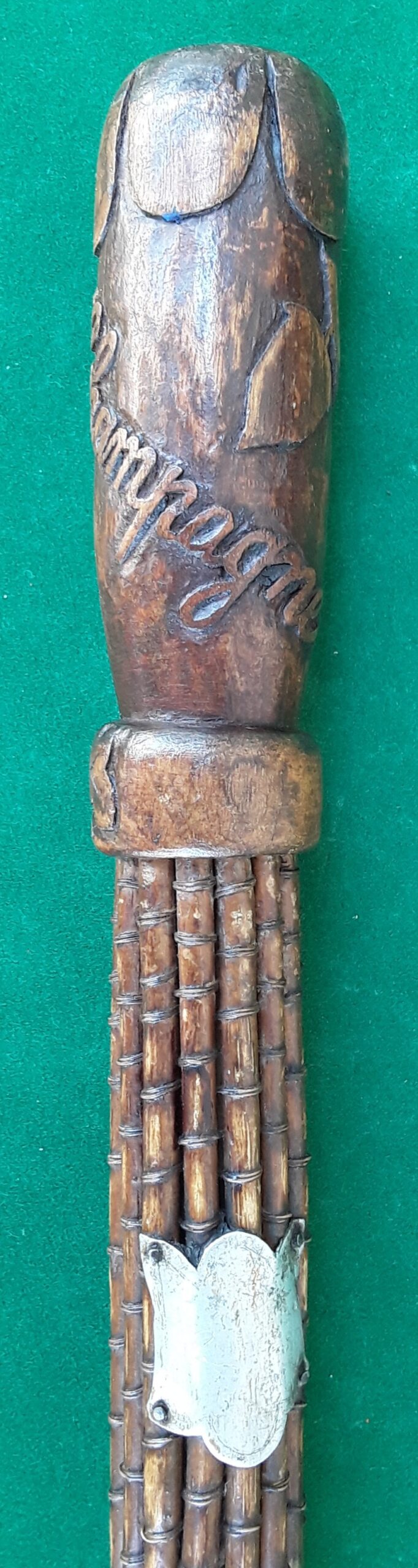 Magnifique canne d'art populaire. Pommeau sculpté de feuilles de vignes ef de l'inscription "Champagne". Fût en roseaux très fins. Très certainement une canne de poilu, d'origine camarguaise, détaché en Champagne Ardennes.