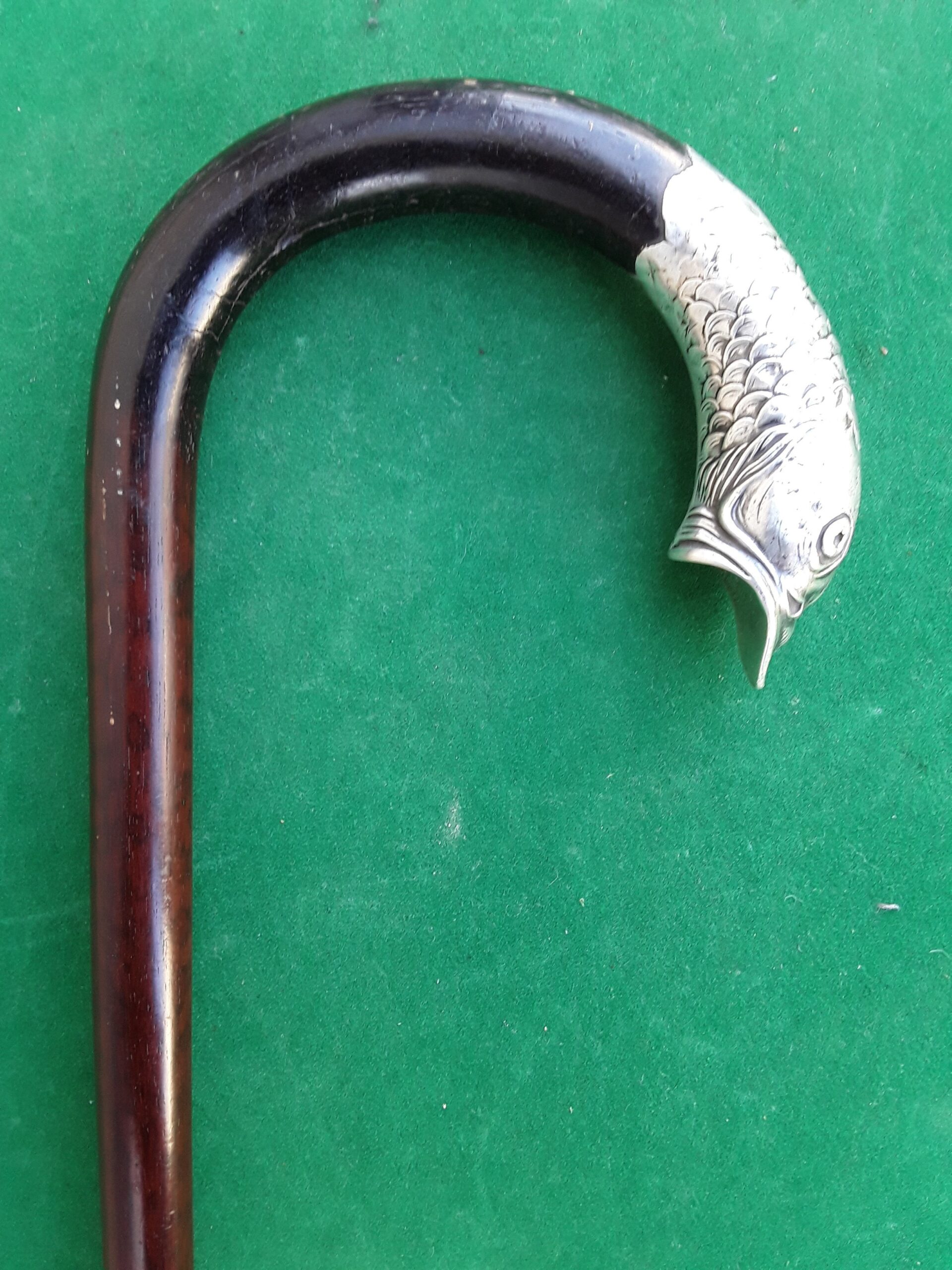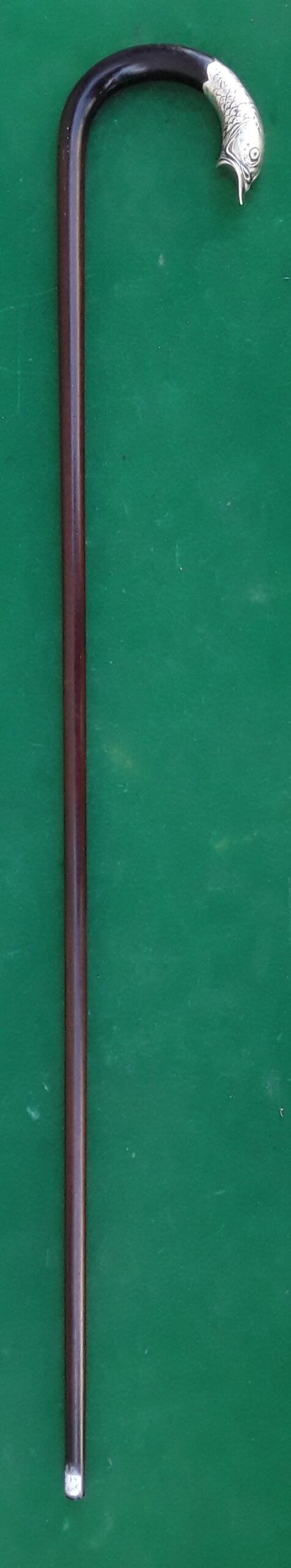 Très belle canne .Pommeau en argent représentant un poisson. Fût en amourette.