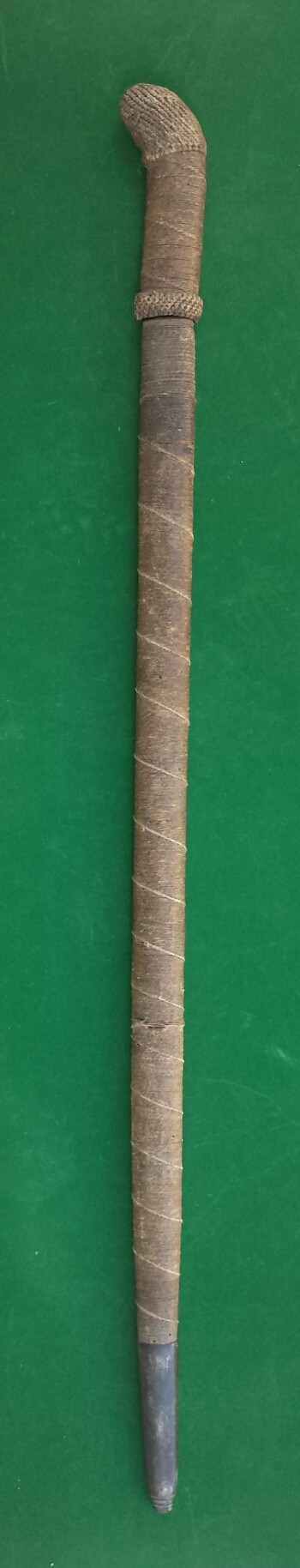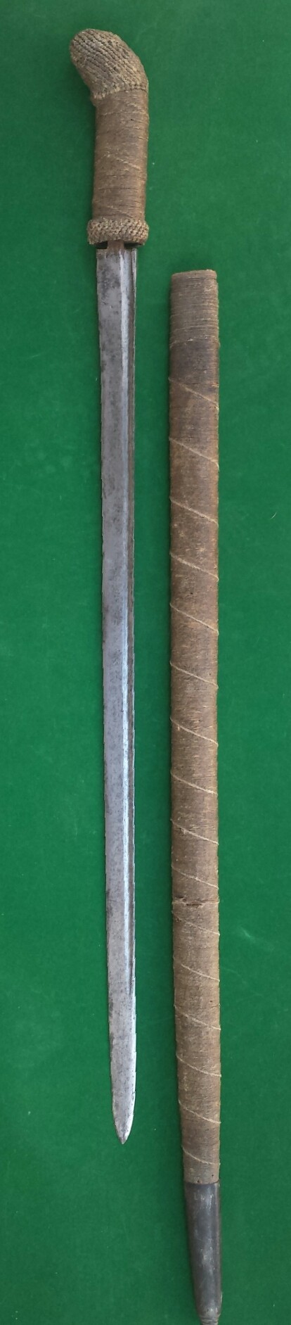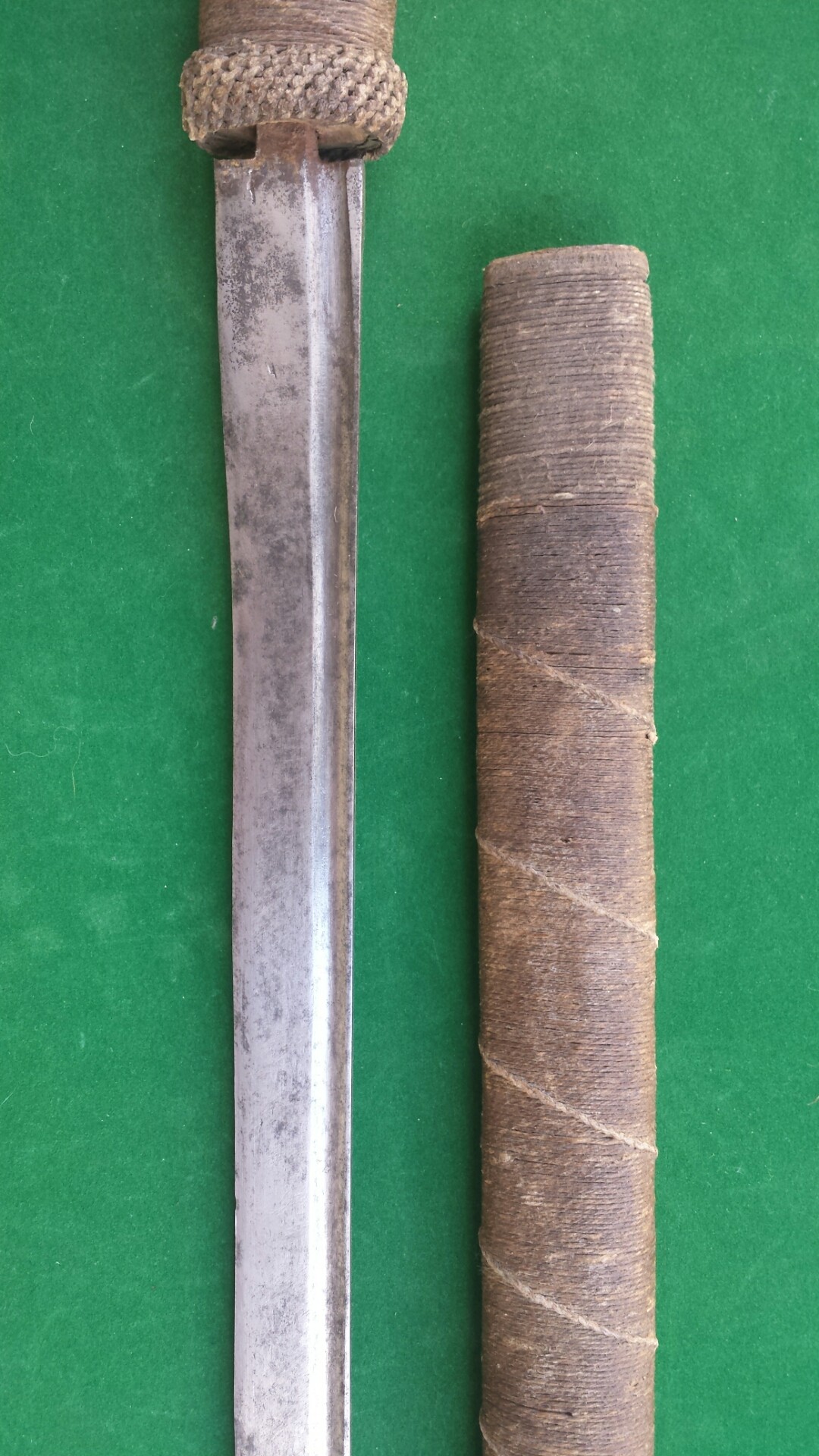 Exceptionnelle canne à système de demi-solde. Les demi-soldes étaient les grognards de Napoléon et touchaient une demi solde. Les officiers partaient avec leur sabre. Pour les soldats, le sabre était cassé pour ne leurs laisser que la lame, ensuite montée en canne par chaque grognard. Étui en bois recouvert de corde trempée dans la cire.