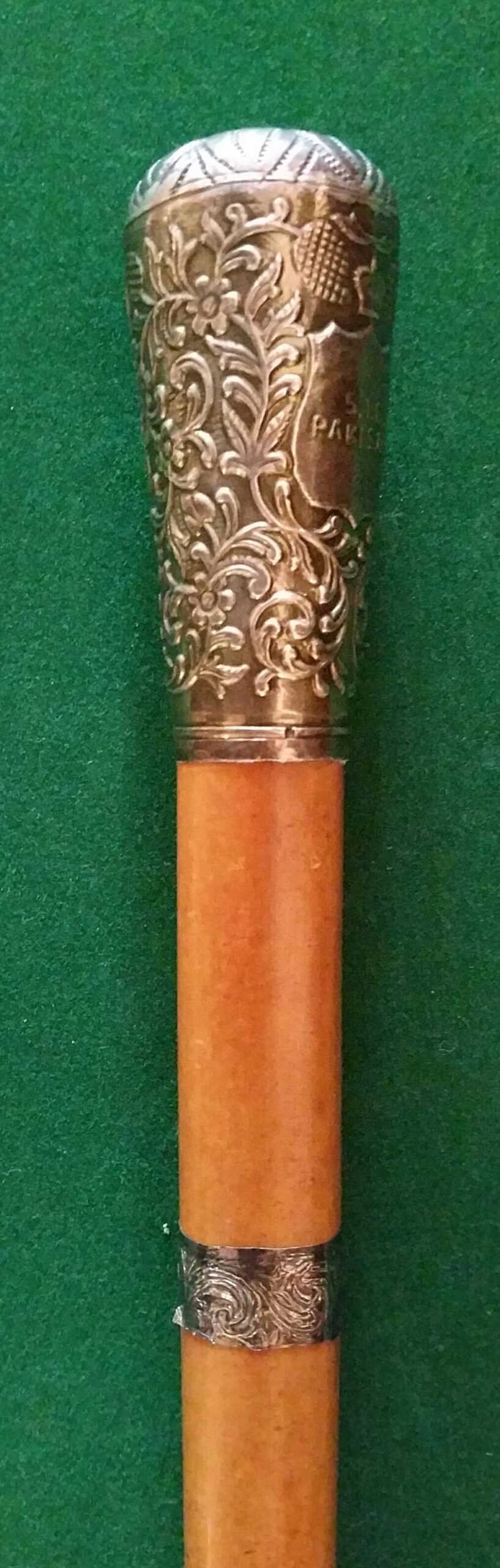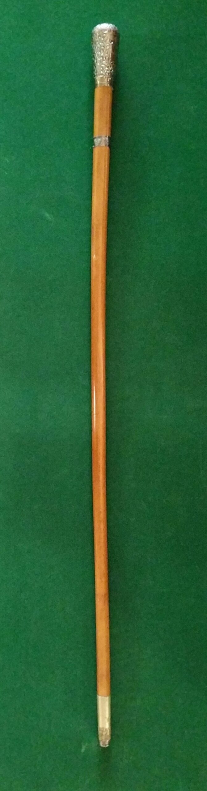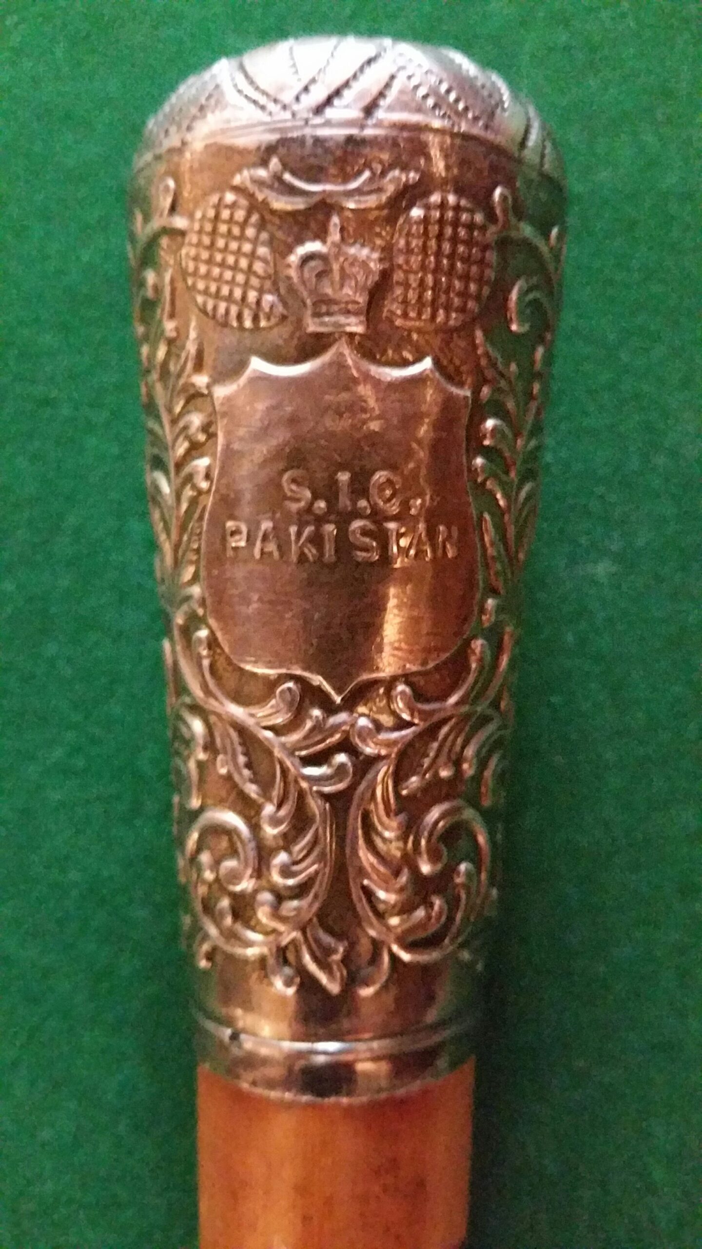 Canne d'art. Pommeau et bague en argent décoré aux motifs floraux.  Inscription SIC PAKISTAN. Fût en Malaka.