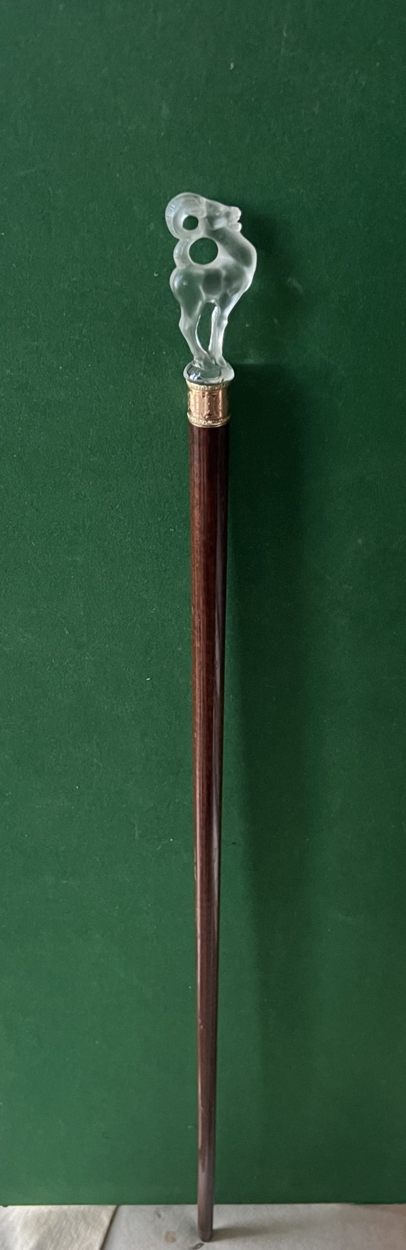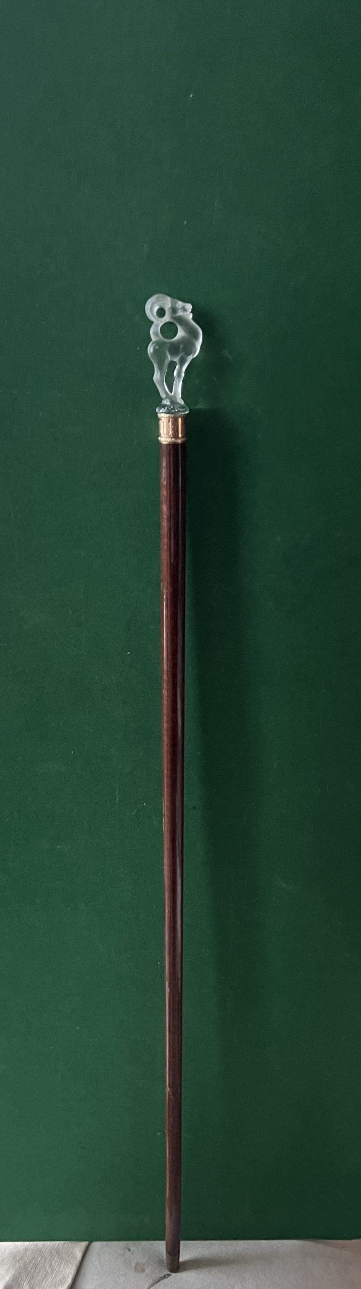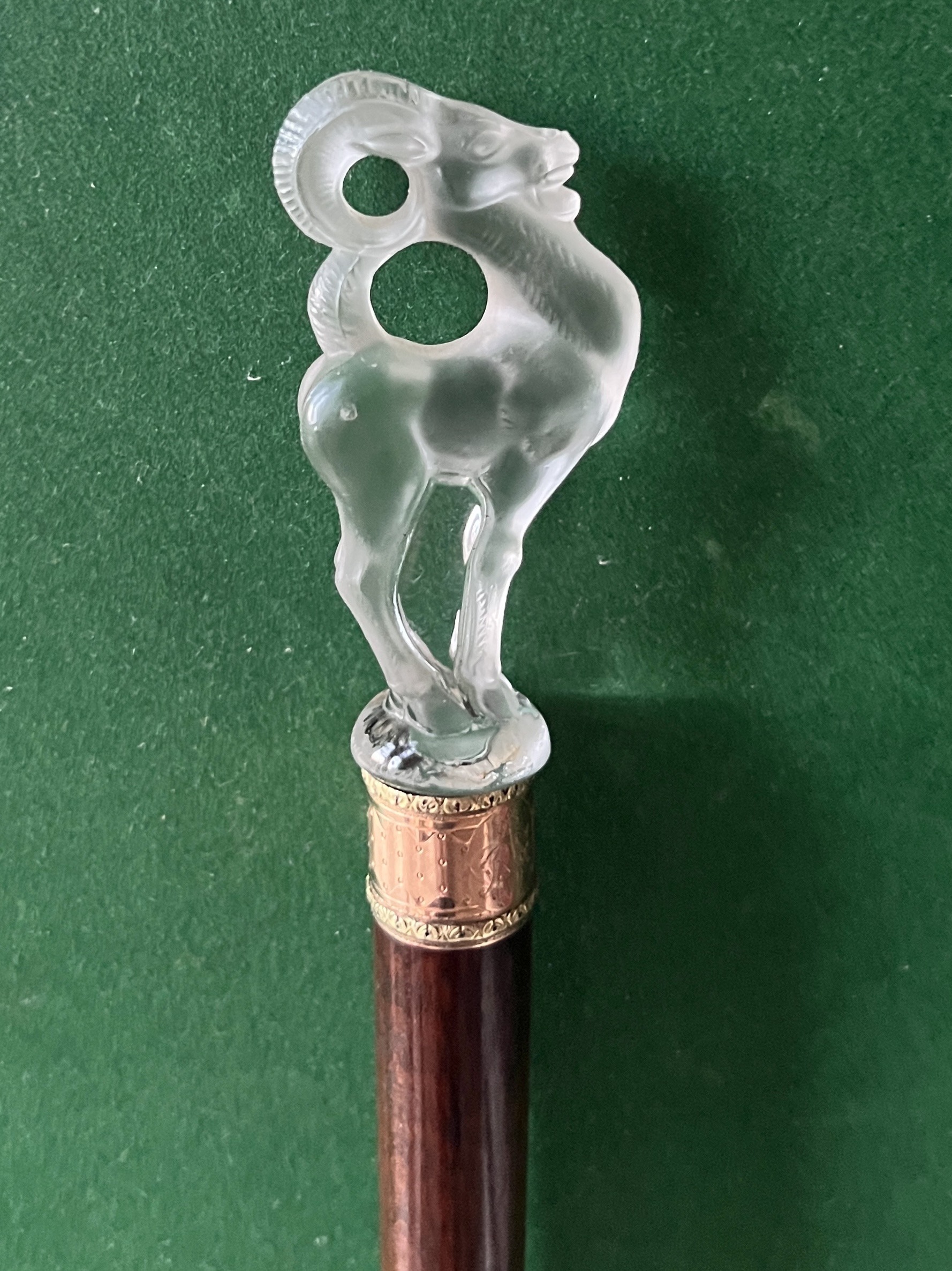 le pommeau représente un chamois - la bague est en or jaune et rose avec initiales AetC - le fut est en amourette la férule est en cuivre et acier - longueur 92 cm - époque début 20 ieme