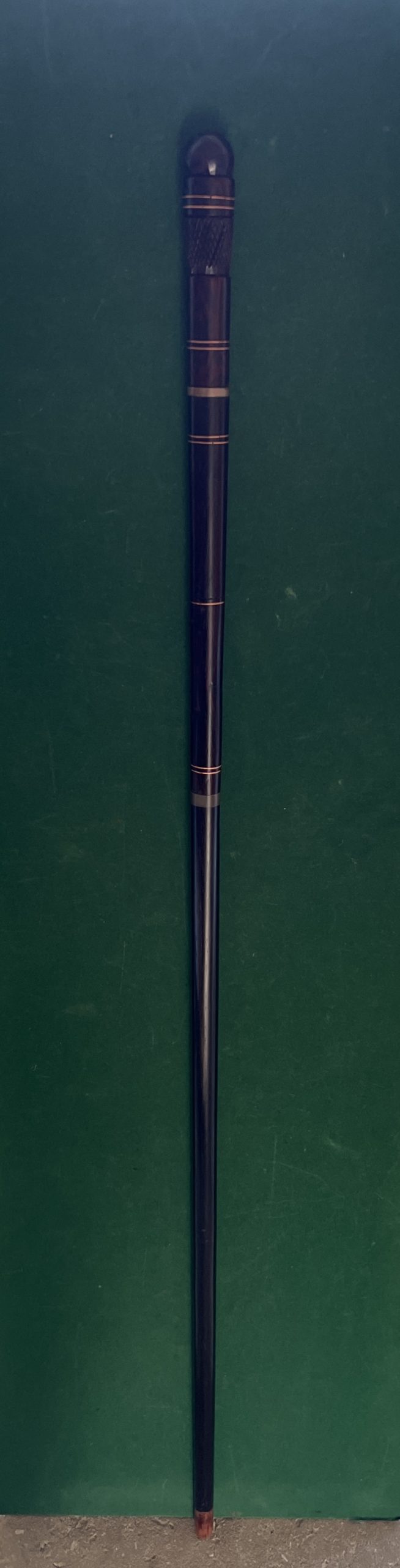 Le pommeau travaillé avec incrustation de laiton la bague est en cuivre - le fût est en palissandre avec plusieurs anneaux en laiton ( quelques manques)et un en corne - la férule est en corne blonde -