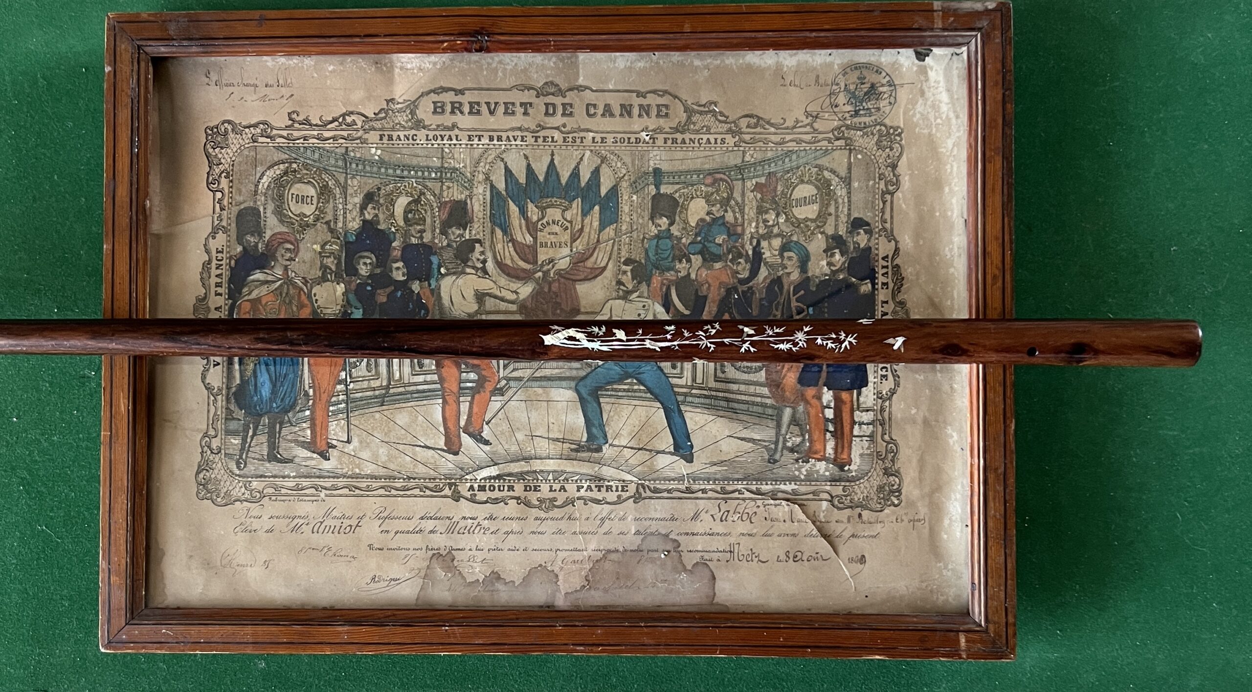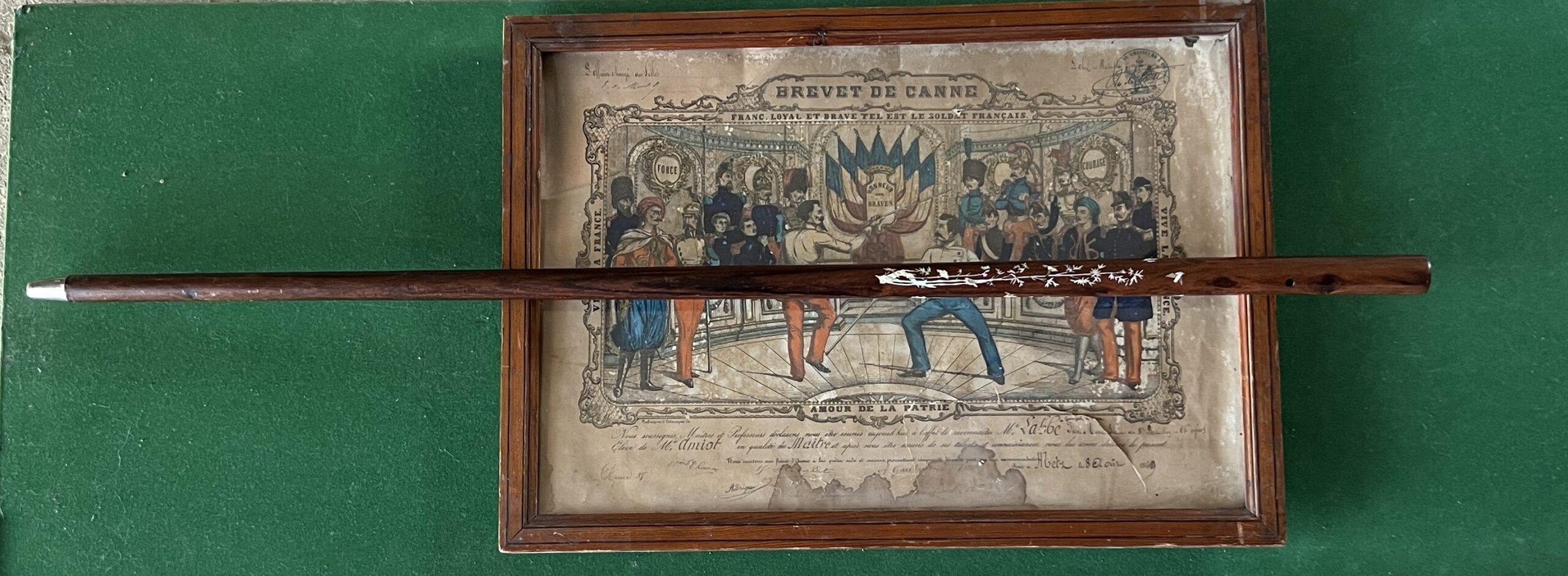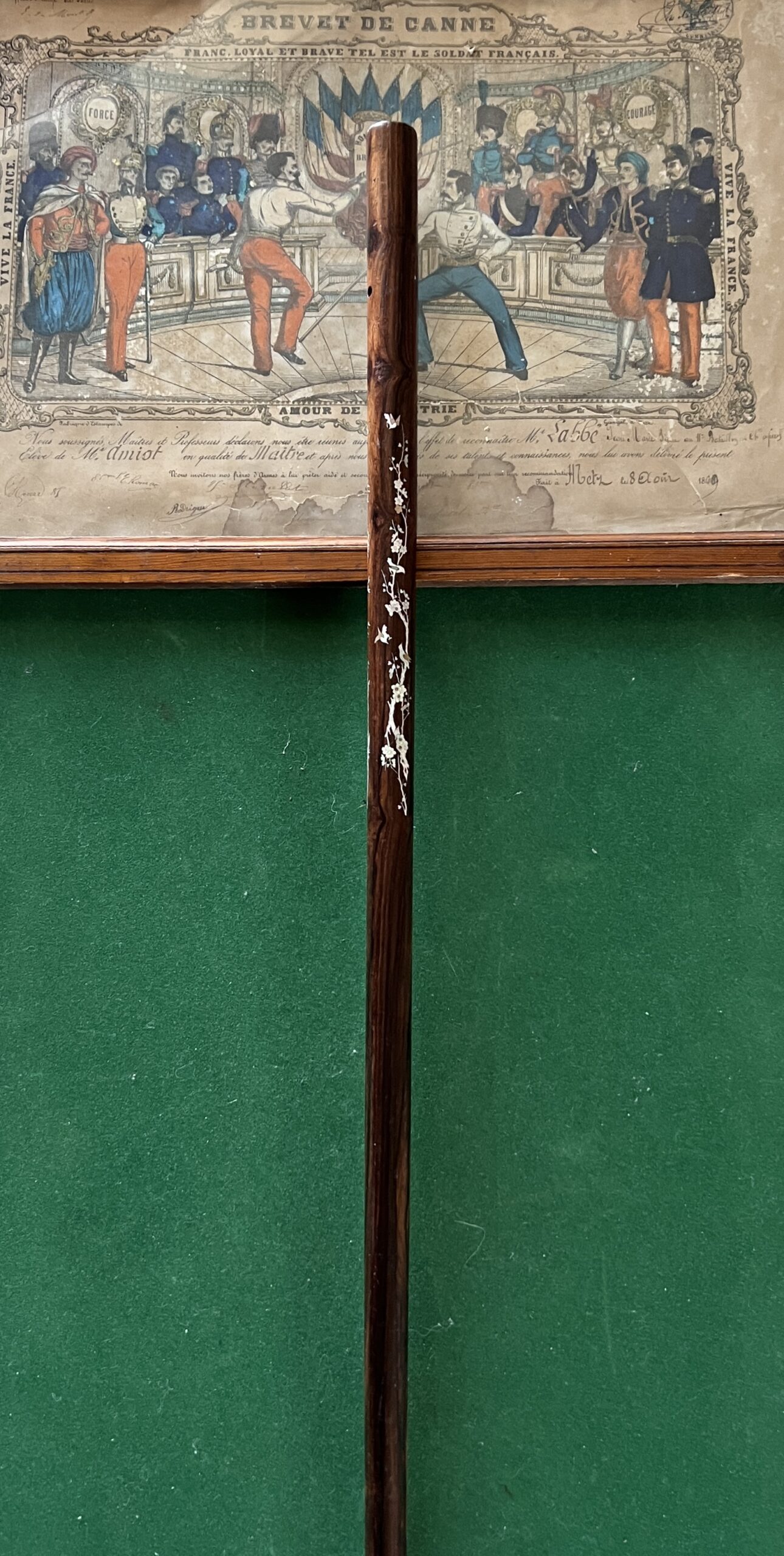 très jolie bâton de combat - le fût est d’un seul morceau - bois exotique très dur et non cassant - la longueur est de 90 cm - très riche décor sur la partie haute de la canne - la férule est en fer blanc avec talon en acier - époque Napoléon trois - il existe toujours des combats de cannes - il est sûrement un bâton de parade /
