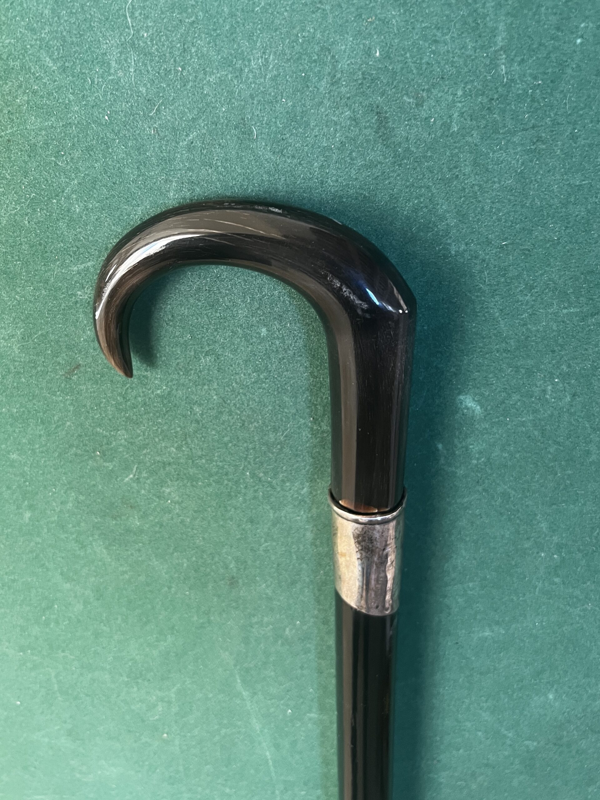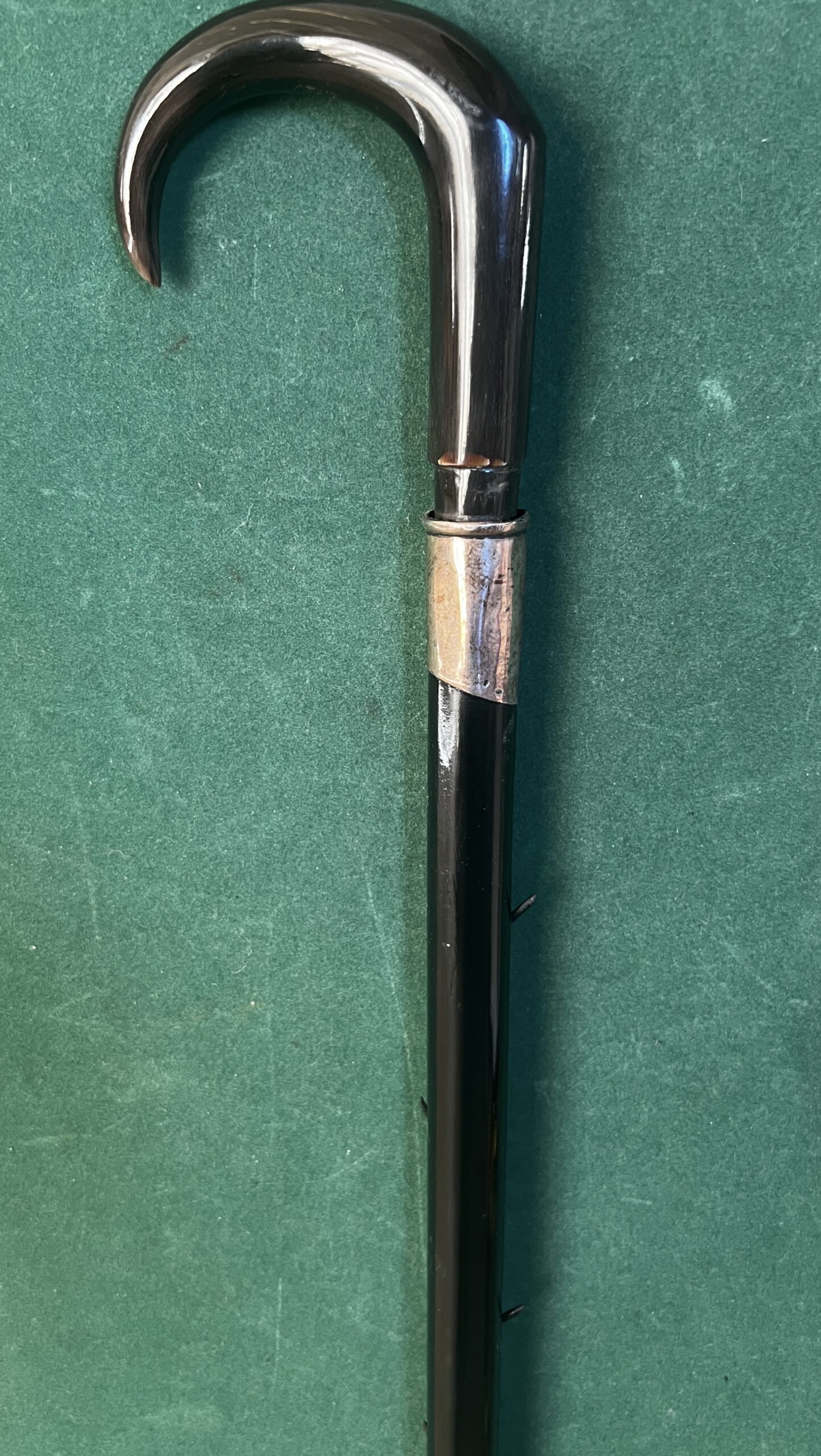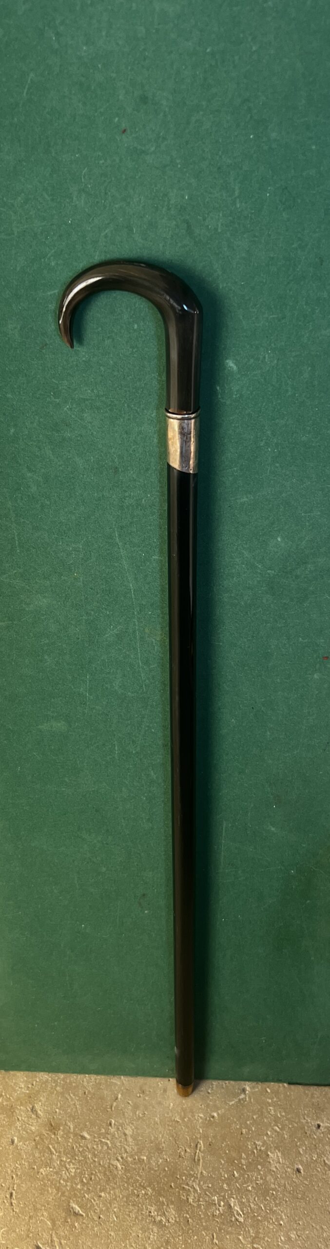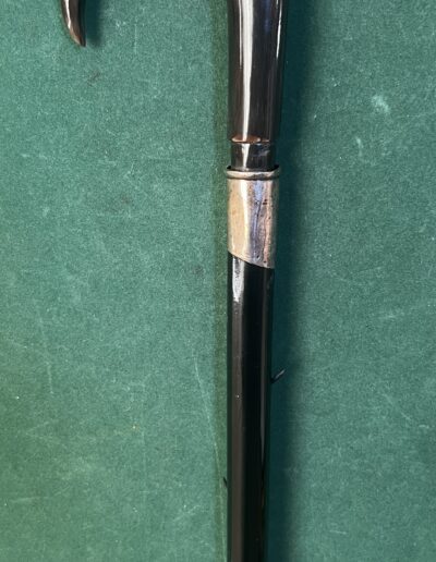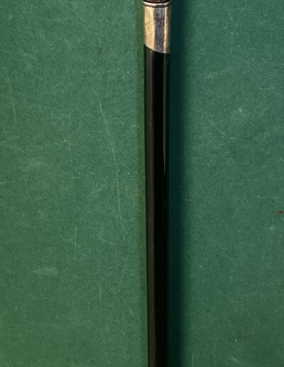 Le pommeau est en corne marron foncé - la bague est en argent - le fût en bois laqué noir comporte neuf pointes qui sortent du fût ( brevet Français 1882 ) - la férule est en laiton avec talon en acier la longueur est de 92 cm -