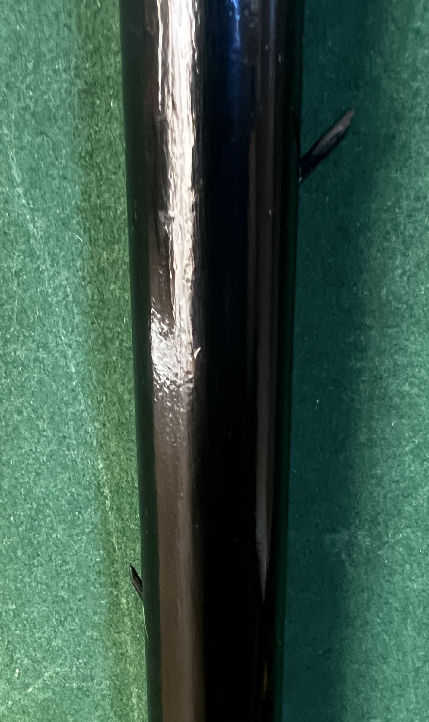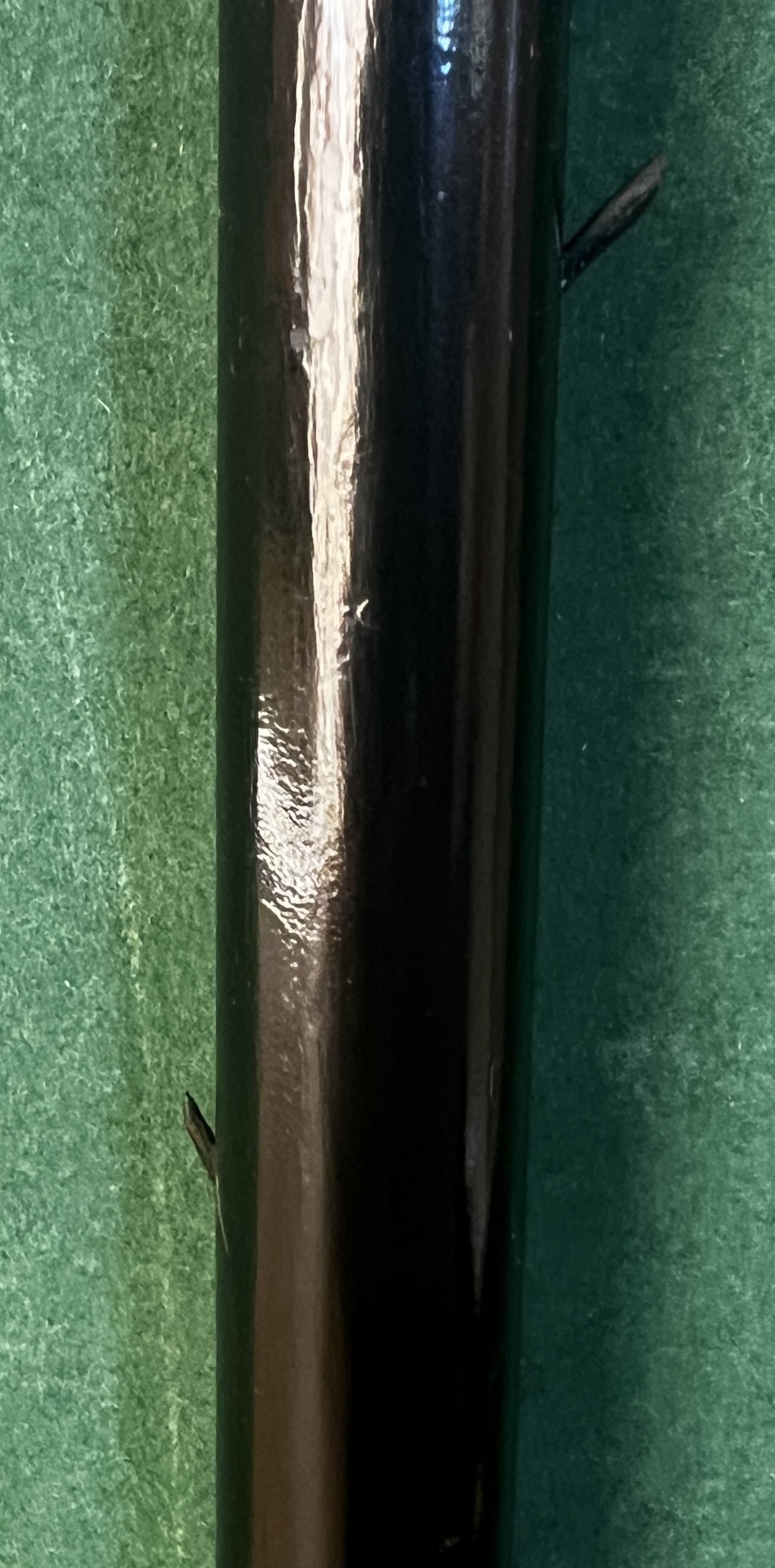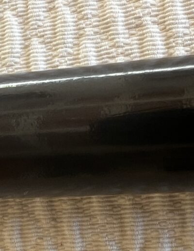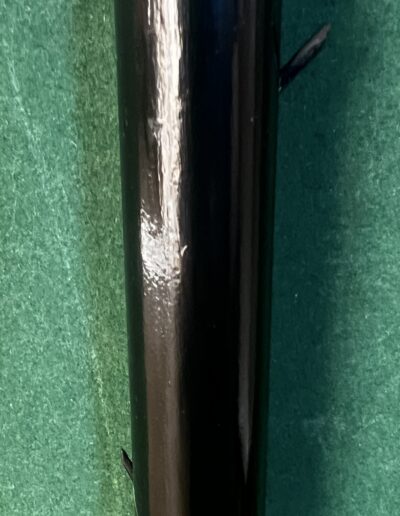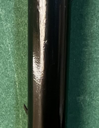 Le pommeau est en corne marron foncé - la bague est en argent - le fût en bois laqué noir comporte neuf pointes qui sortent du fût ( brevet Français 1882 ) - la férule est en laiton avec talon en acier la longueur est de 92 cm -