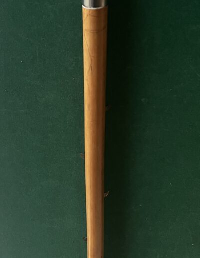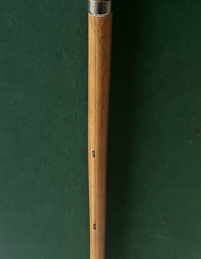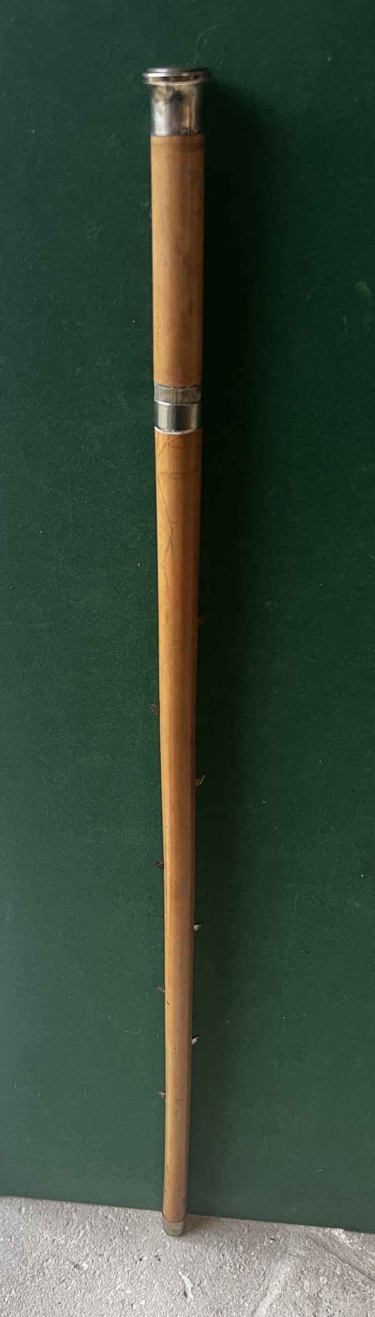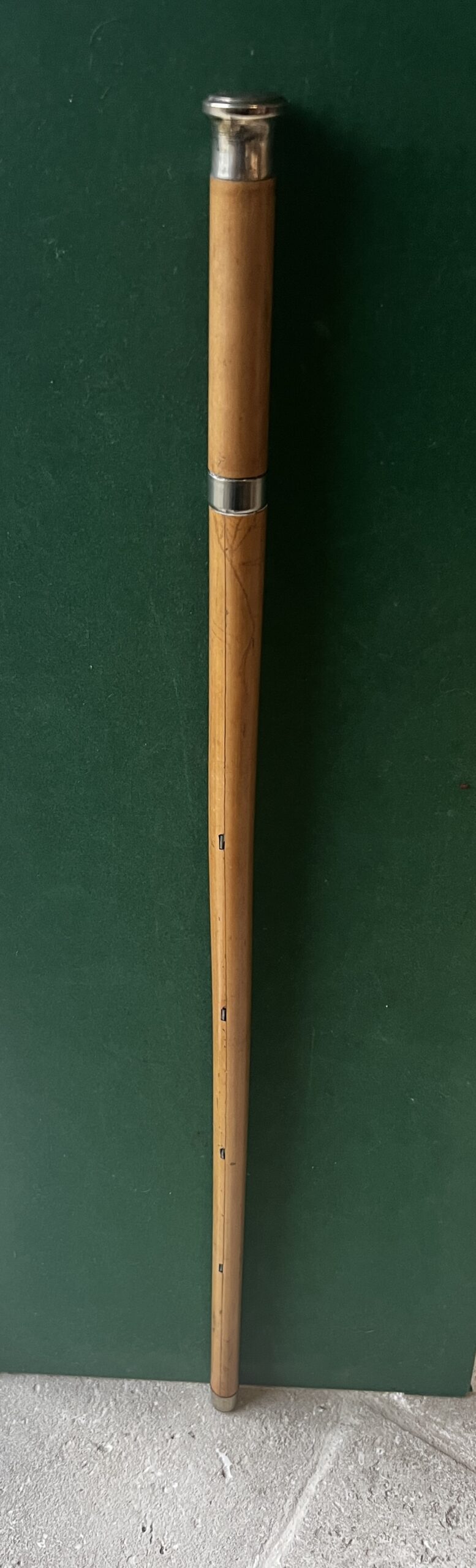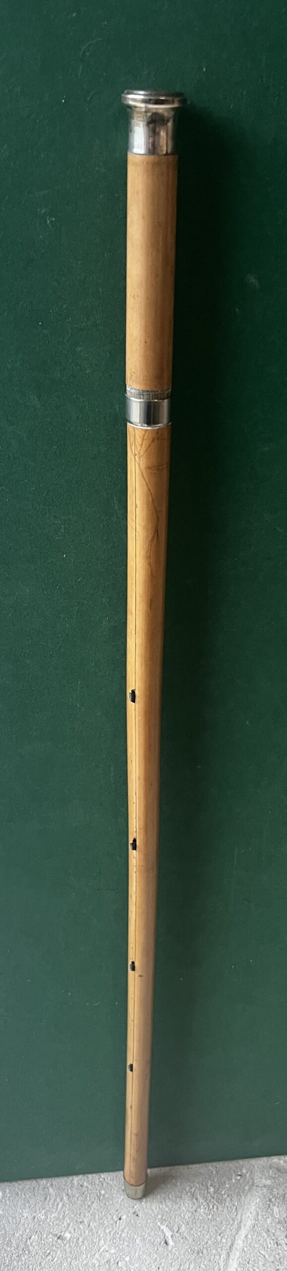 Le pommeau est en métal argenté - le fût est en malaka , à l’intérieur huit crochets qui sortent de la canne - la bague est en métal argenté - la férule en fer blanc et acier - la longueur est de 94 cm - époque dix-neuvième