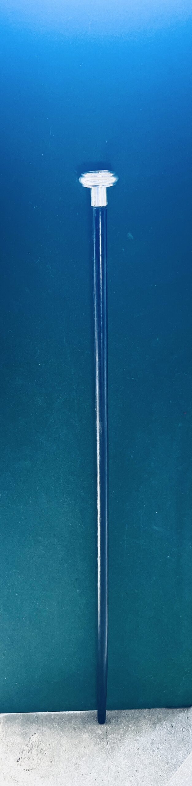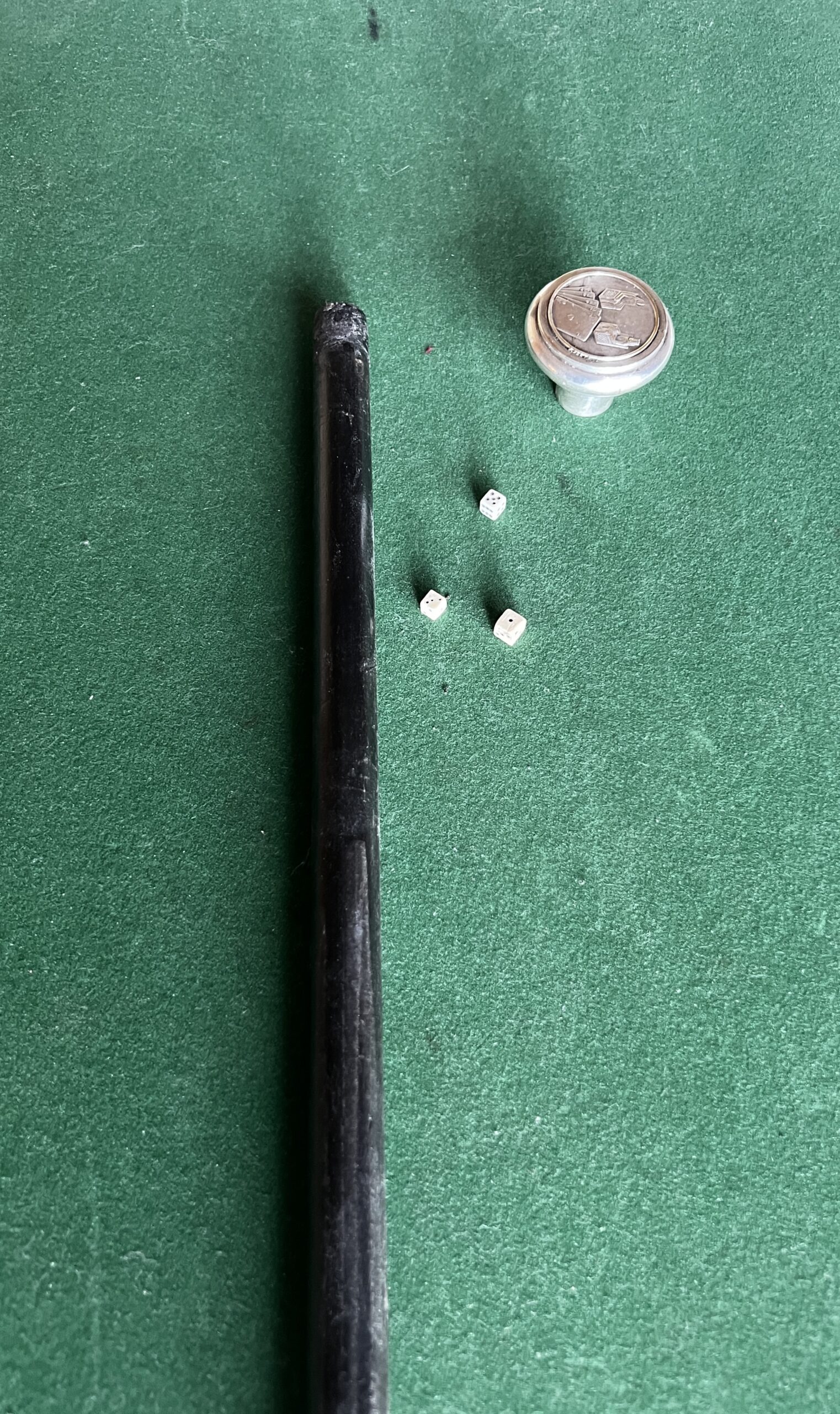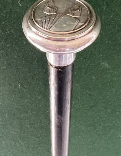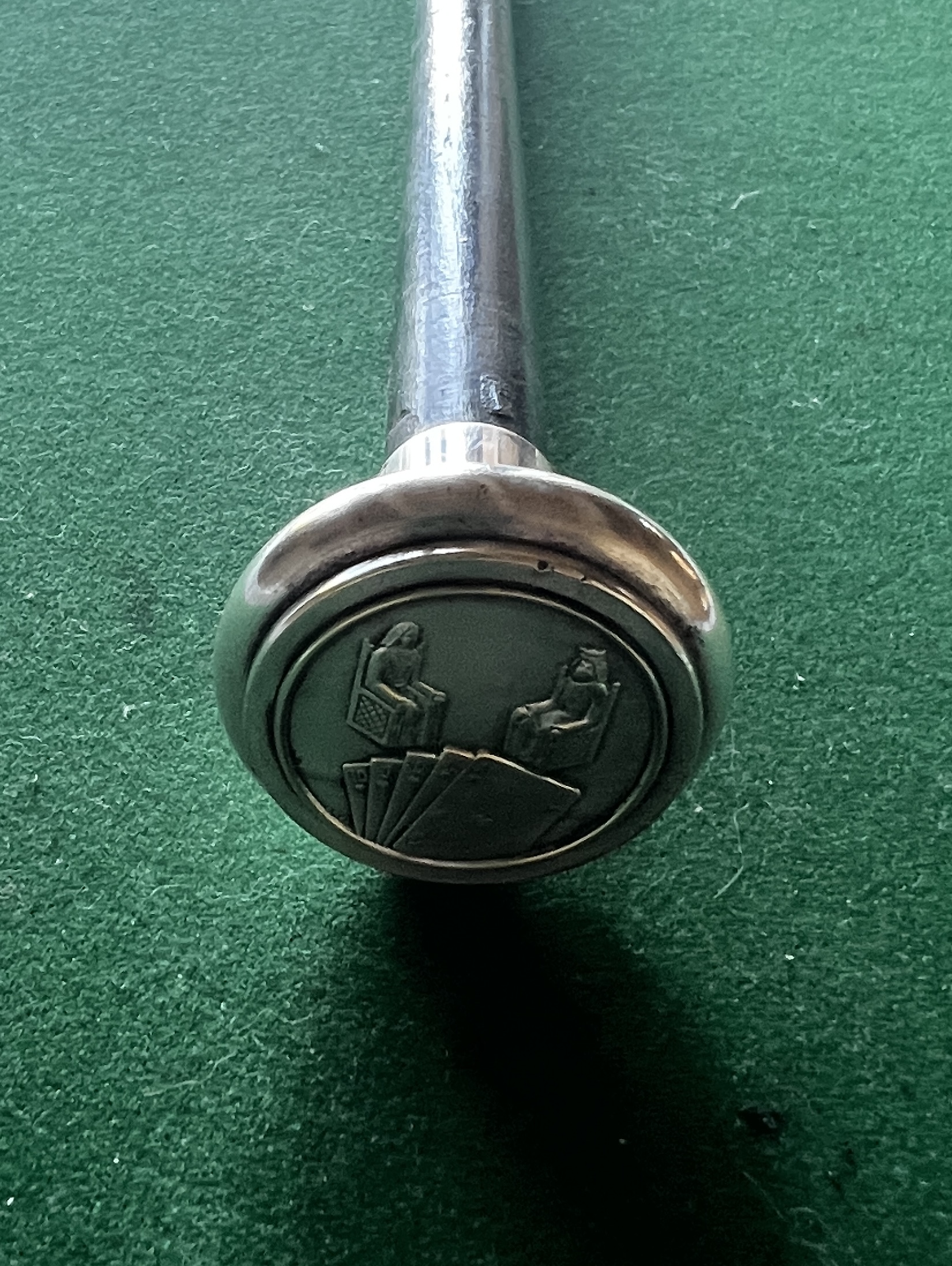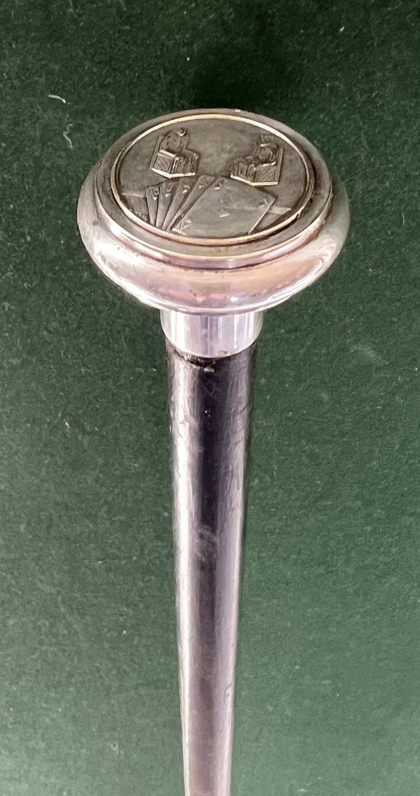 le pommeau en métal argenté décoré de deux joueurs de cartes à l’intérieur trois petits dés - le fût est sûrement en ébène - la férule est en corne noire - la longueur est de 92 cm - époque les années trente