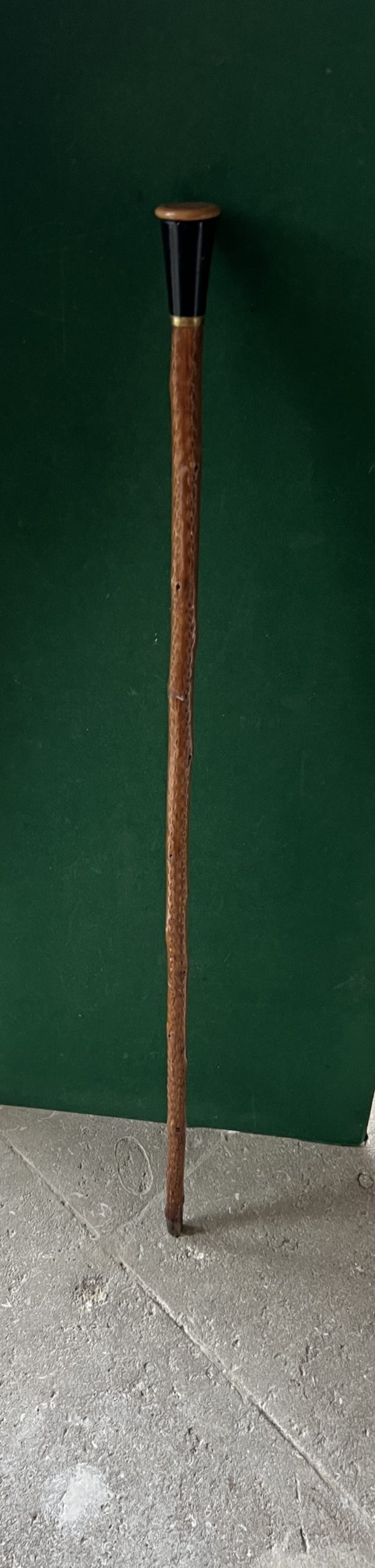 Le pommeau est en buis et bois laqué noir la partie haute se dévisse et à l’intérieur trois des et des pions ( manque des pions) - la bague est en cuivre - le fût est en néflier - la férule en cuivre et acier - la longueur est de 90 cm - époque 1900 -