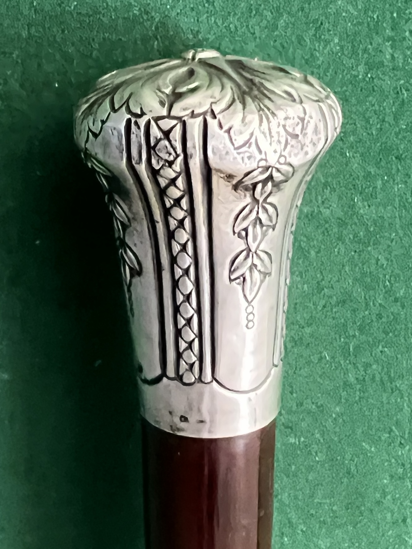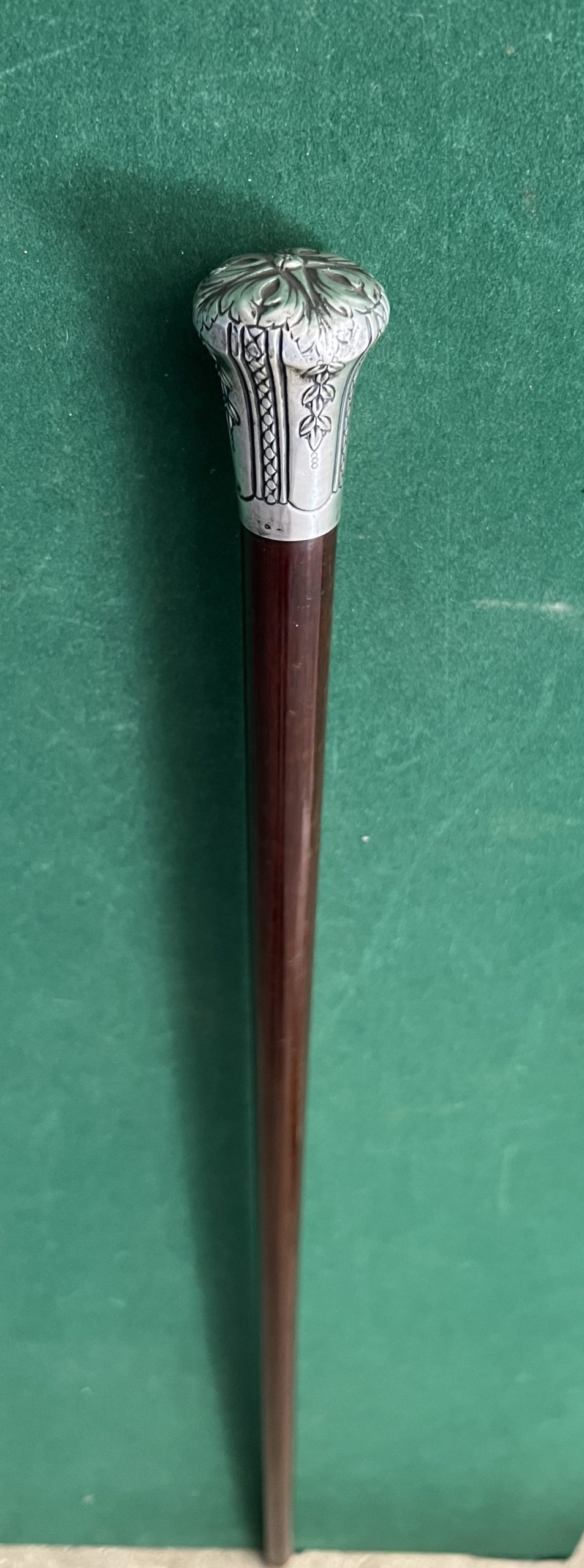 La poignée est en argent - le fût est en amourette - la férule en fer blanc et acier - longueur 84 cm - époque 19 ieme -