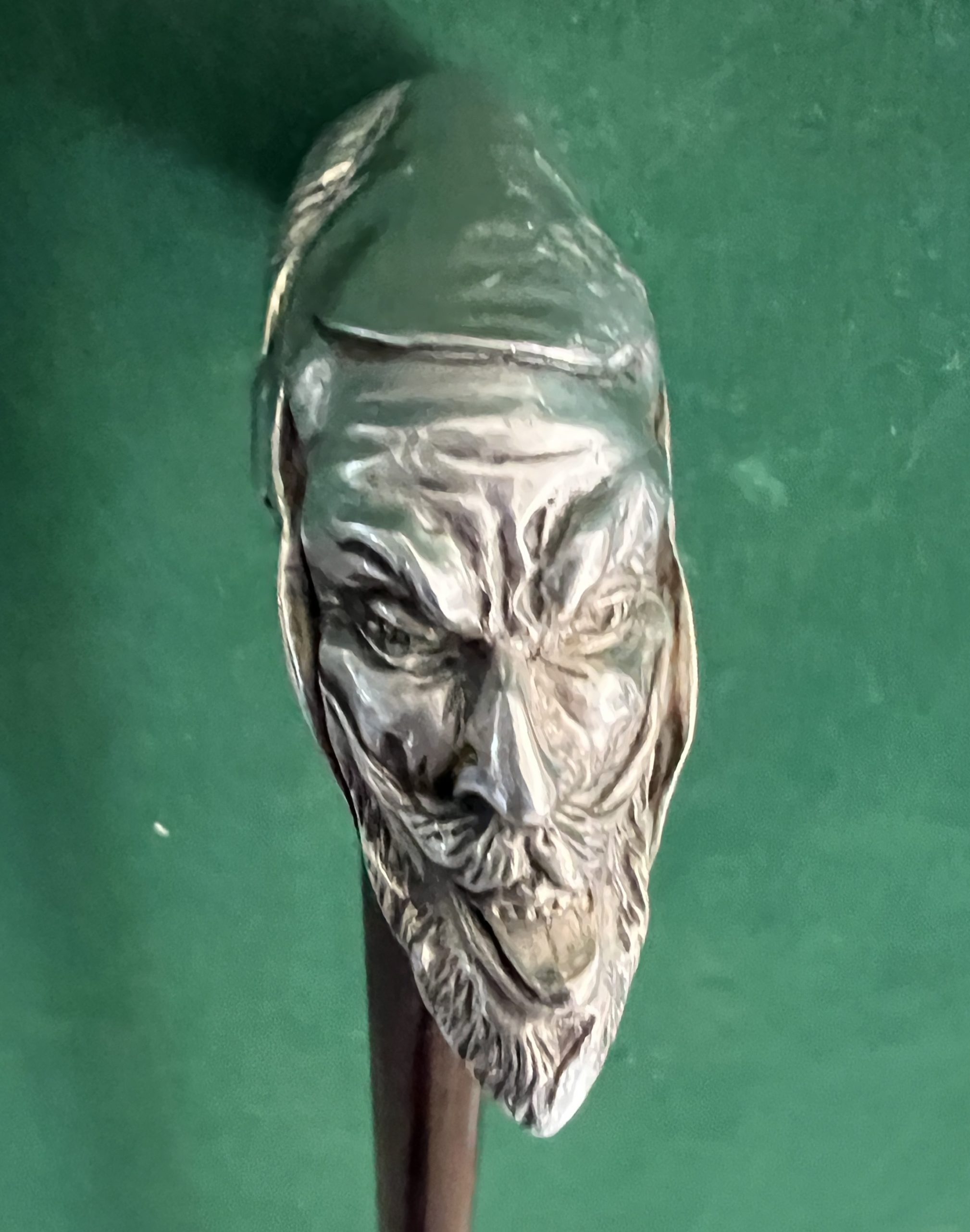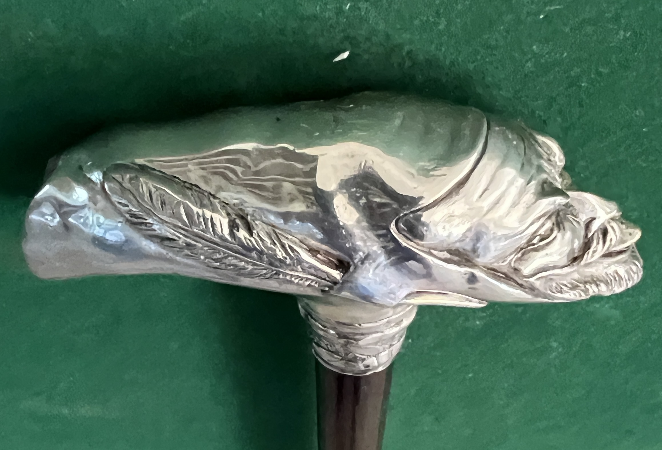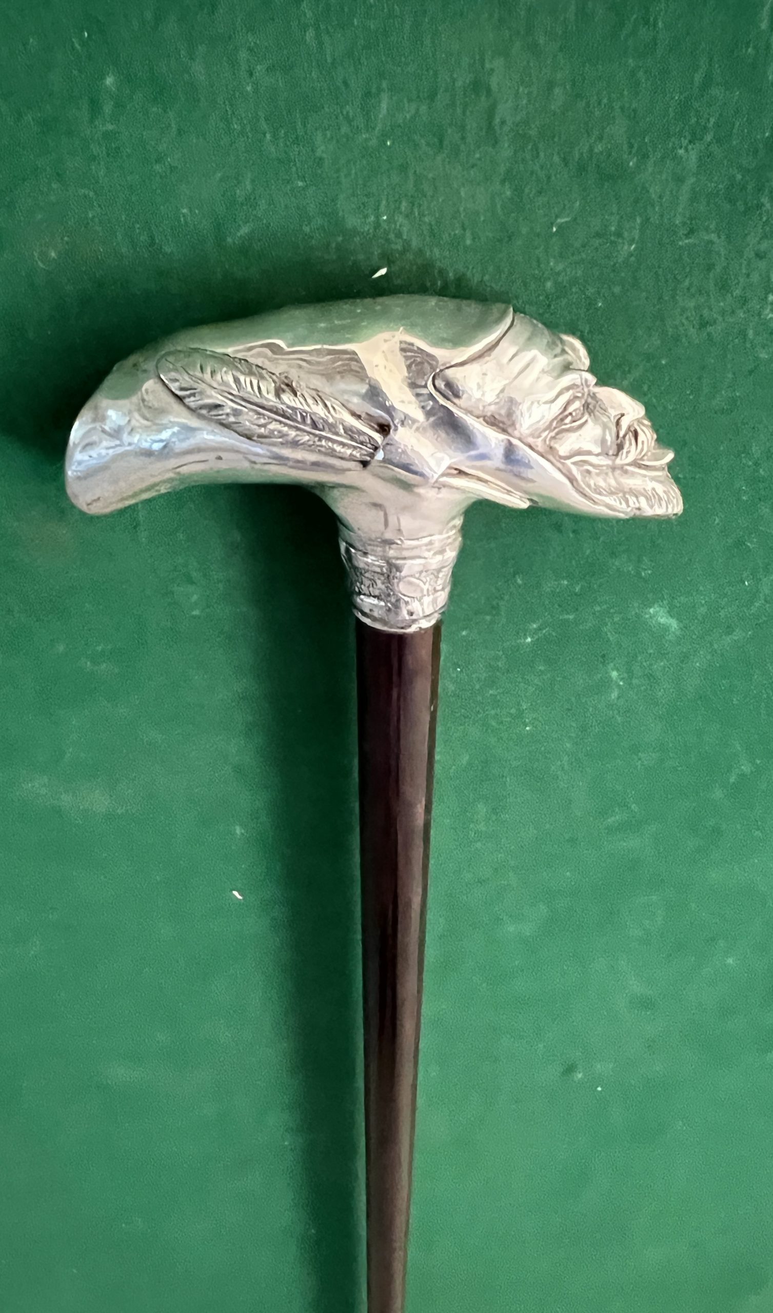 Très jolie canne en bronze argenté - beau travail de sculpture et de fondeur - le fût est très sûrement en palissandre - la férule est en cuivre et acier - époque début 20 ieme -longueur 92 - cm