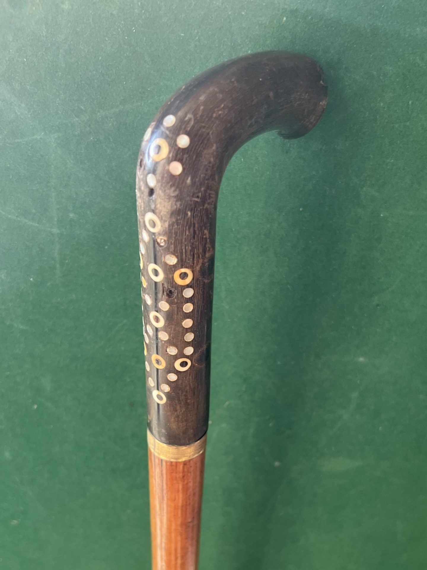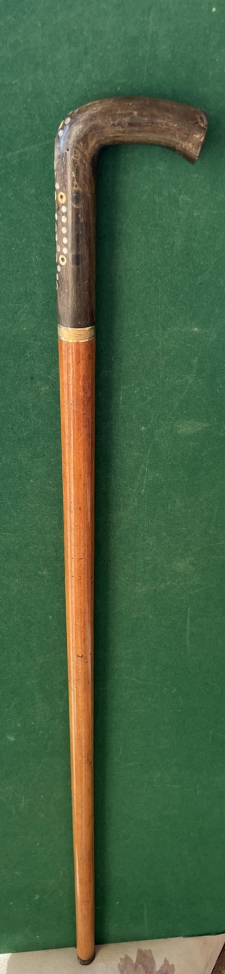 La poignée équerre est en corne avec des incrustations ( quelques manques) - la bague est en métal doré - le fût est en malaka - la férule en cuivre - la longueur est de 89 cm - époque fin 19 ieme début 20 ieme -