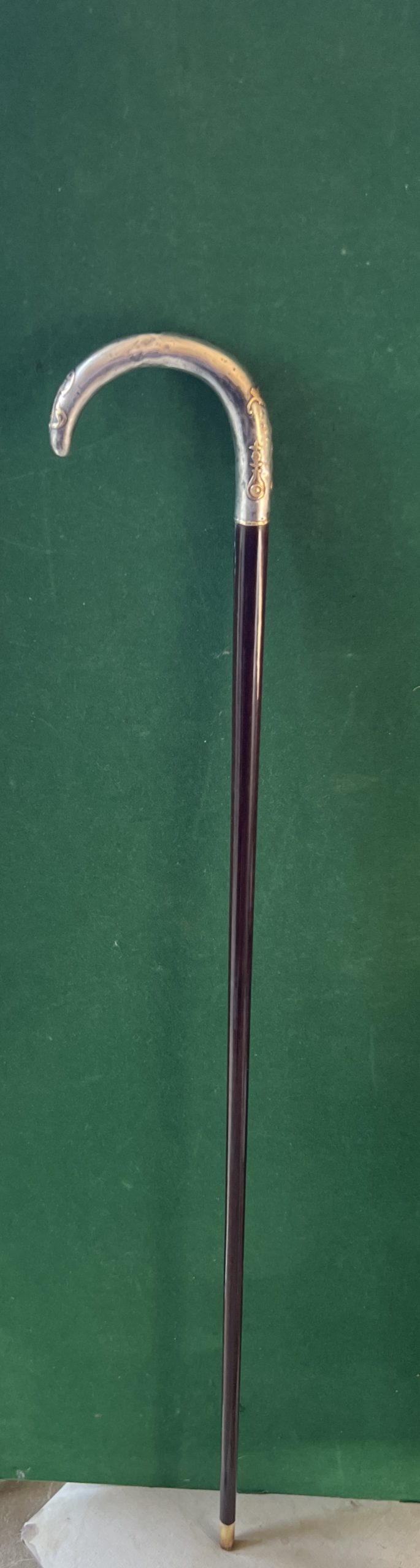 Le pommeau est en argent avec des incrustations en or (légèrement bosselé) - le fût est en très jolie bois d’amourette - la férule est en corne blonde - la longueur est de 91 cm - époque 19 ieme