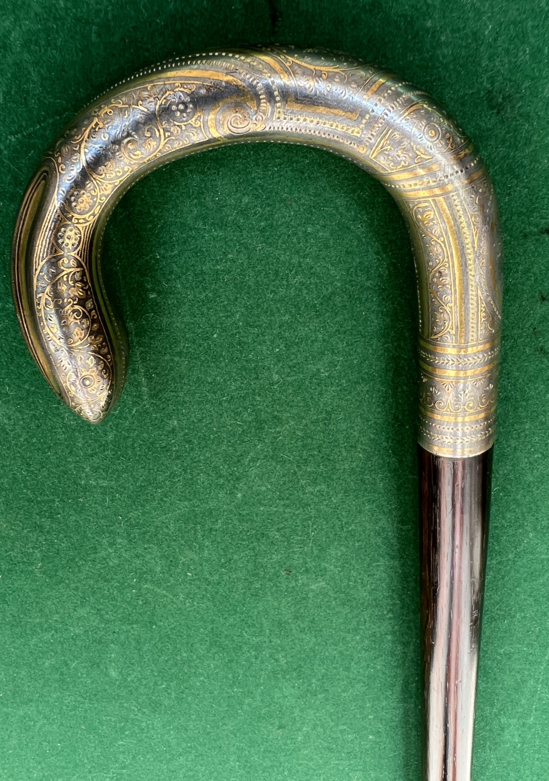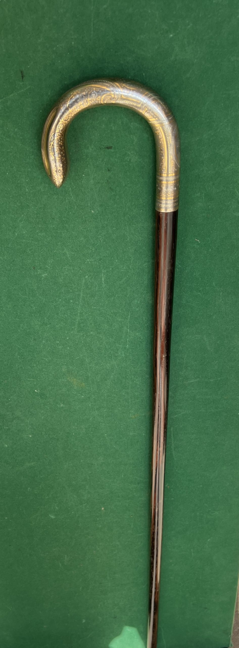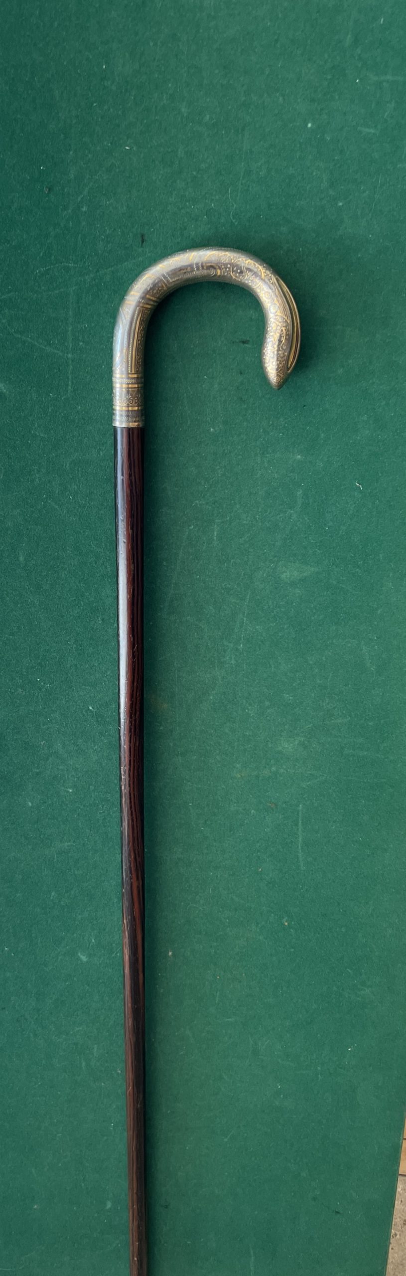 Le pommeau est en argent avec des ciselures doré à l’or- le fût est en palissandre - la férule en cuivre - la longueur est de 88 cm - époque fin 19 ieme