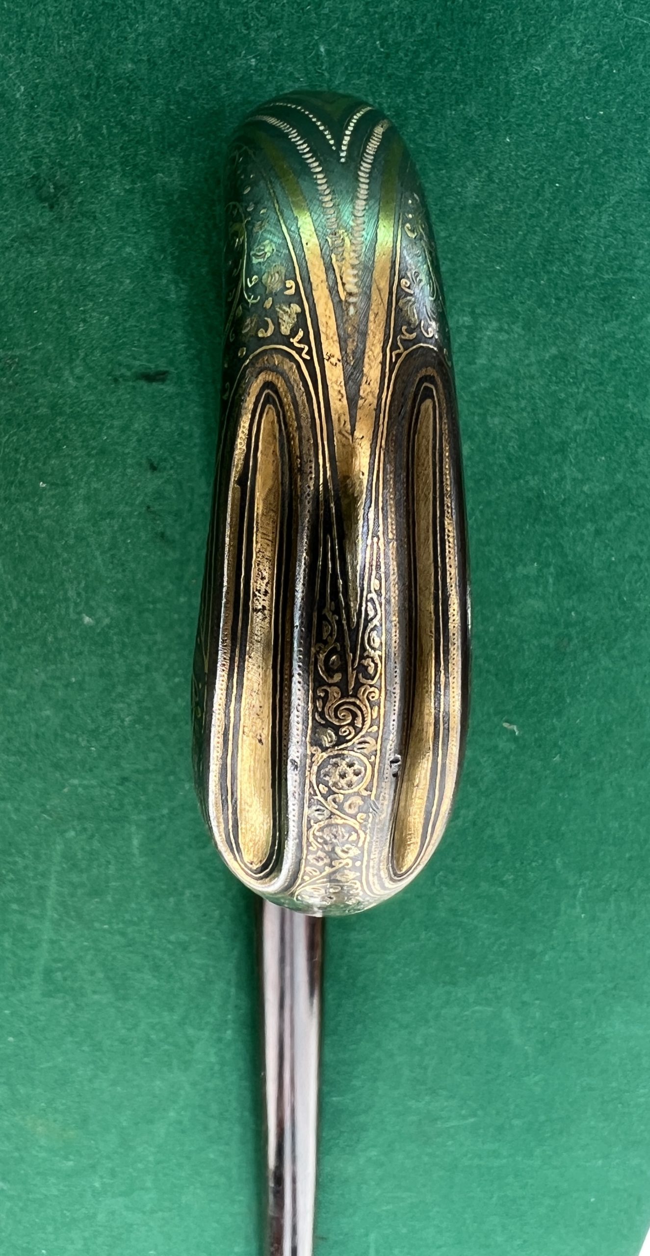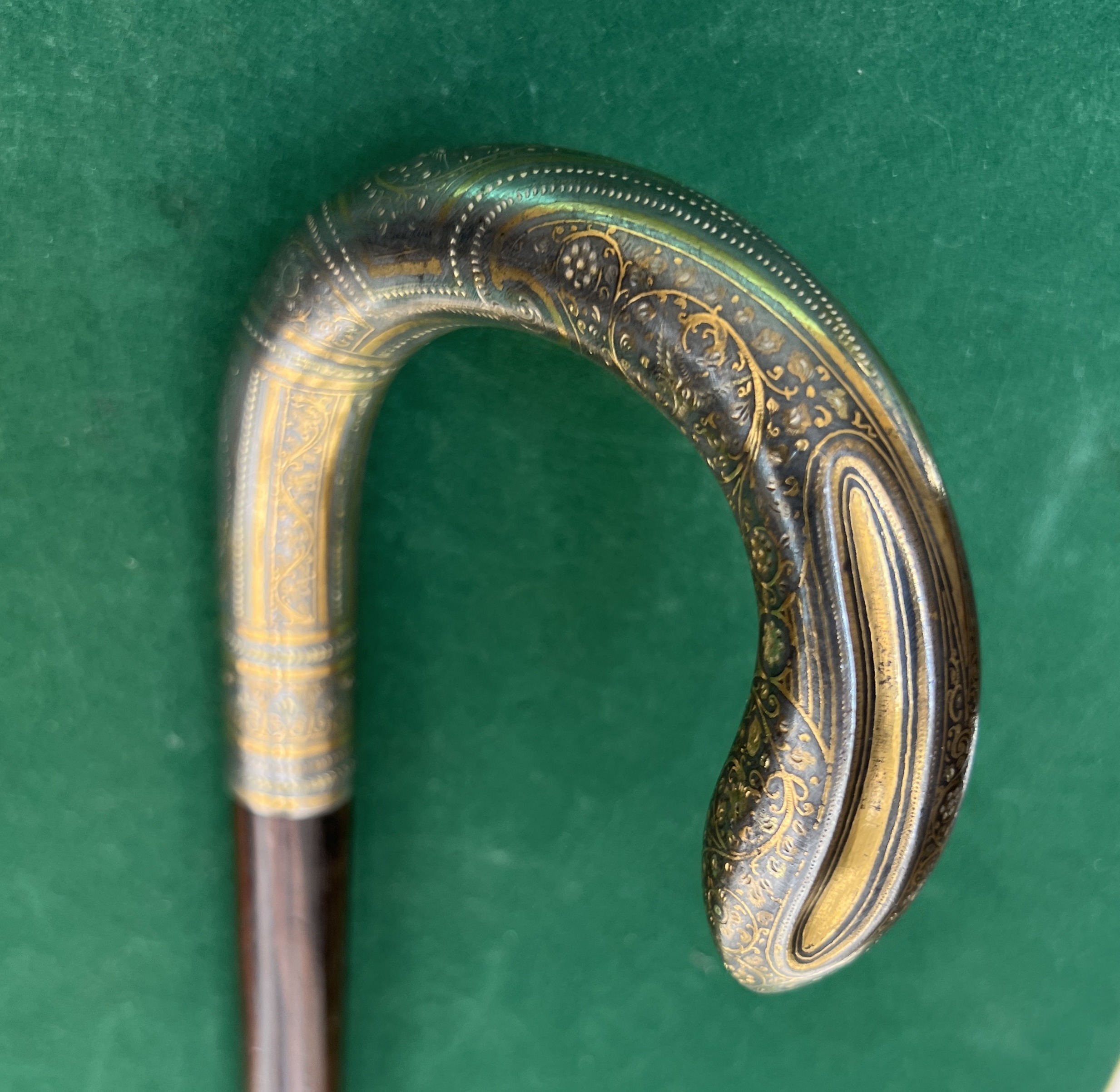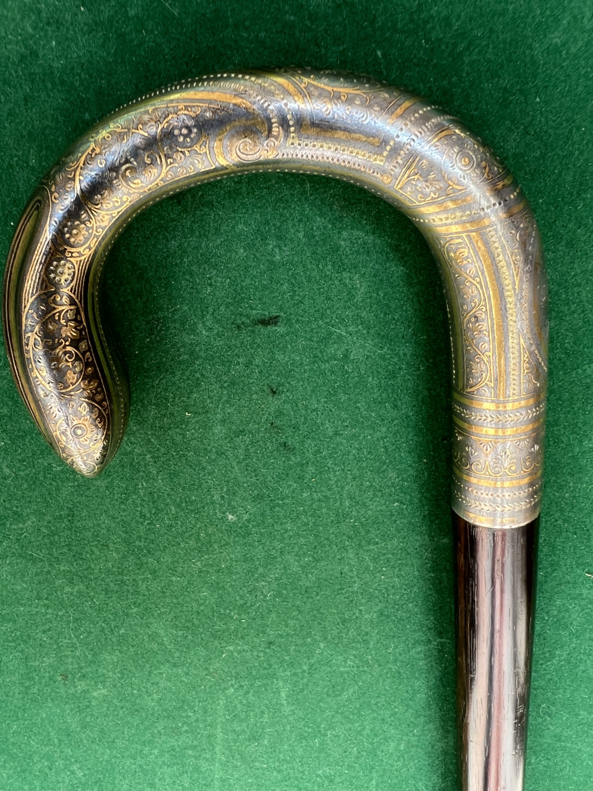 Le pommeau est en argent avec des ciselures doré à l’or- le fût est en palissandre - la férule en cuivre - la longueur est de 88 cm - époque fin 19 ieme