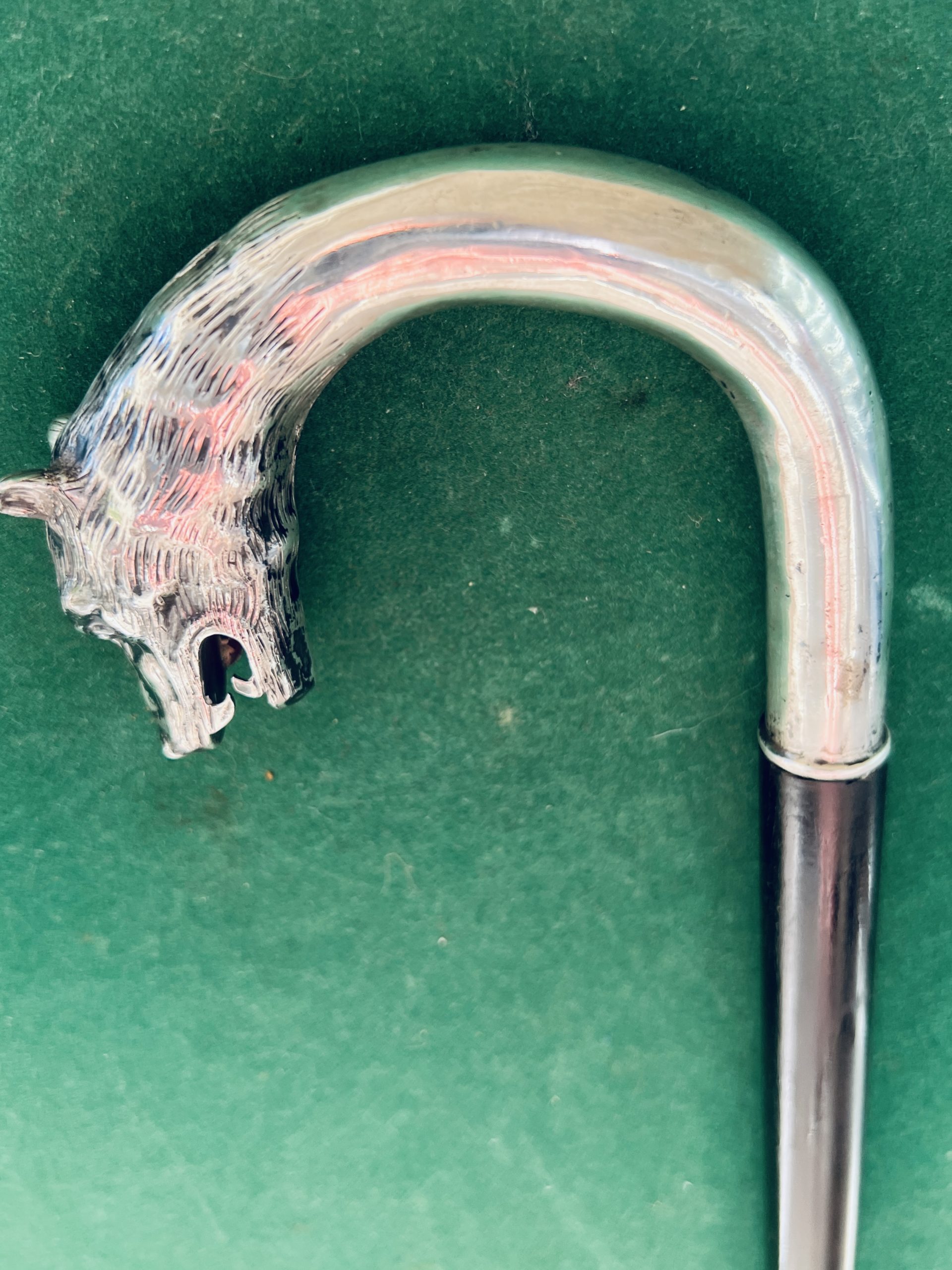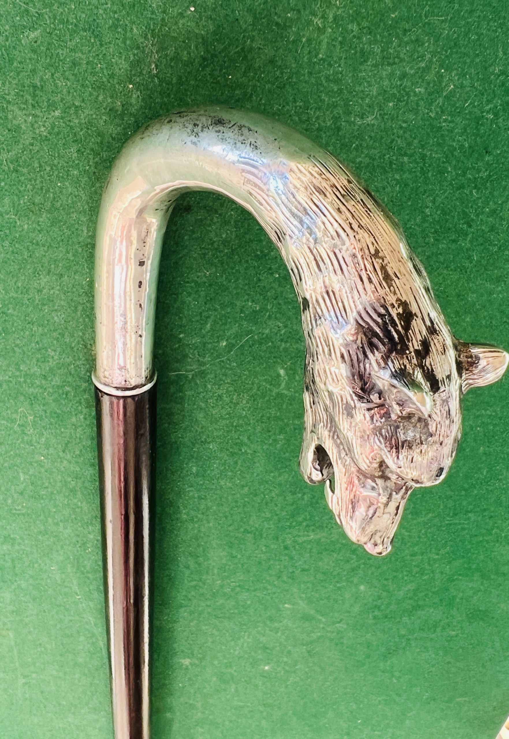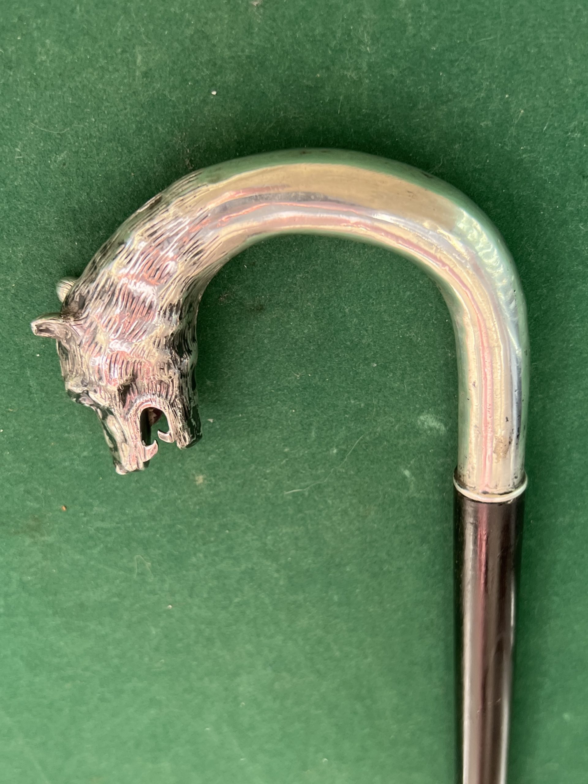 Très jolie canne corbin en argent représentant un loup - le fût est en bois laqué noir - la férule est en fer blanc et acier - la longueur est de 93 cm - époque 19 ieme -
