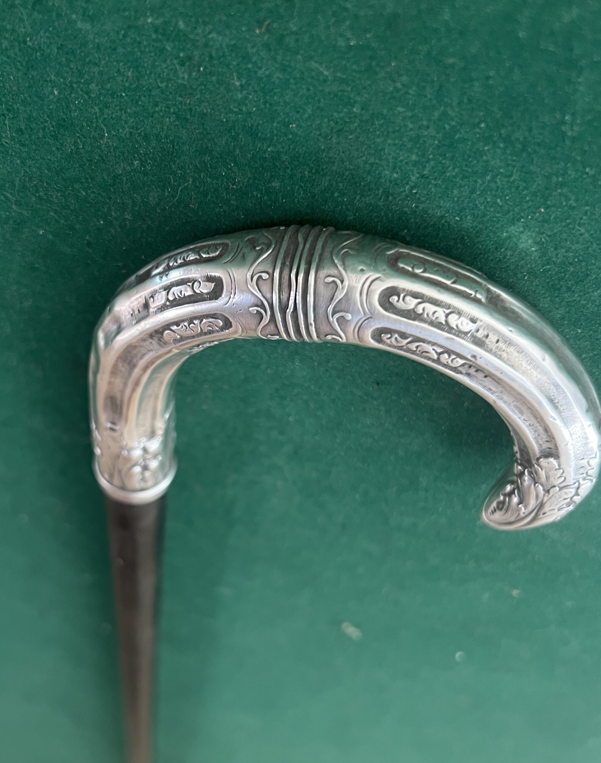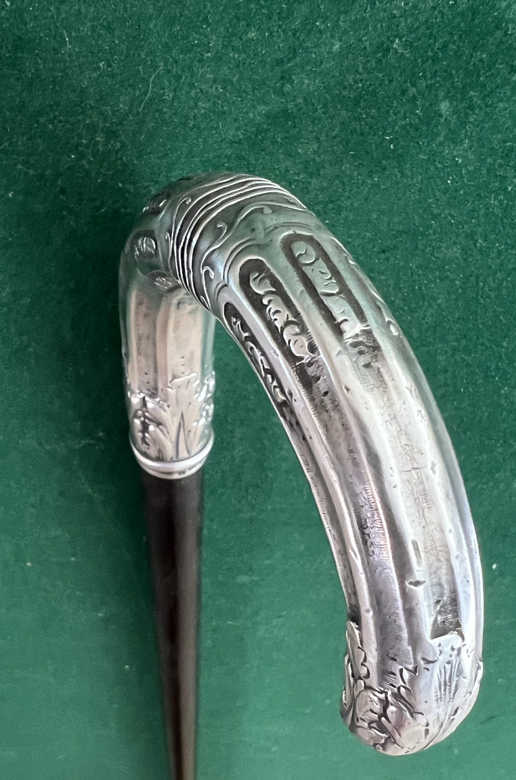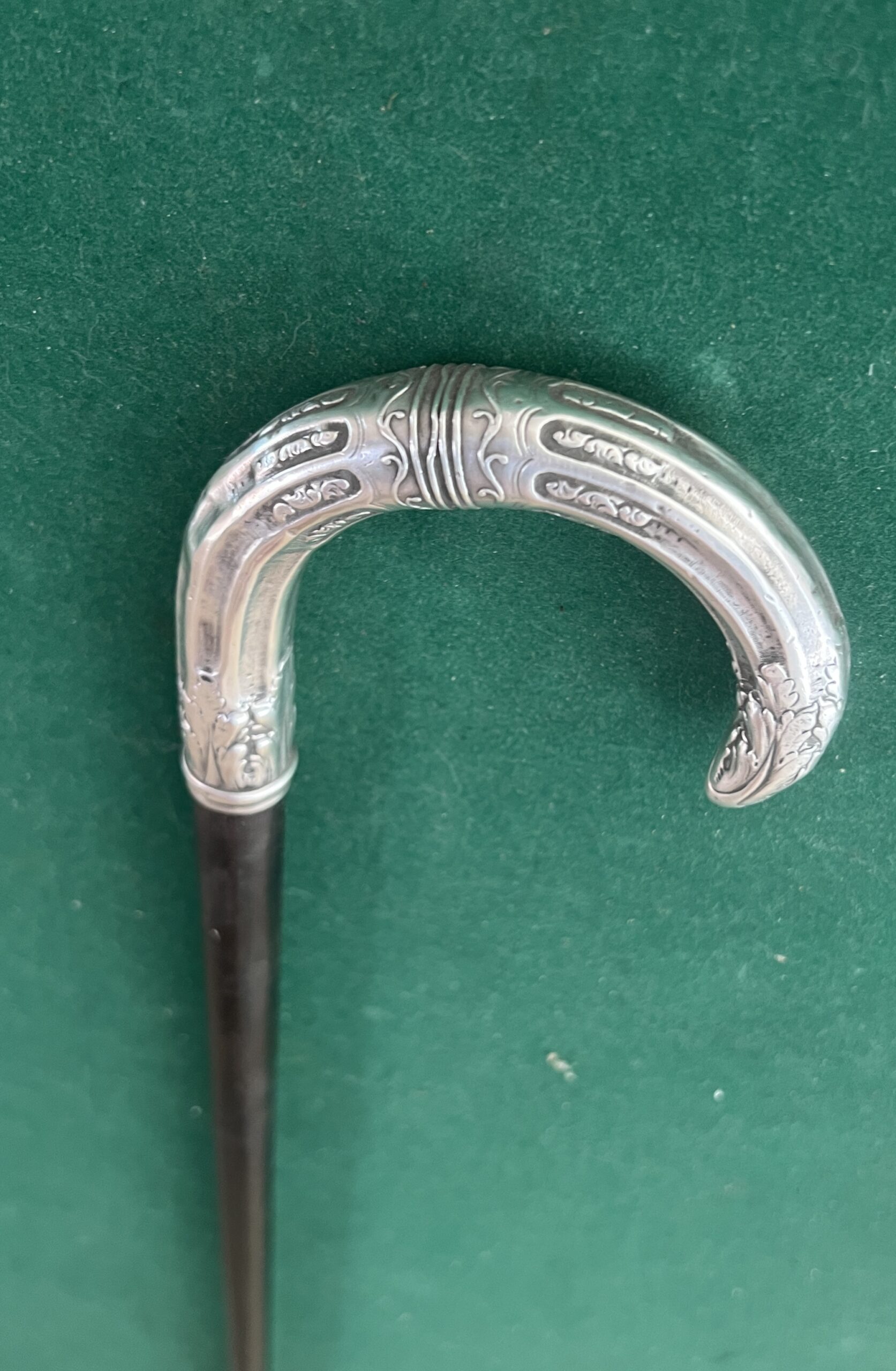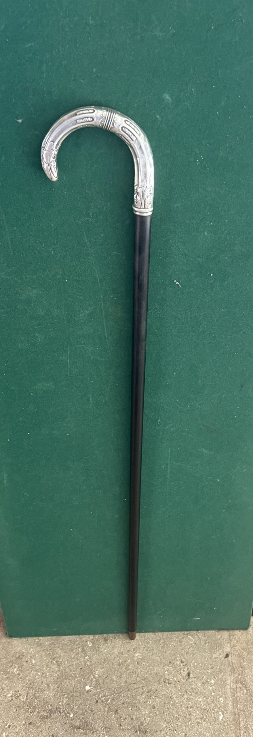 le pommeau est en argent joliment travaillé - le fût est en bois laqué noir - la férule est en cuivre talon en acier - la longueur est de 84 cm - époque première partie du vingtième -