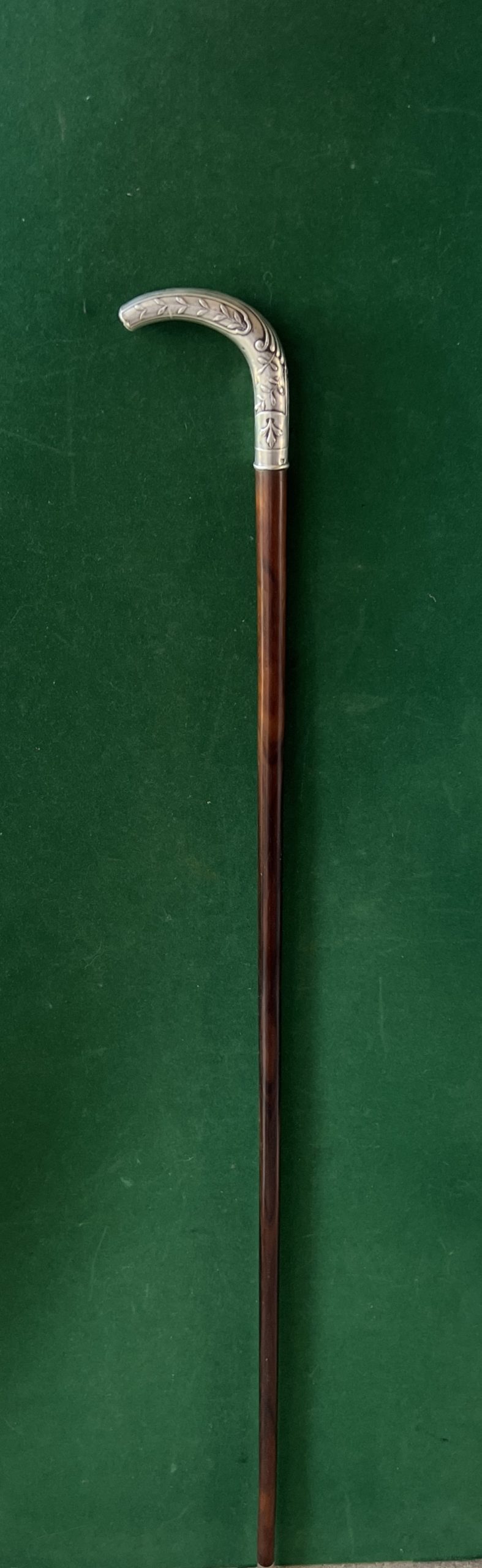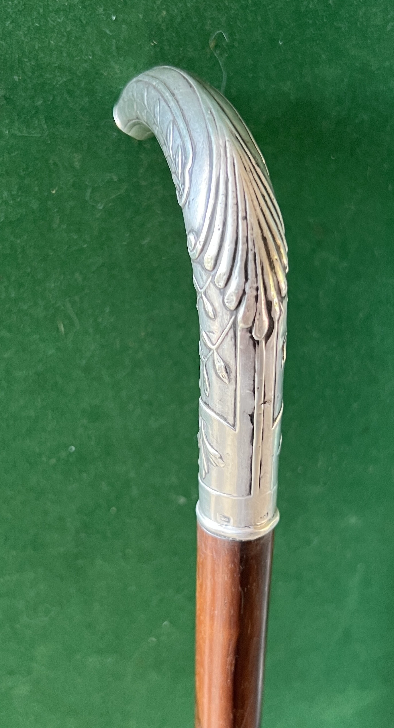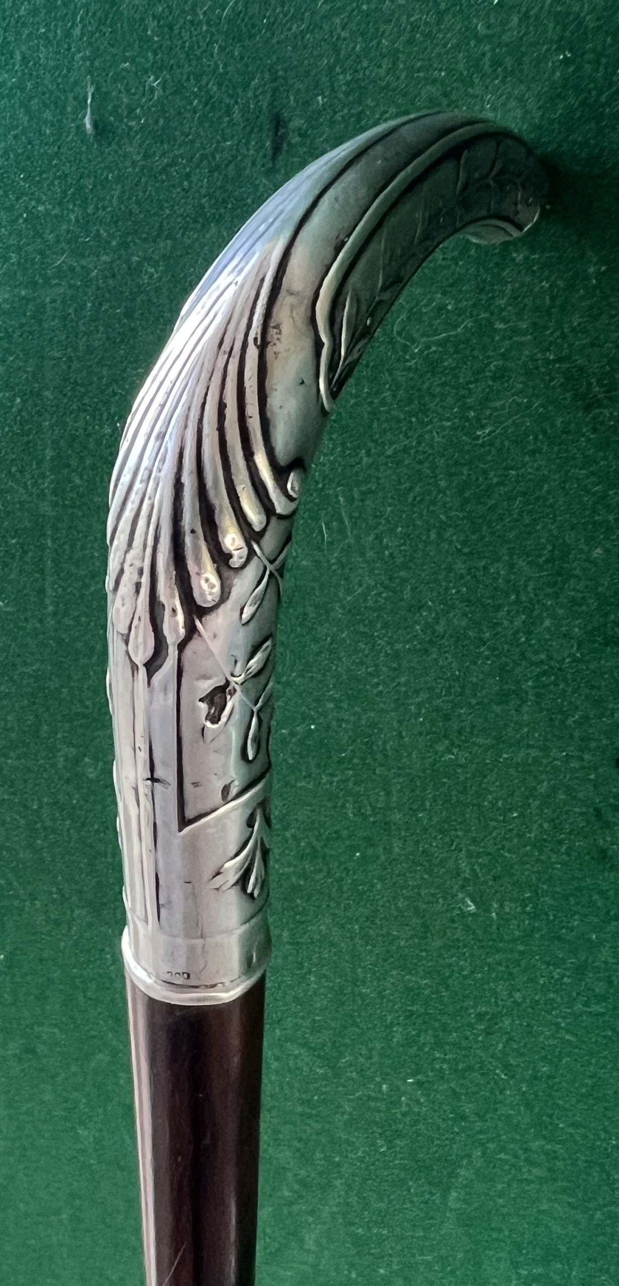 Le pommeau est en argent à décors de feuillages - le fût est en palissandre - la férule en fer blanc et acier - ( Restoration sur le bout du pommeau ) - la longueur est de 90 cm - époque dix neuf cent -