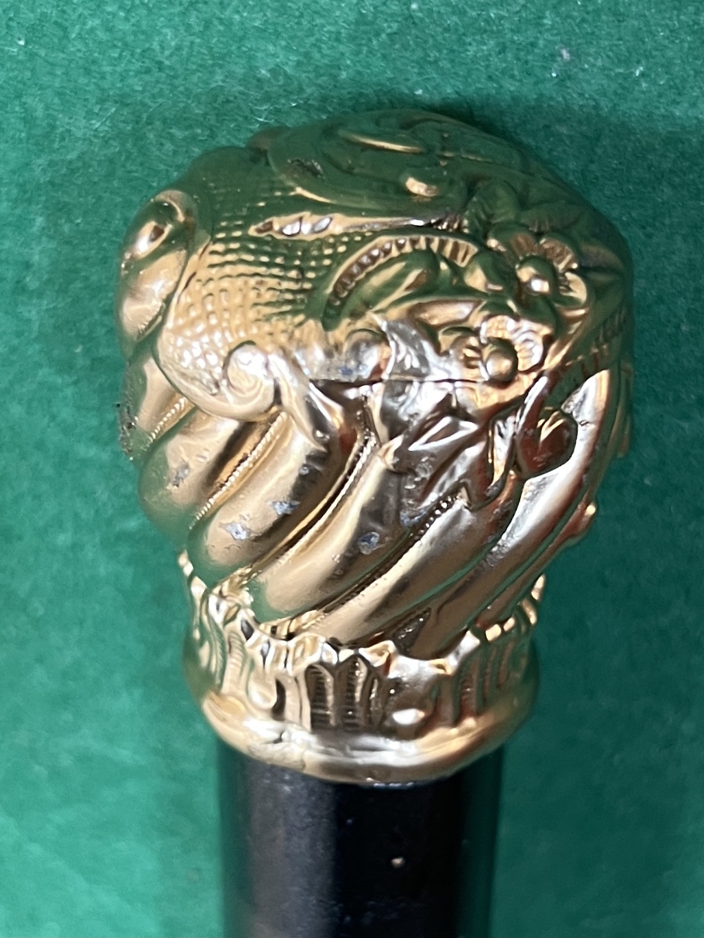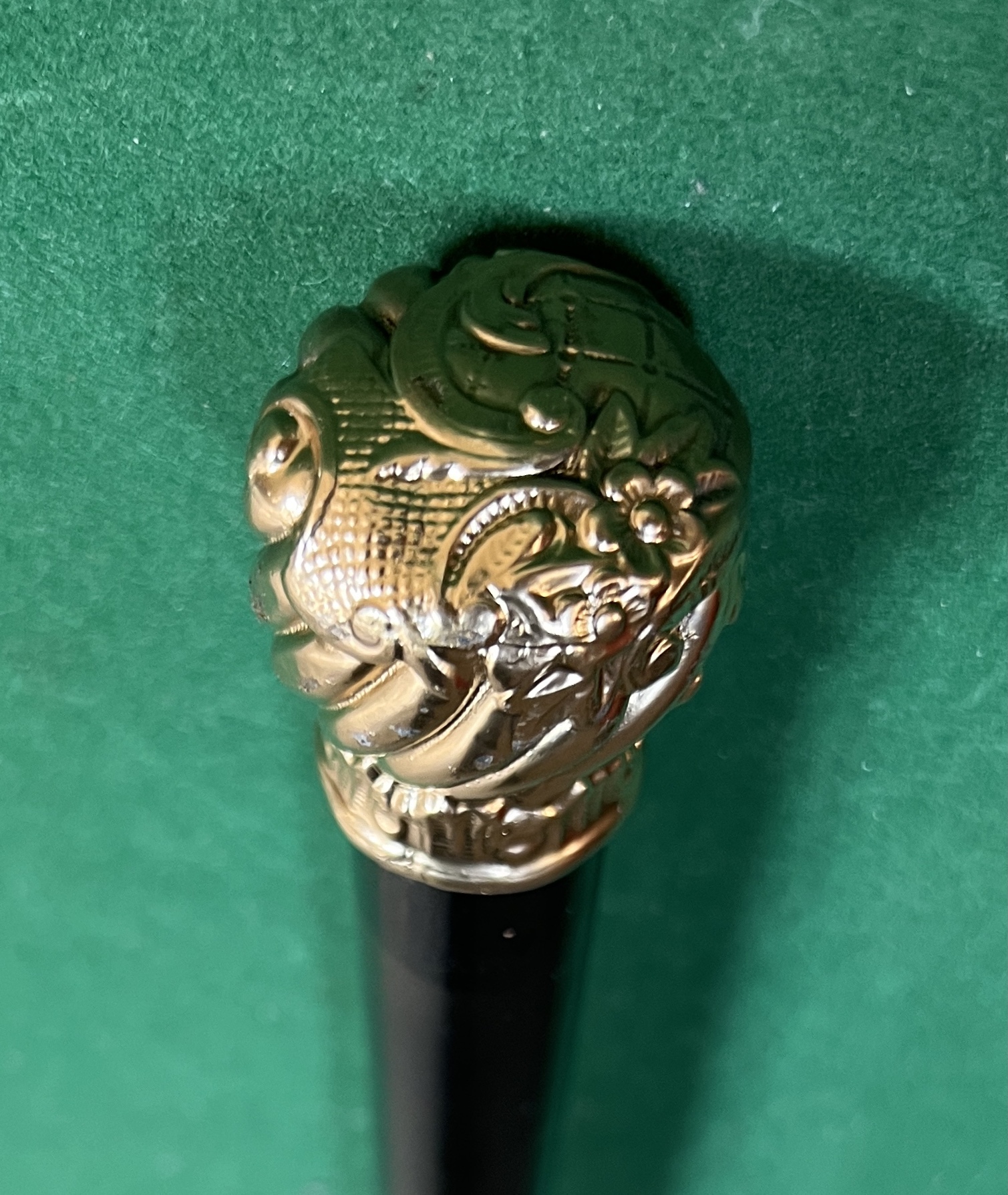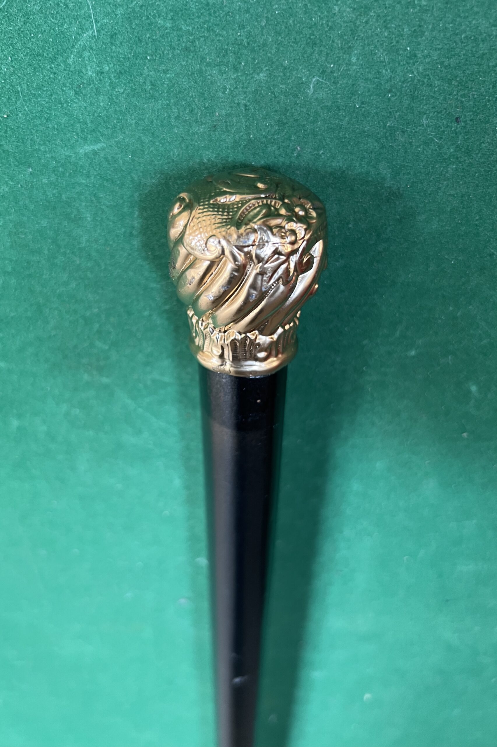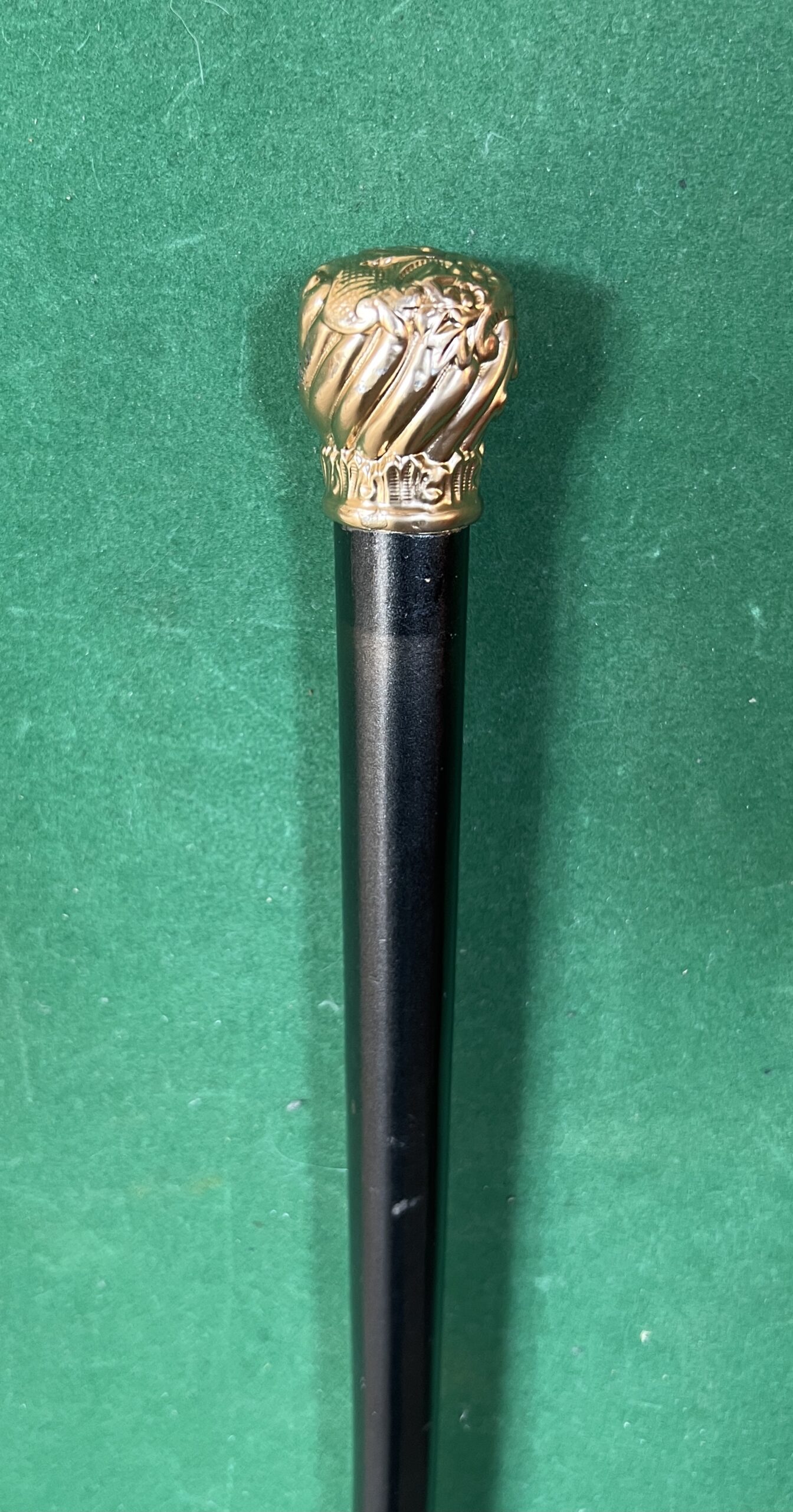 Le pommeau est doré - le fût est en malaka laqué noir - la férule est en cuivre ( usure) la longueur est de 90 cm - époque début 20 ieme -