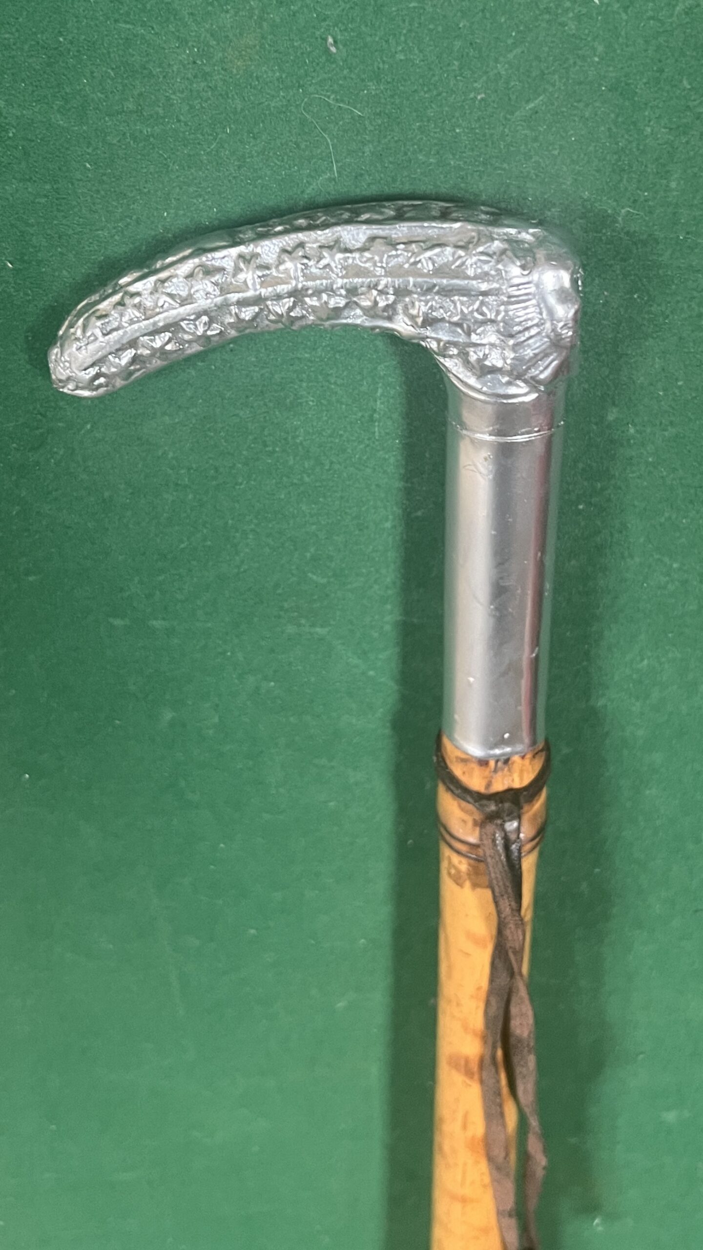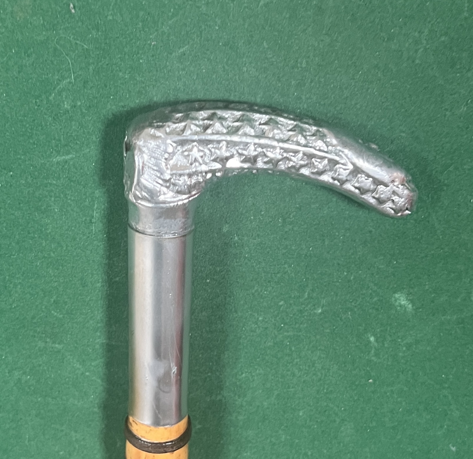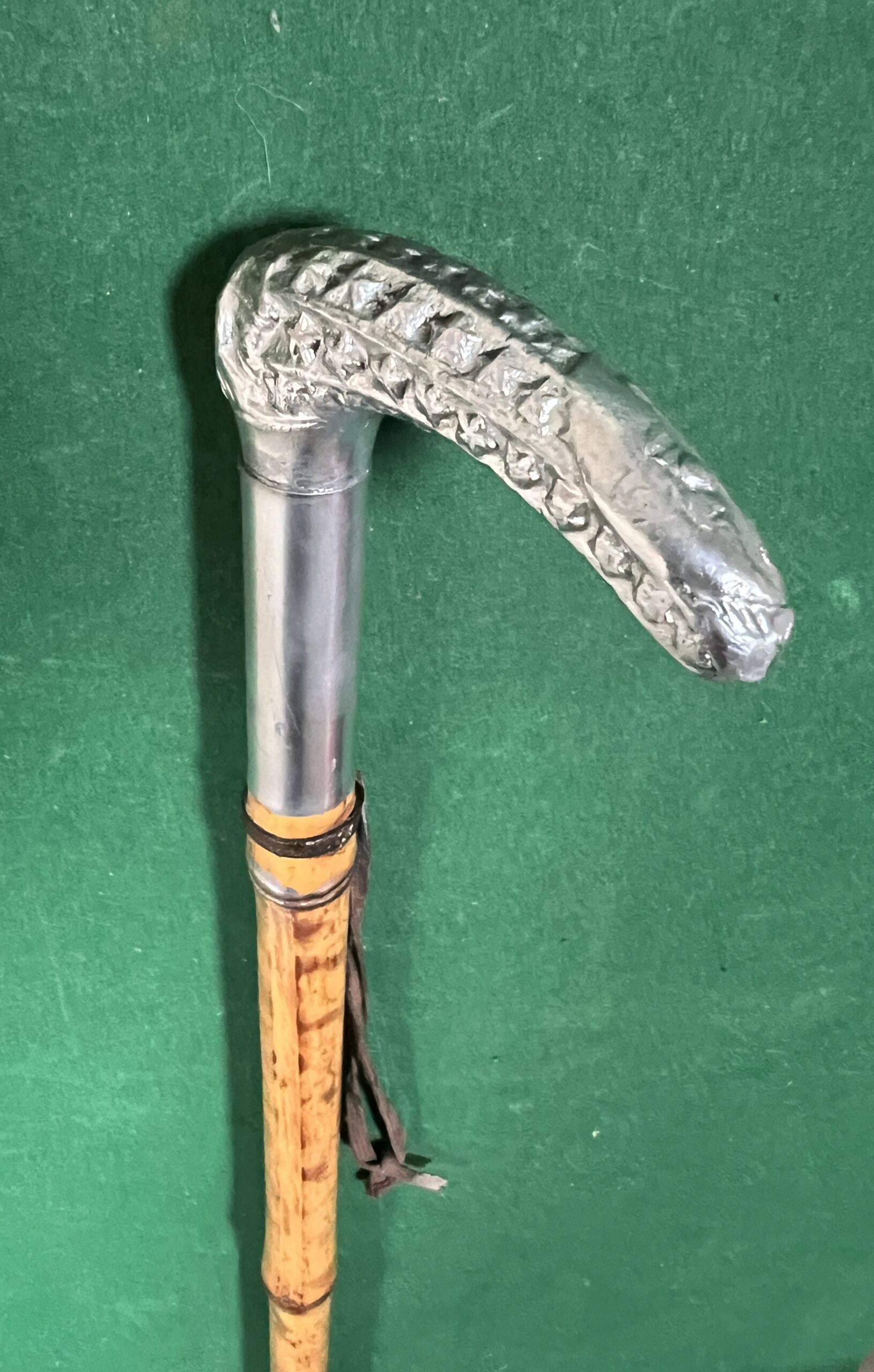 Le pommeau équerre est en métal argenté - le fût est en bambou - la férule en cuivre - la longueur est de 92 cm - époque 20 ieme -