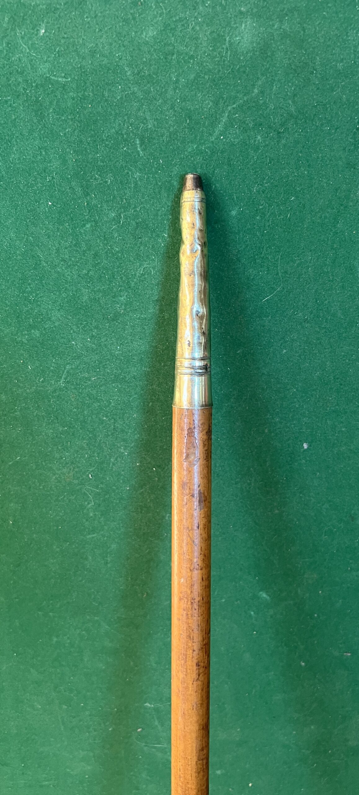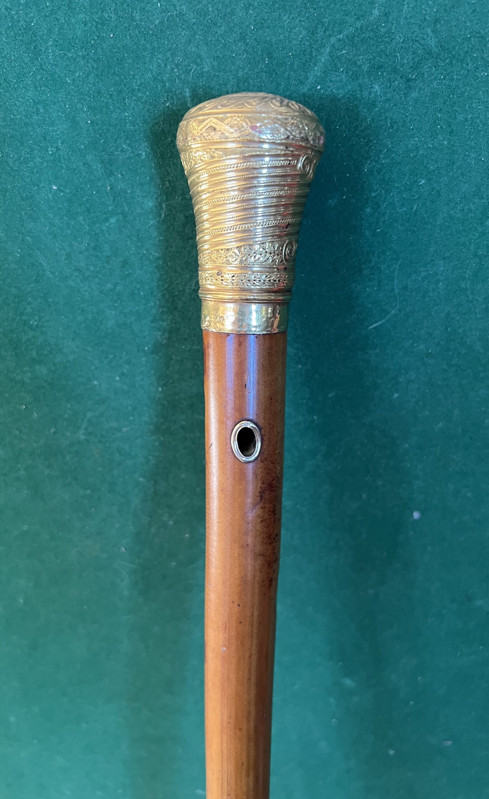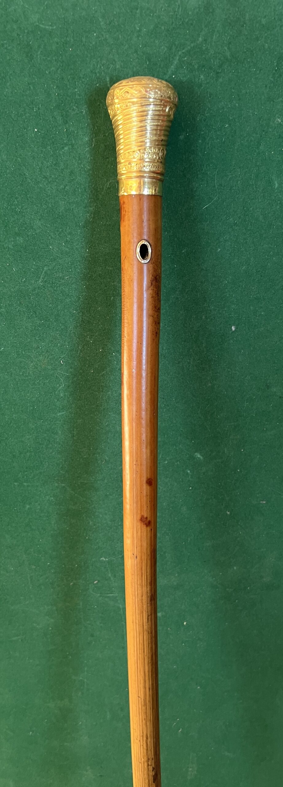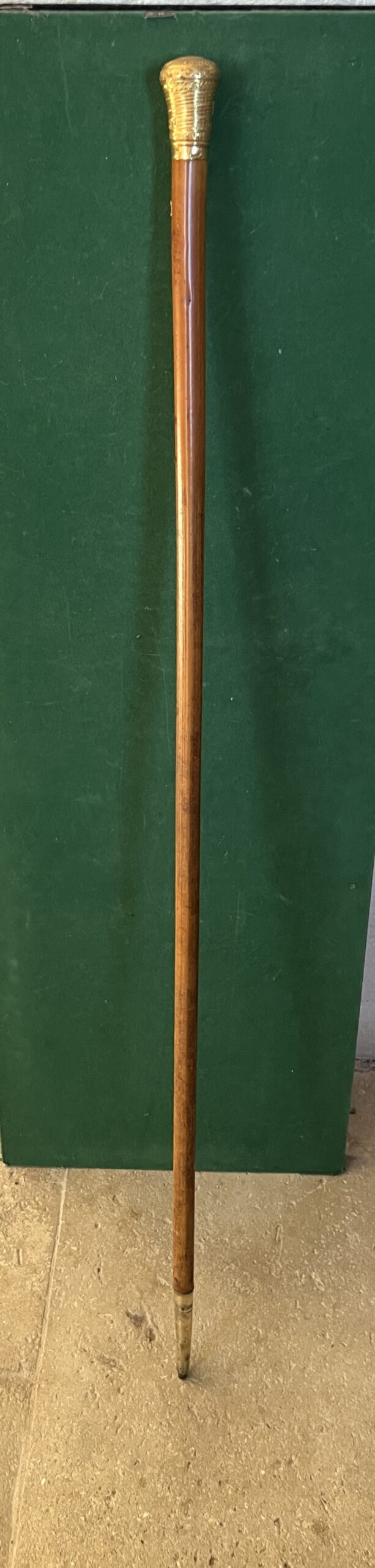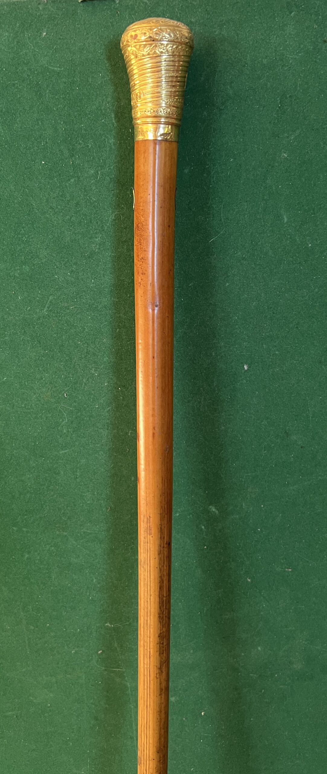 Le pommeau est en or ainsi que le passage de dragonne - le fût est en malaka - la férule est en cuivre et le bout en acier elle mesure 12 cm (usure) - la longueur est de 123 cm - époque début 18 ieme