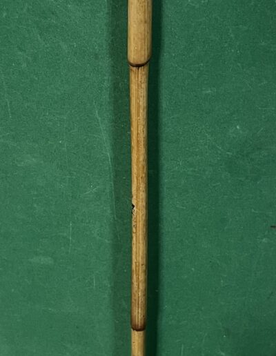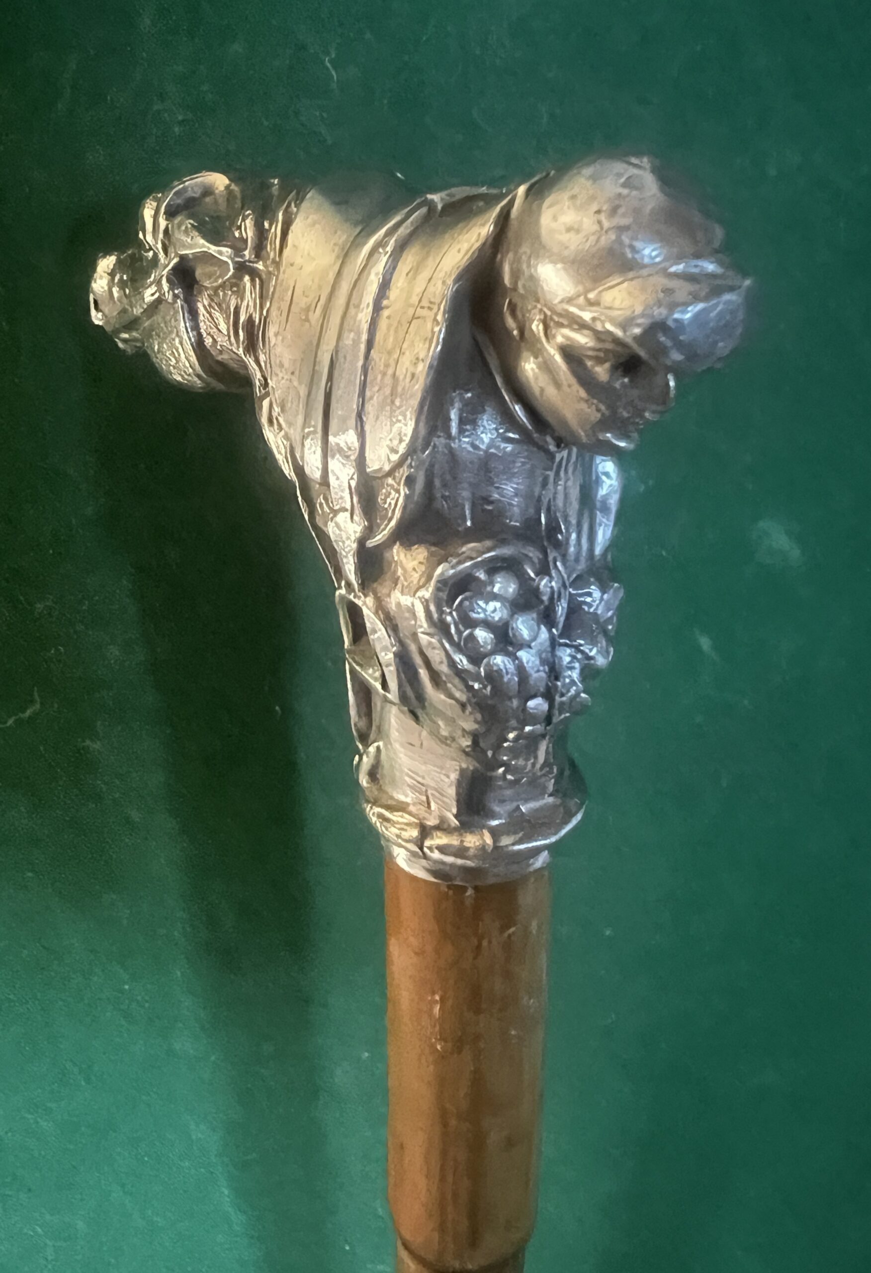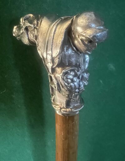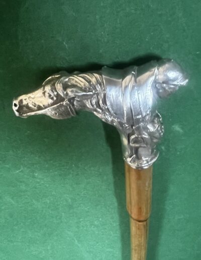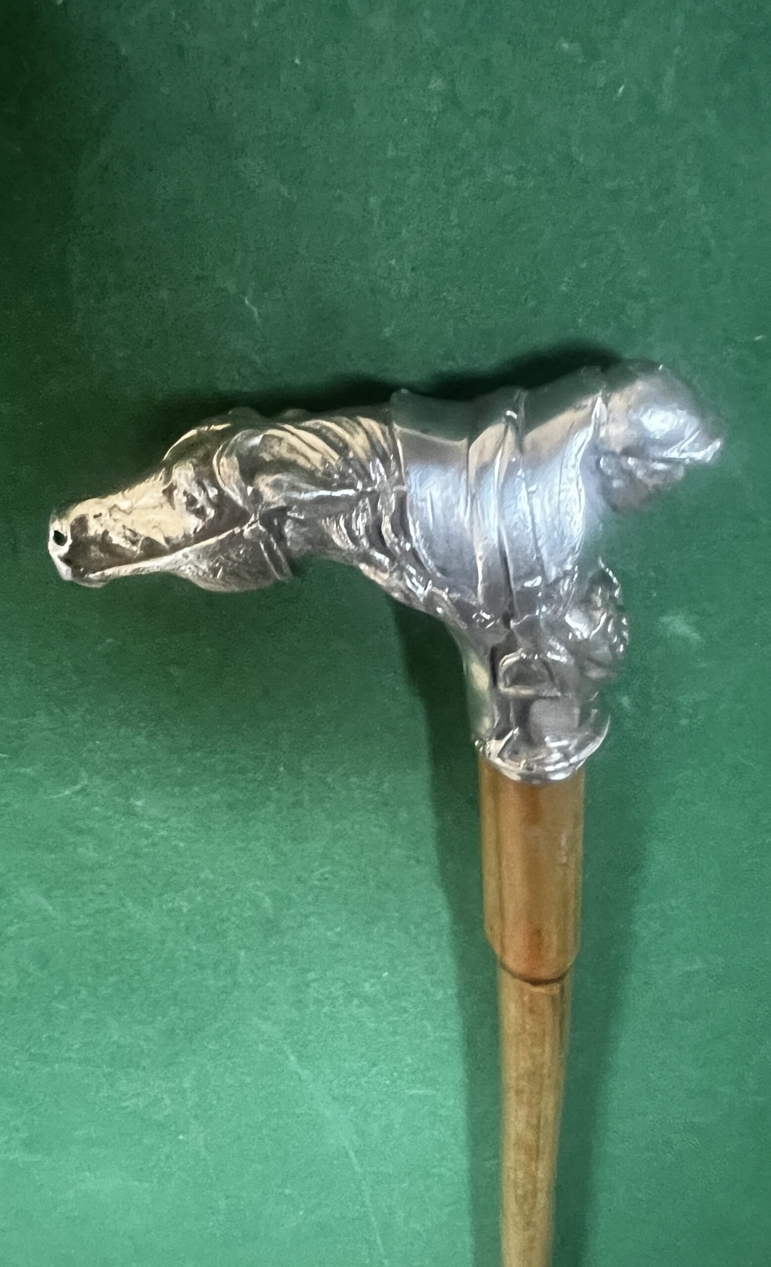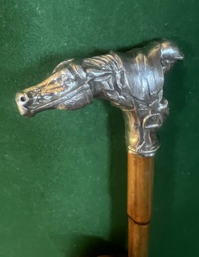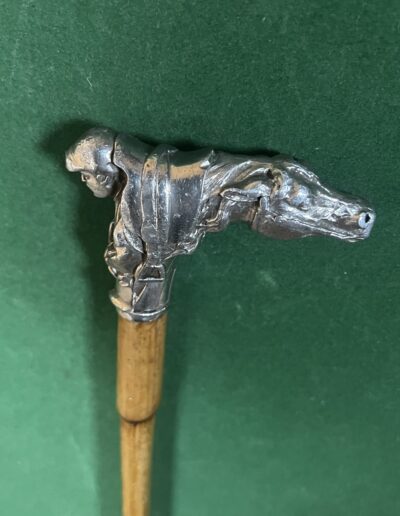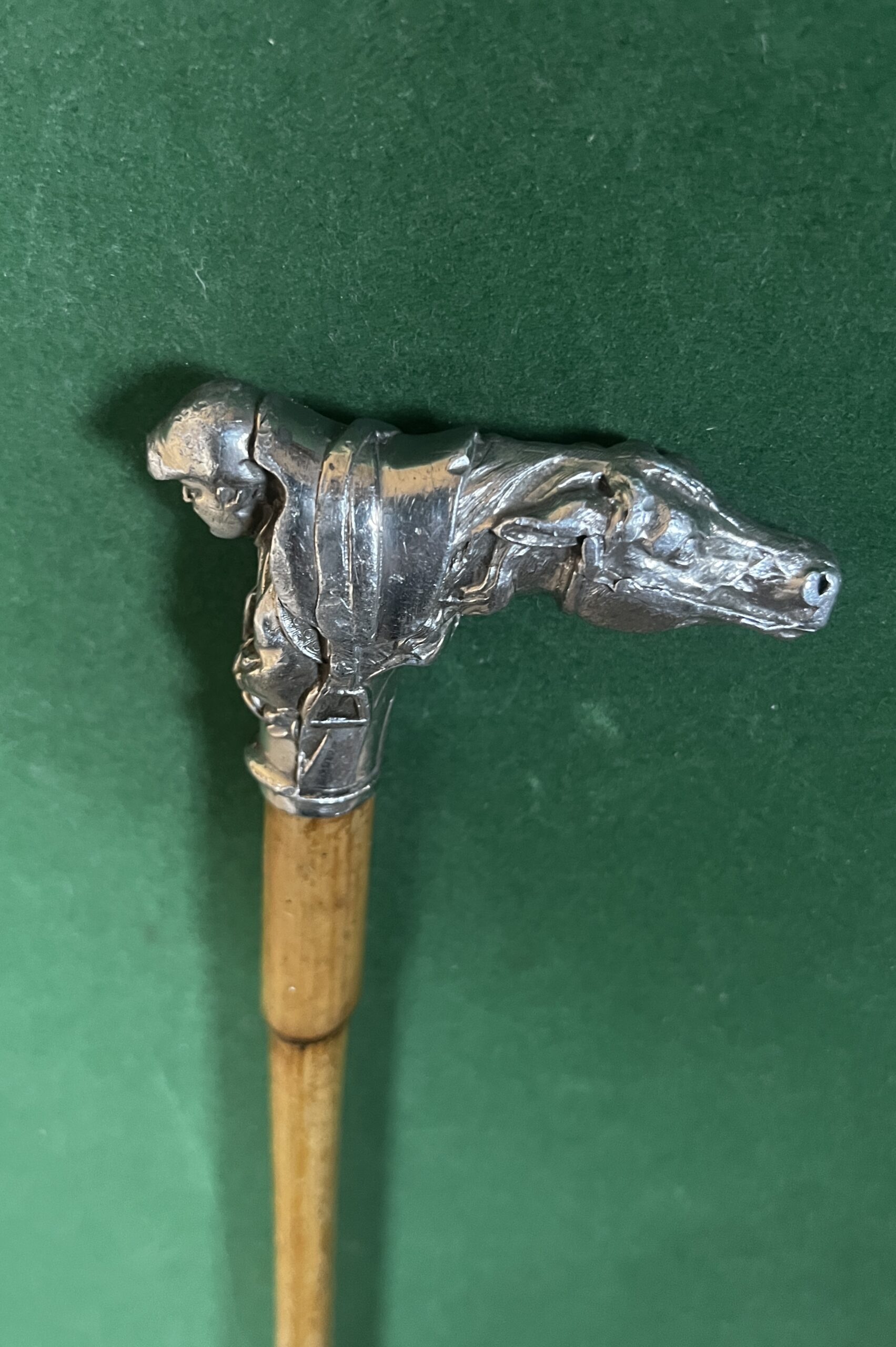 le pommeau représente un jockeys et un cheval il est en métal - le fût est en bambou - la férule est en fer blanc et talon en acier - la longueur est de 90 cm - époque première partie du vingtième