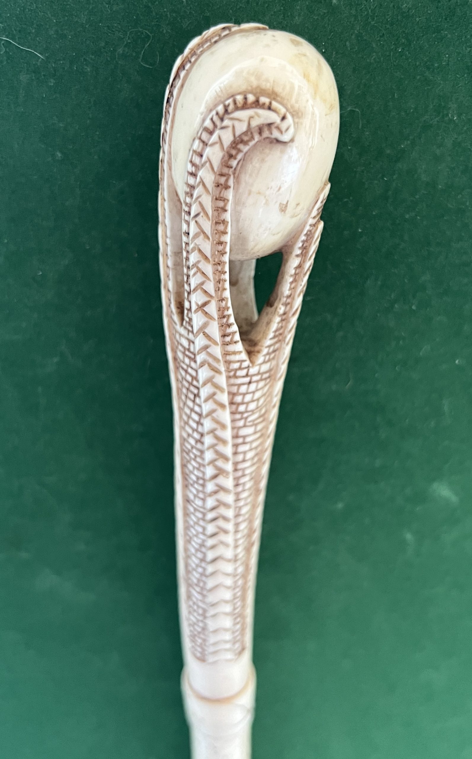 Le pommeau est en ivoire représente une serre d’aigle tenant un œuf - la bague en ivoire a été changée - le fût est en os de baleine / la férule en cuivre - époque 19 ieme -