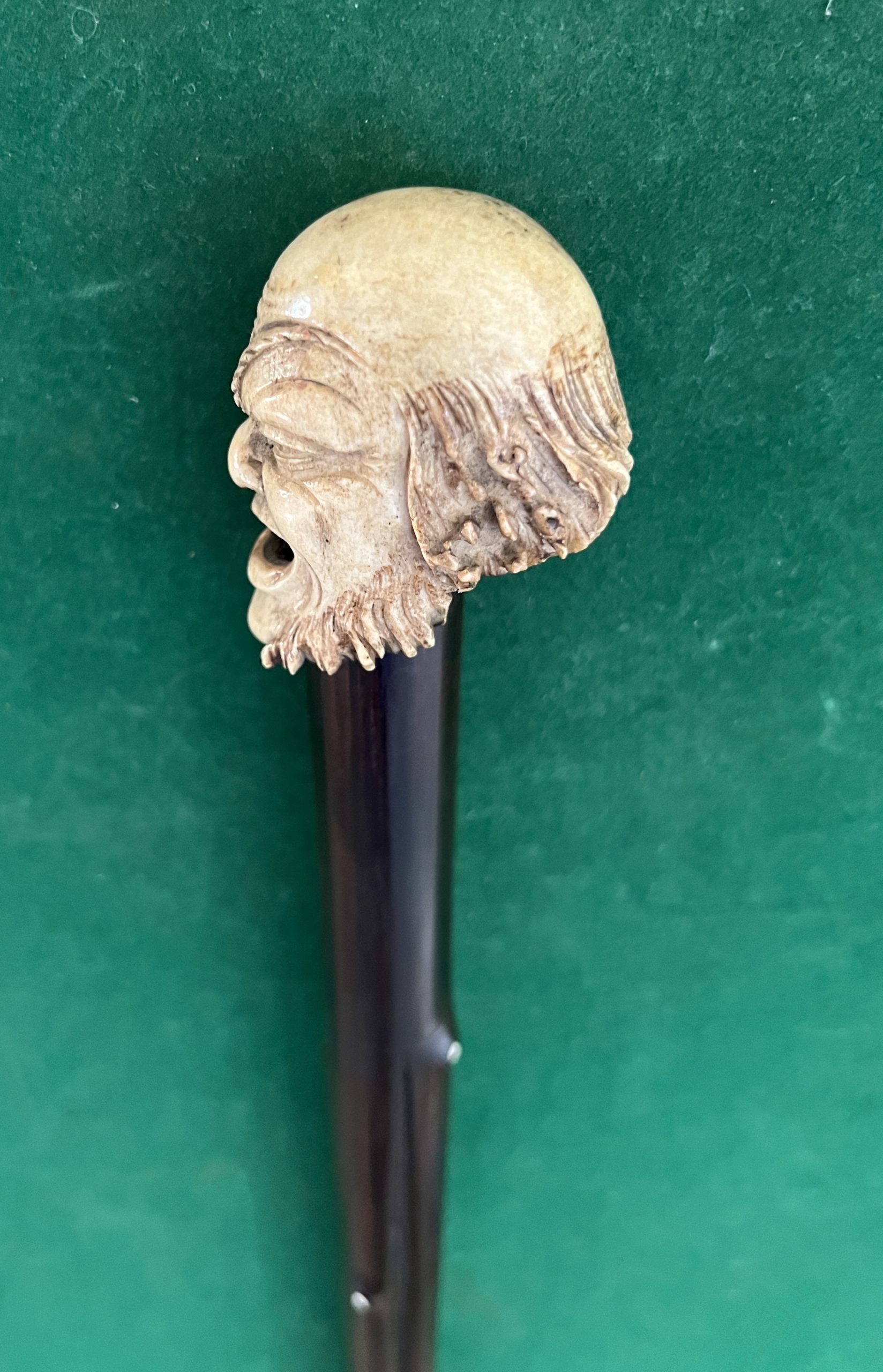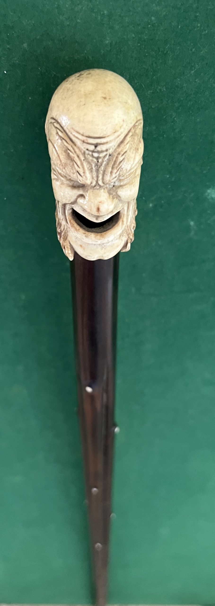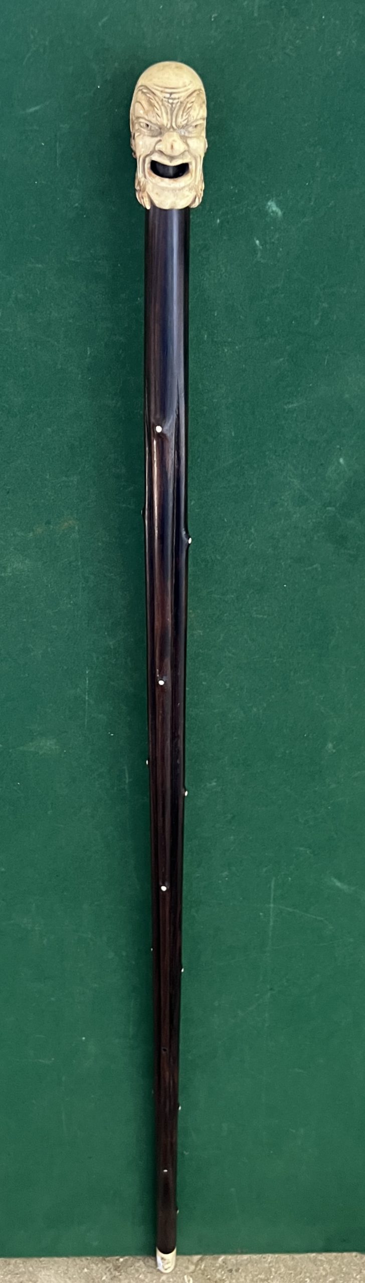 Le pommeau est en os - le fût de très belle qualité est sûrement en palissandre la partie centrale est creusée pour donner l’effet d’une racine des petits cabochons avec des perles sont tous le long du fût la férule est en os - longueur 90 cm - époque début 19 ieme -