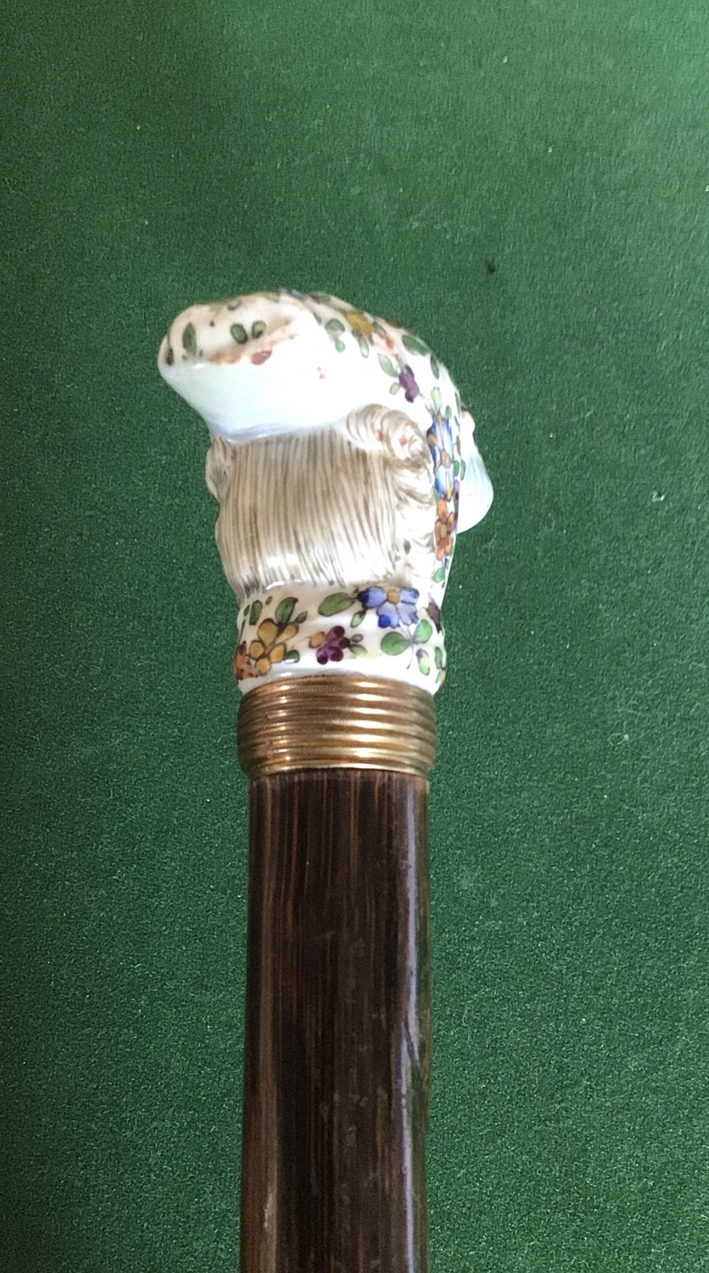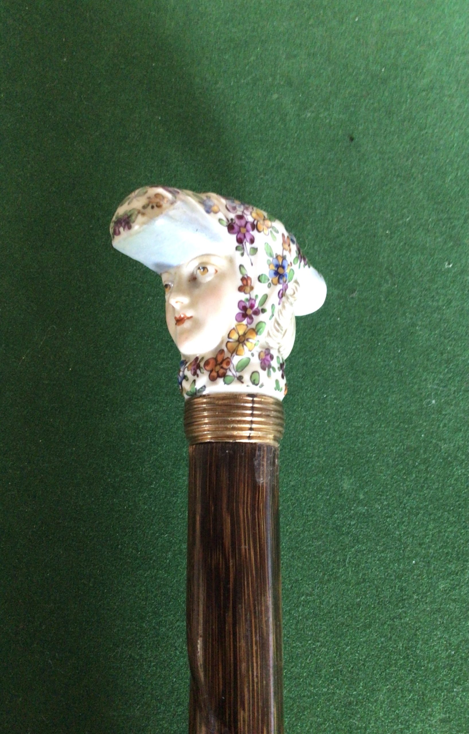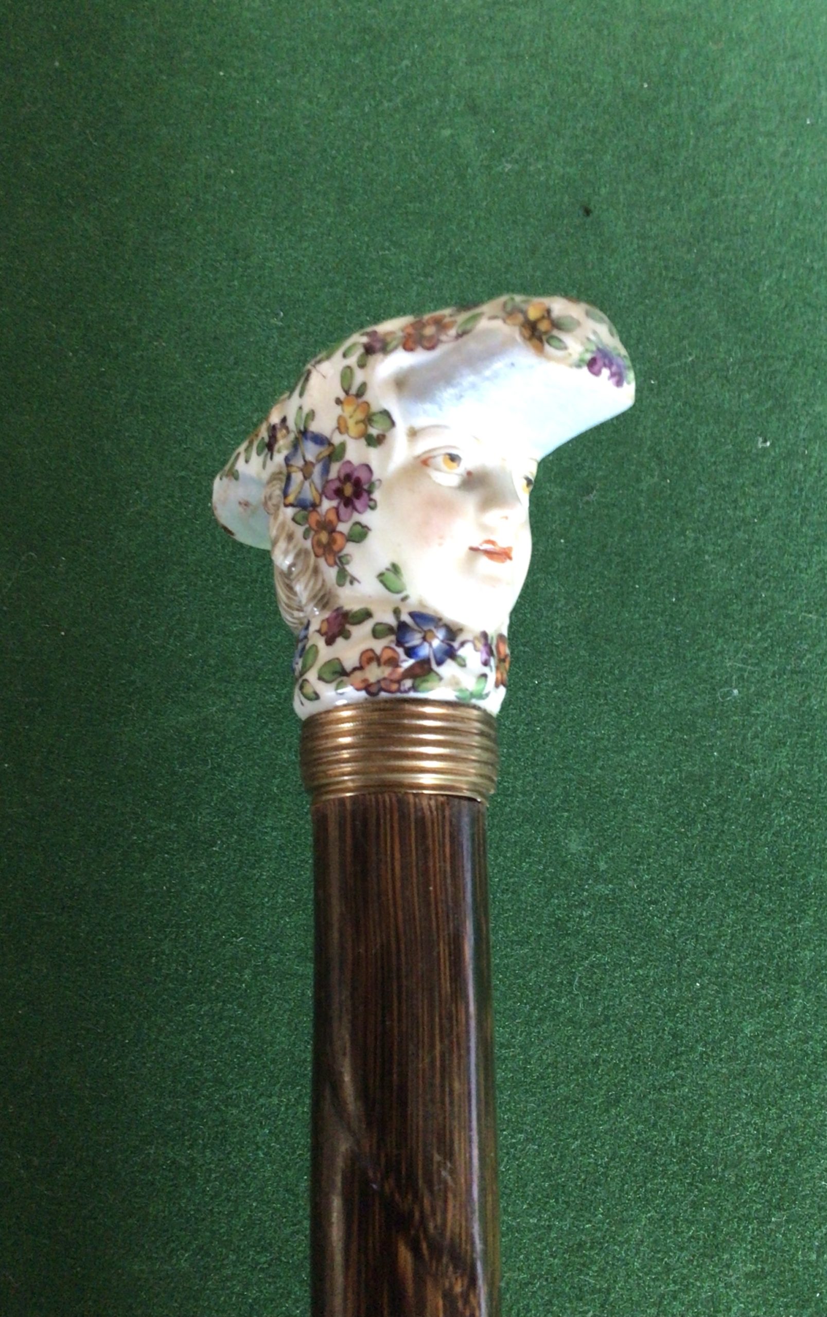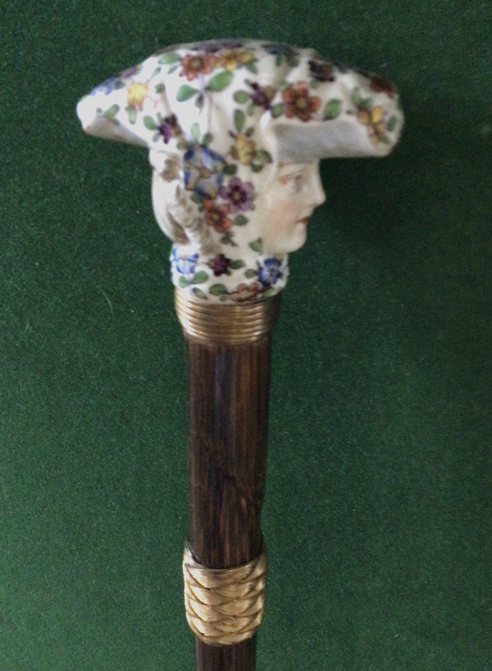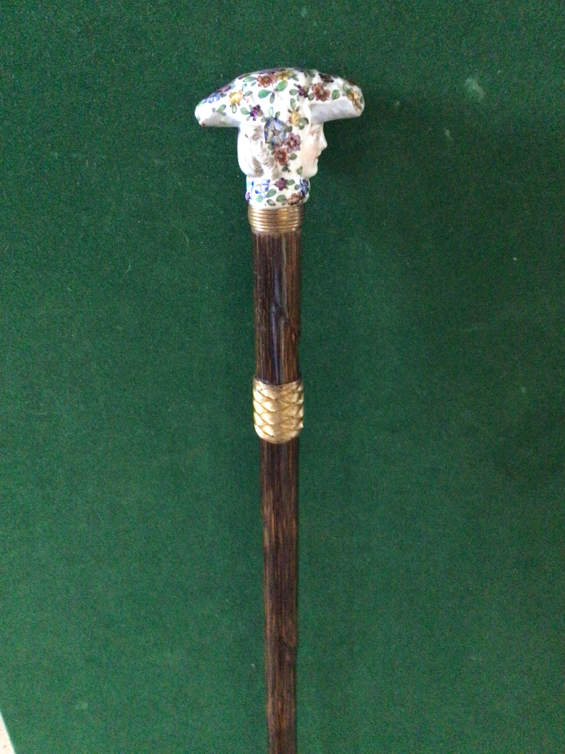 Jolie canne féminine en porcelaine sûrement dû Paris - bague tressée en métal doré et bague sous le pommeau en métal doré - fût en bois exotique dû laurier - férule en fer - début 20 ieme - longueur 86,50 cm