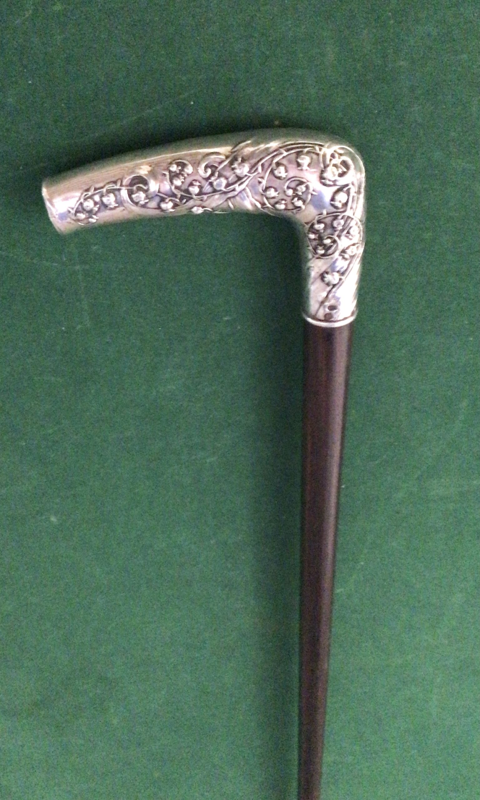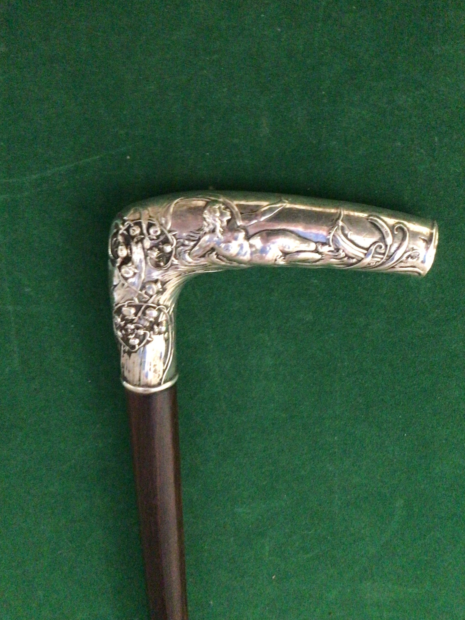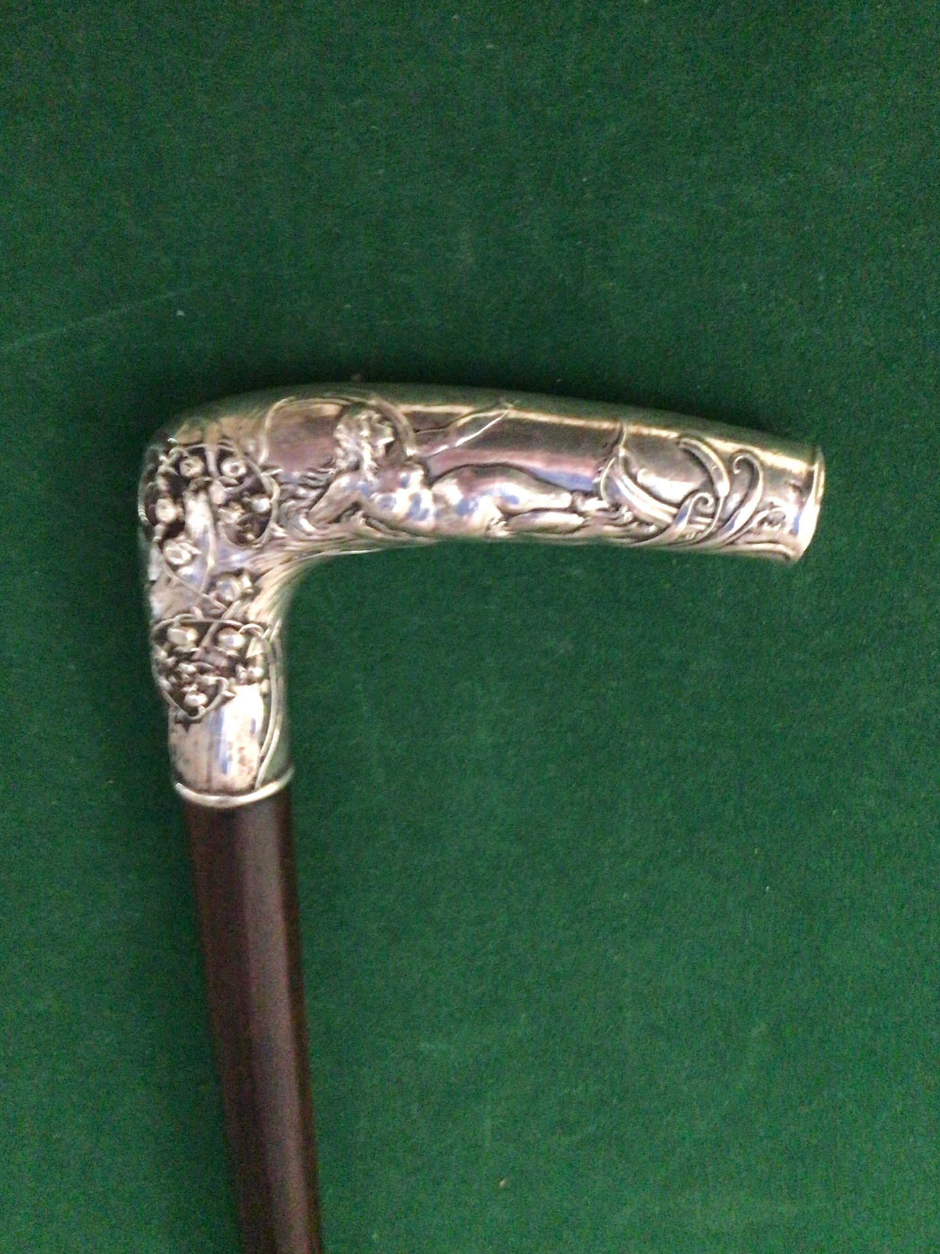 Canne érotique - poignée équerre en argent - décors femme nue allongée avec décors fleuris - fût en bois dur teinté de noir - férule en fer blanc - époque 1900 - longueur 86 cm